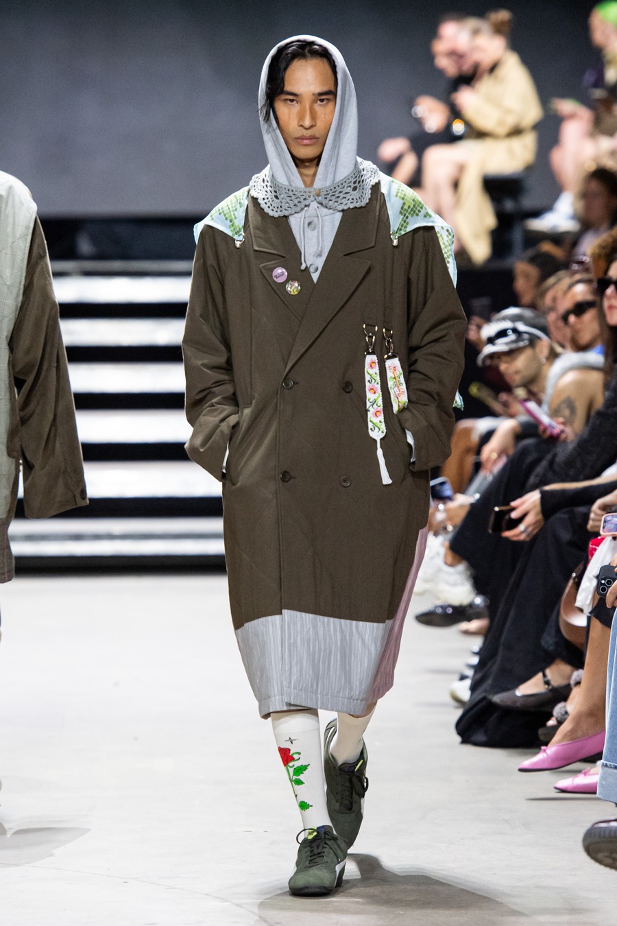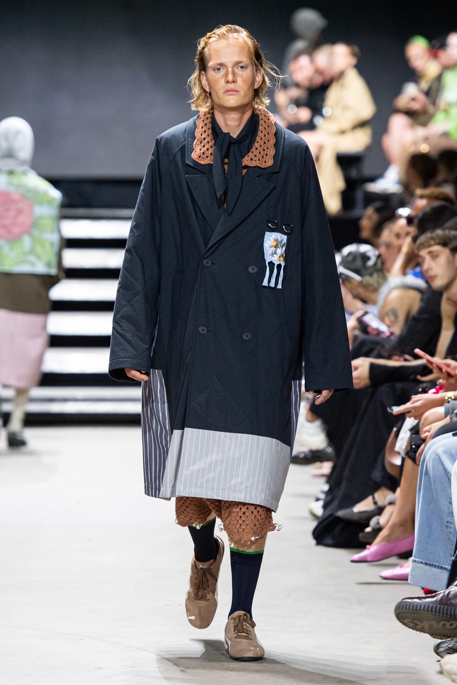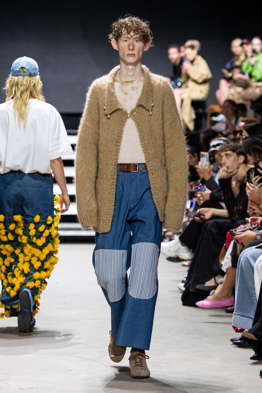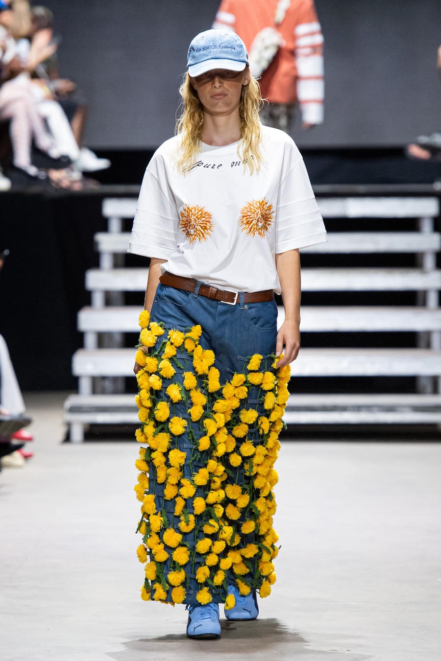 Ekroth reimagines traditional dance attire with a contemporary edge, merging safety with dreamy, hand-painted floral prints and innovative silhouettes. Tailored suits showcase relaxed elegance through sleek lines and subtle details while flowing dresses in airy fabrics capture the romance of a lakeside dance, adorned with hand-painted floral designs. The collection also features handmade lace collars, caps, a hand-knitted macramé bag, and dandelion jeans decorated with 250 handcrafted pendants—each pair requiring over 200 hours to create. Similarly, the bombers are detailed with hand-knitted pendants, adding a distinctive touch of meticulous craftsmanship.