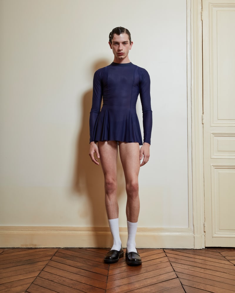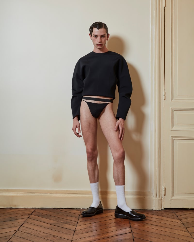 Within this captivating collection, a captivating synergy unfolds: athleticism intertwines with romanticism, daringly challenging the established ideals of masculinity. With an impressive repertoire of 25 distinct looks, Kremer deliberately chose to capture and document this exceptional collection within the personal confines of his apartment, establishing an intimate connection between his designs and his creative process.