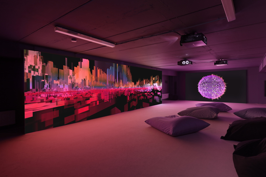 In the third room, you can see the most recent artworks I and my team are producing using Quantum Blur (QB) and the sound program Max/MSP. In the process a 2D digitalised landscape painting is extruded through QB, becoming a topography instead of a flat image, a sort of new 3D artefact. At the entrance to this room, you can see a selection from a series of prints I made in 2021/22 showing aerial shots of the QB landscapes I was developing at the time. Following these there are projected works showing my first explorations into the third dimension – that’s what I’m working on right now. The films allow the visitor to fly through these new worlds. These flights through the QB landscapes are all the more immersive since they are accompanied by the soundscapes by composer Kimin Han. Using his patches he is able to modulate experimental sounds according to the visual parameters of each pixel (hue, saturation, brightness, and height in the QB topography).