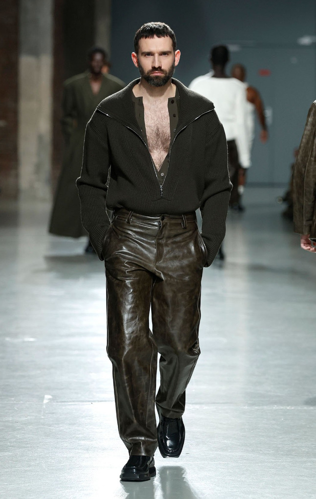 The palette is tight—black, bone, and dark khaki—because who needs neon when your textures are doing the talking? From jacquards that whisper luxury to waxed leather and velvet so smooth it’s ASMR for your eyes, this collection has texture game on lock. Let’s not forget the zippers slashing through like tiny metal swords or the spikes scattered across the latex. It’s giving post-apocalyptic power dressing but makes it freakishly beautiful.