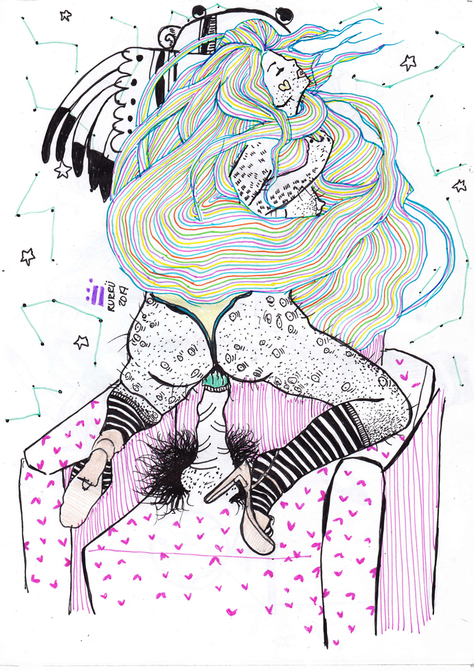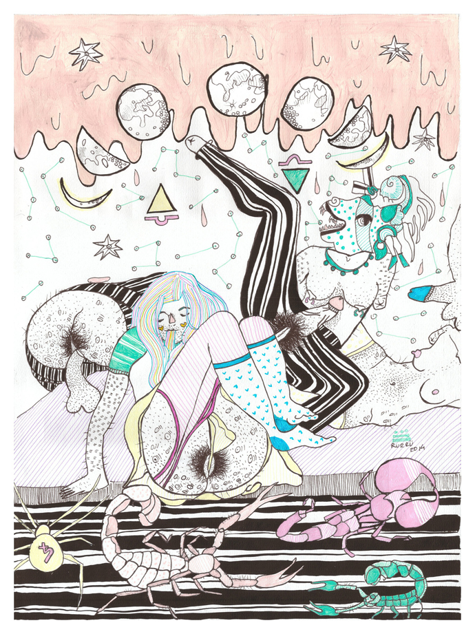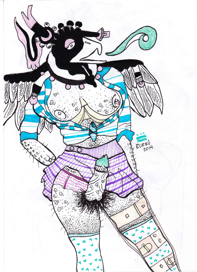 Rurru is a Mexican illustrator based in Berlin. She works a lot with sexual dissidence and gender distinctions in order to fight stereotypes imposed by what people have learned to call “beauty”. Her illustrations are based on representations of she-males and pre-Hispanic deities. The idea is to present the explicit sexuality gradually while addressing it naturally.