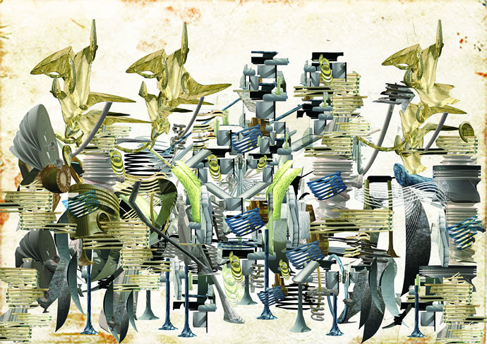 Ryota: I develop and explore a hybrid drawing technique combining both traditional media (ink, acrylic, and graphite) and digital media (algorithmic processing, scripting and image compositing with custom software ).