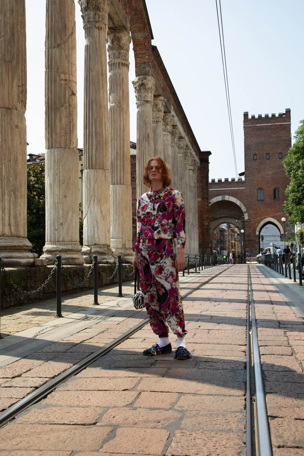 The knitwear was modelled after striped one-piece swimsuits from the ’30s. The pieces break, they tear up until they become tops, shorts and pencil skirts made of thousands of coloured stripes that resemble upholstery fabric samples that spread out like a rainbow onto the genderless trenches, as well. Souvenir t-shirts paired with sand-coloured tailored suits decorated with pen graffiti, silicone, deconstructed and de-structured. Silk-like floral jumpsuits are reminiscent of the ’90s. I wanted to replicate the spontaneity of those who disinterestedly combine contrasting patterns and fabrics to reach comfortability, to be able to walk, get dirty and sweat in between a museum visit and the following one.”