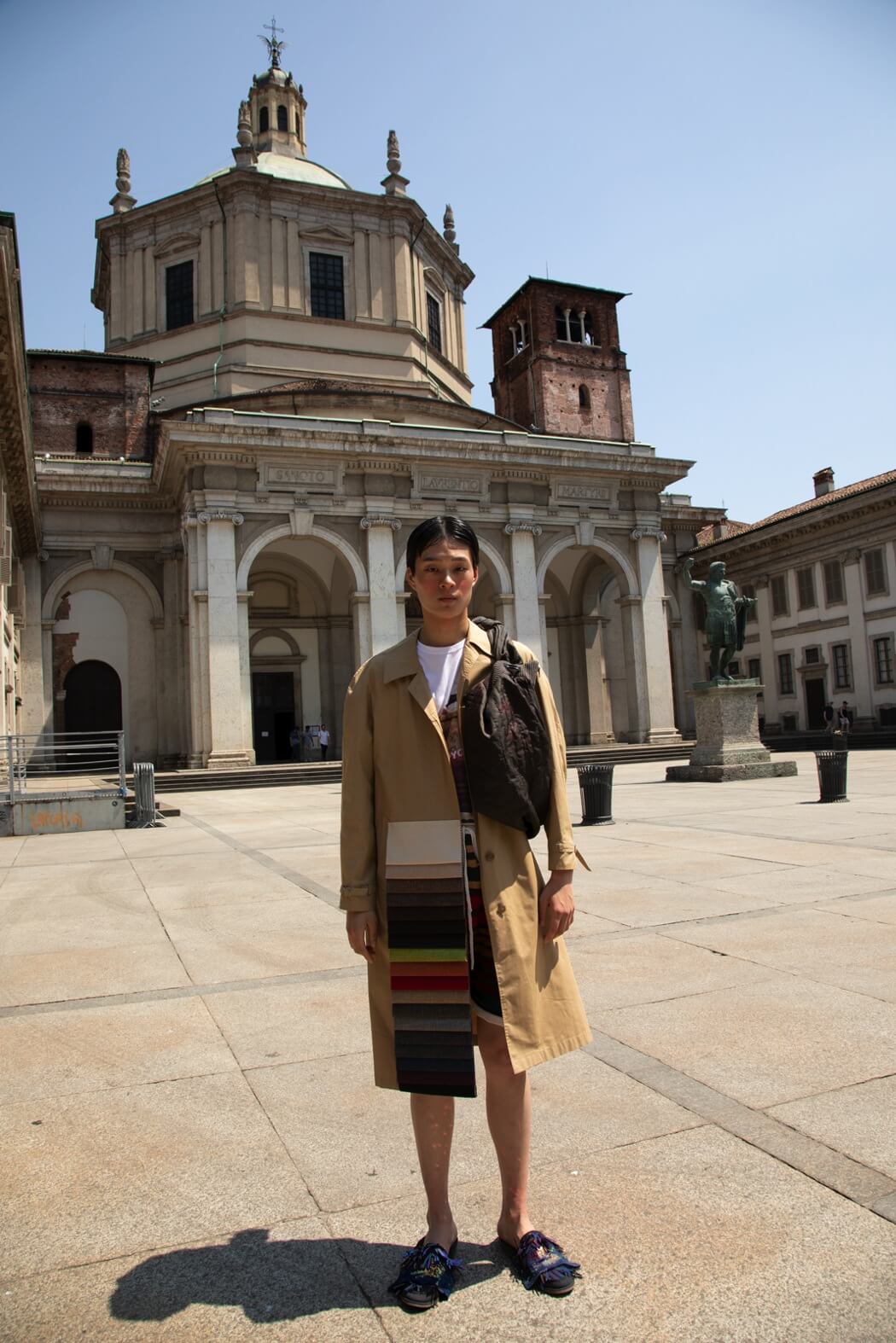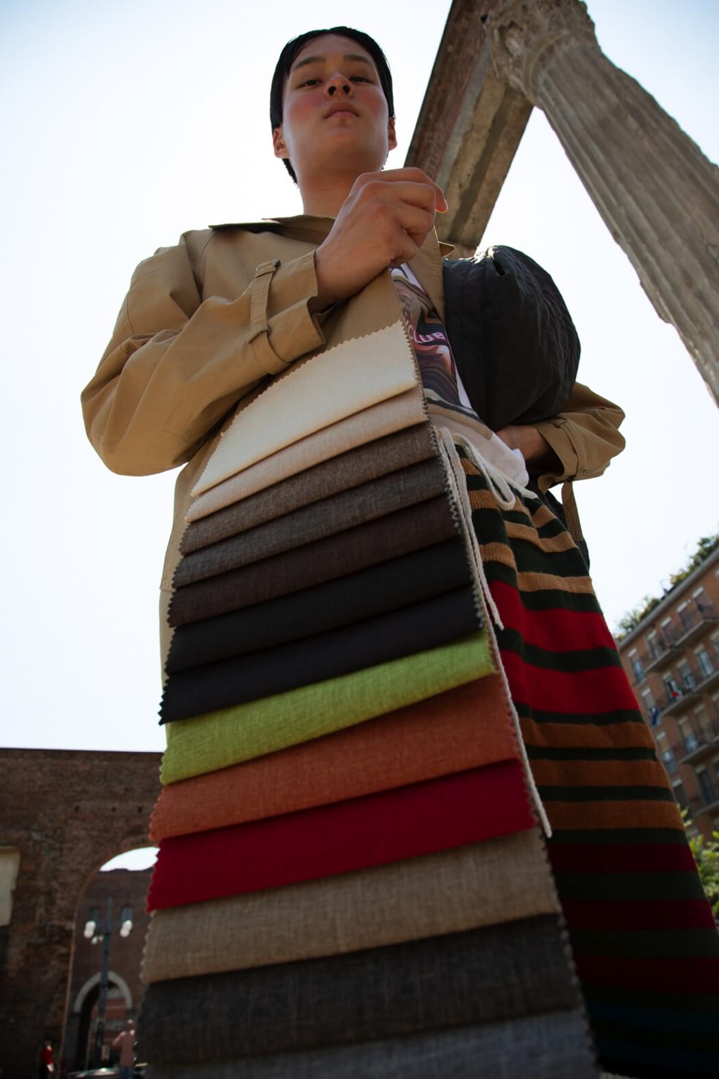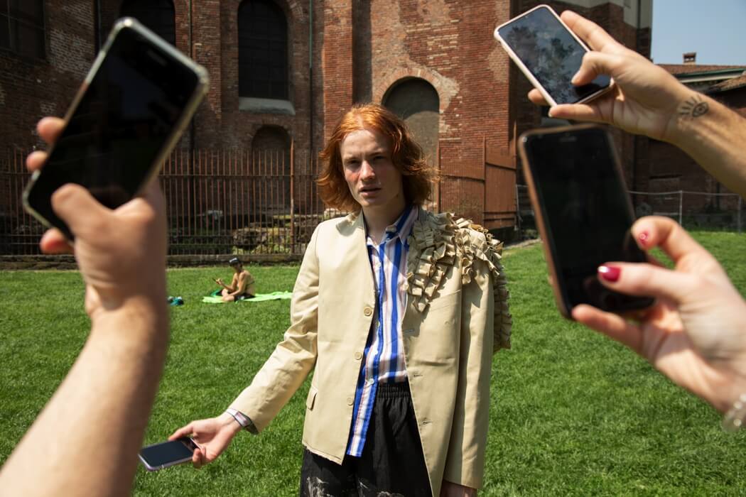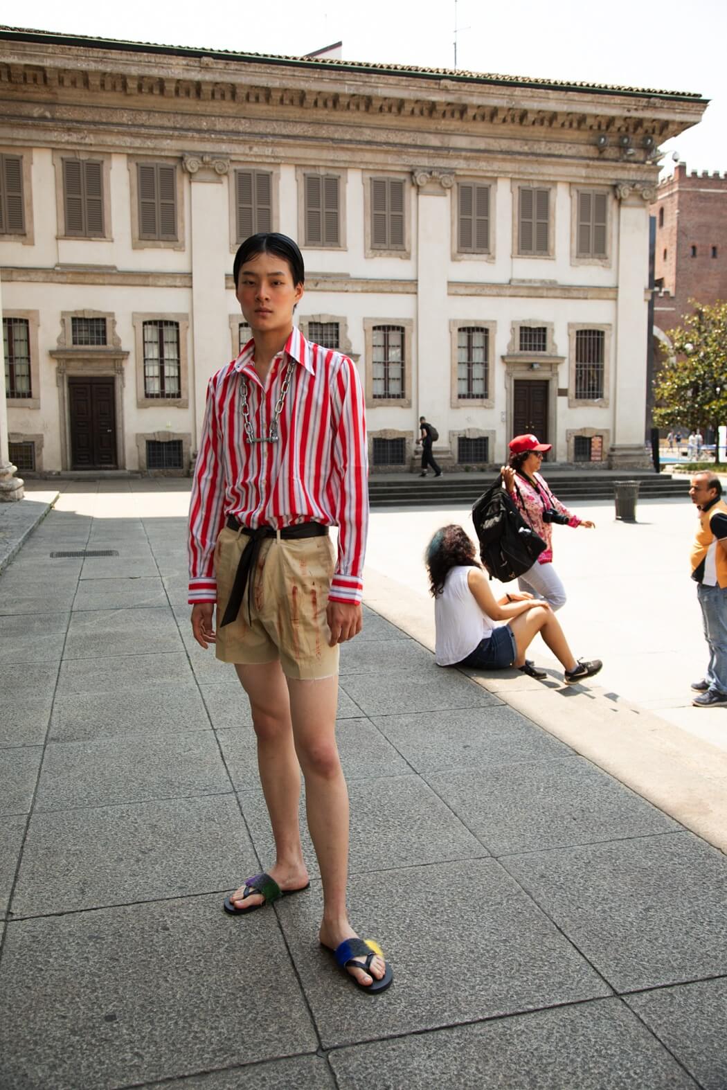 The knitwear was modelled after striped one-piece swimsuits from the ’30s. The pieces break, they tear up until they become tops, shorts and pencil skirts made of thousands of coloured stripes that resemble upholstery fabric samples that spread out like a rainbow onto the genderless trenches, as well. Souvenir t-shirts paired with sand-coloured tailored suits decorated with pen graffiti, silicone, deconstructed and de-structured. Silk-like floral jumpsuits are reminiscent of the ’90s. I wanted to replicate the spontaneity of those who disinterestedly combine contrasting patterns and fabrics to reach comfortability, to be able to walk, get dirty and sweat in between a museum visit and the following one.”