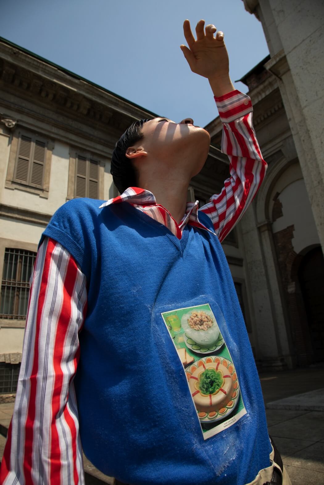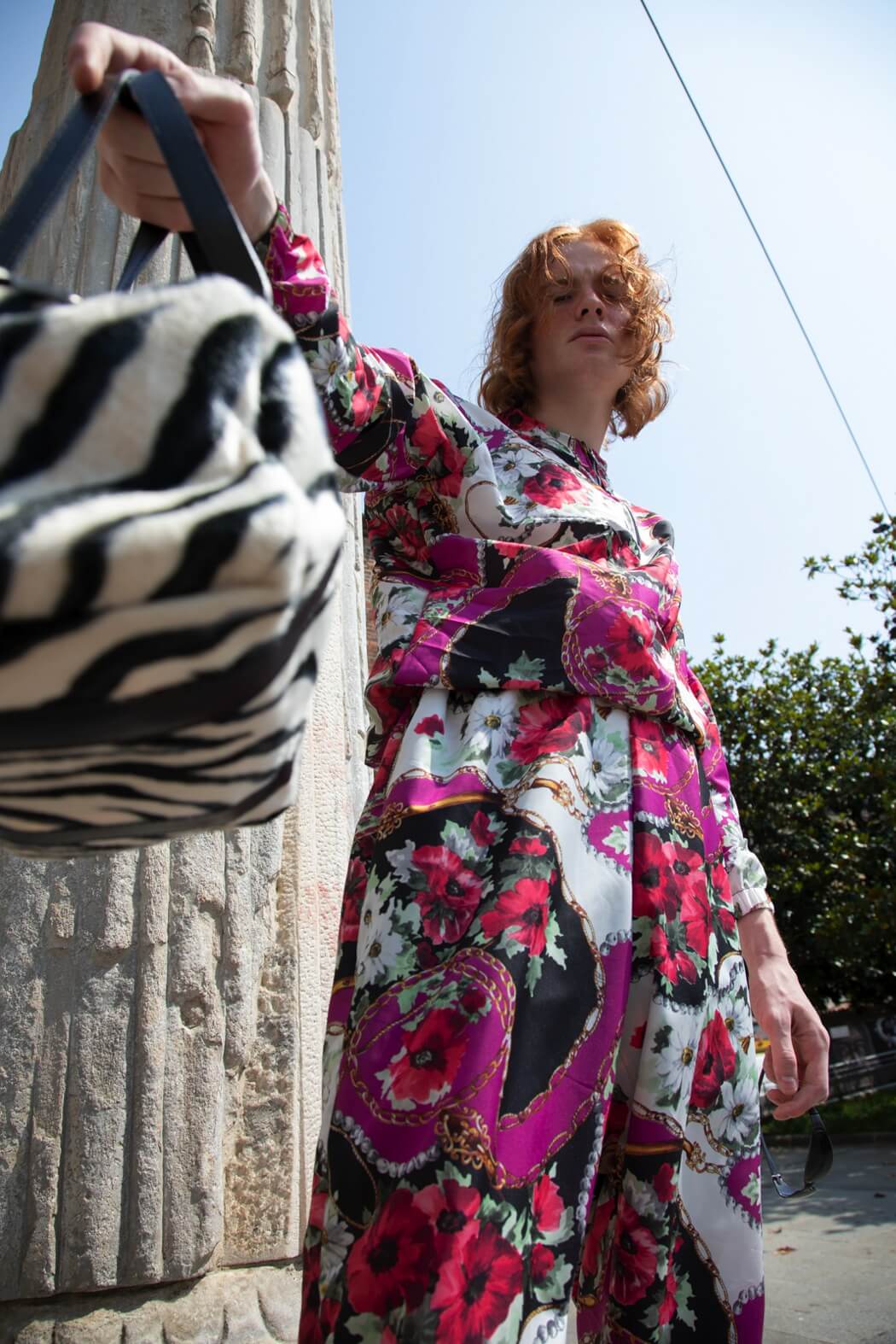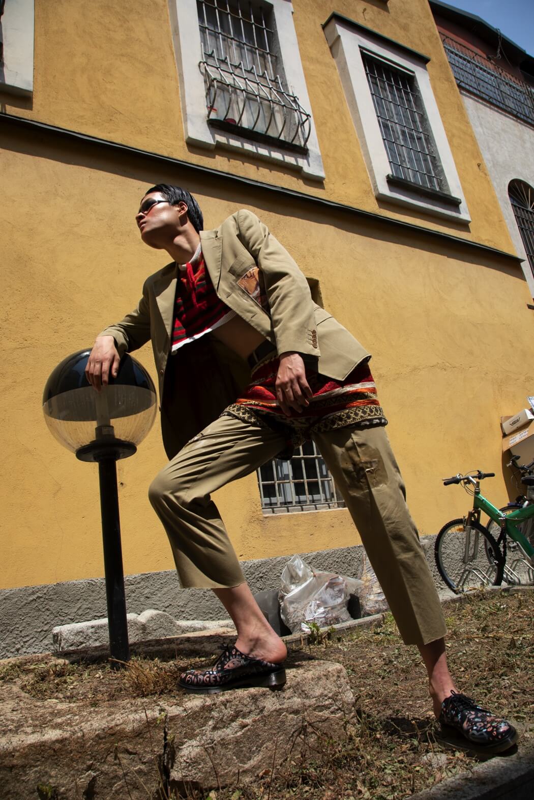 The knitwear was modelled after striped one-piece swimsuits from the ’30s. The pieces break, they tear up until they become tops, shorts and pencil skirts made of thousands of coloured stripes that resemble upholstery fabric samples that spread out like a rainbow onto the genderless trenches, as well. Souvenir t-shirts paired with sand-coloured tailored suits decorated with pen graffiti, silicone, deconstructed and de-structured. Silk-like floral jumpsuits are reminiscent of the ’90s. I wanted to replicate the spontaneity of those who disinterestedly combine contrasting patterns and fabrics to reach comfortability, to be able to walk, get dirty and sweat in between a museum visit and the following one.”