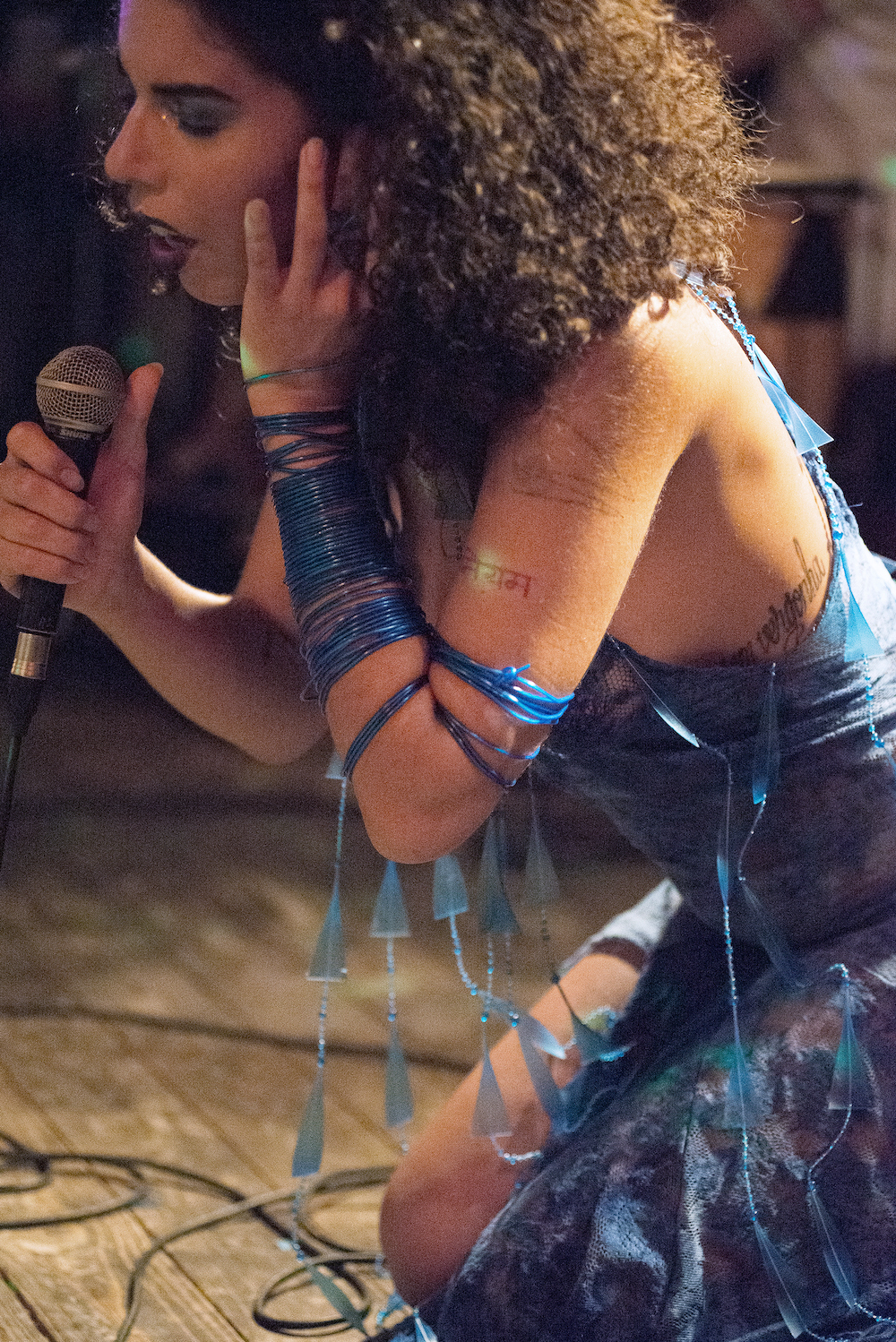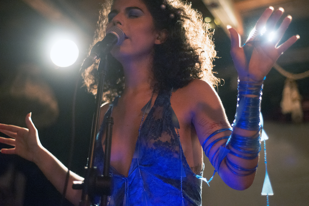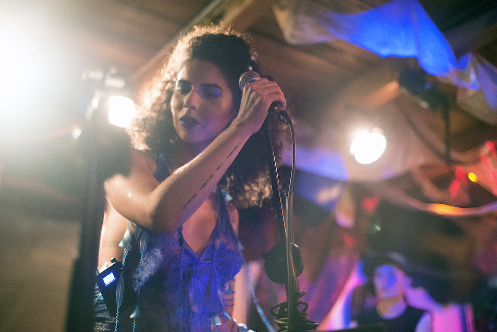 A recording of Afro-Brazilian ritual songs preceded the band taking to the stage, but despite such auspicious beginnings, it was a performance plagued with technical difficulties. Most people come to Klunkerkranich to sit in the rooftop garden at sunset and gaze across its unique South-of-the-river view. Yet, on this hot late August night Sanni’s band was squeezed onto a small stage indoors between the bar and the queue for the kitchen. Trouble with feedback and monitoring further compromised her sound, while the stage arrangement meant most of the band played in the dark. Even Sanni’s dress, blue and draped in rattling beads, seemed to give her trouble. A ‘Cyber Yemanjá creation’ made by the visual artists Tina Escarlatina and Camila Roriz, it evokes a Yoruba feminine water deity, often depicted as a mermaid—an iconic figure for transgender people. Jean Battirolla did Sanni’s make-up, emphasising the attention to detail that is a testament to Sanni’s professionalism and ambitions. So while it was disappointing not to see her show reach its full potential, I was impressed how Sanni’s confidence and stage presence never waned. Her band seemed to be enjoying the night and this sense of fun in spite of setbacks was infectious.