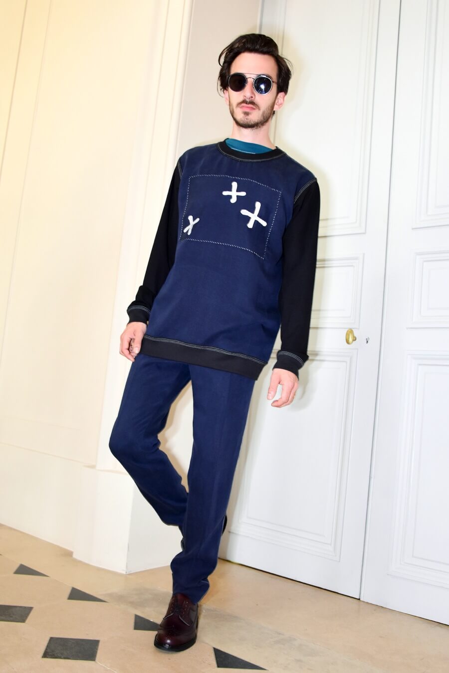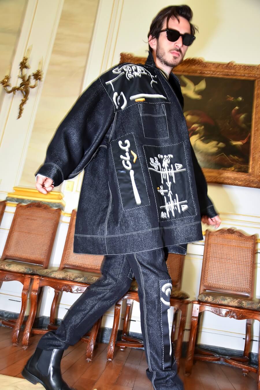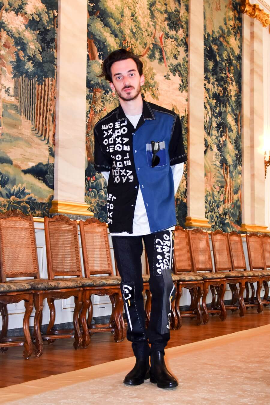 Embroidery is inspired by the graphic lettering on the streets of Paris and refers to the work of the Romanian French poet and artist Isidore Isou. Seams and hand stitched finishings are made visible and treated as embellishments. Pattern parts are emphasized by a contrasting use of material and prints. Construction processed as decoration.