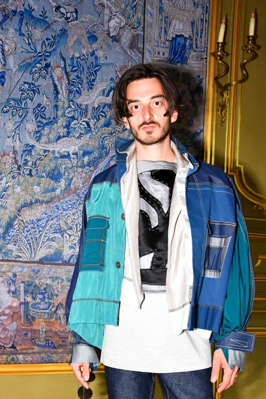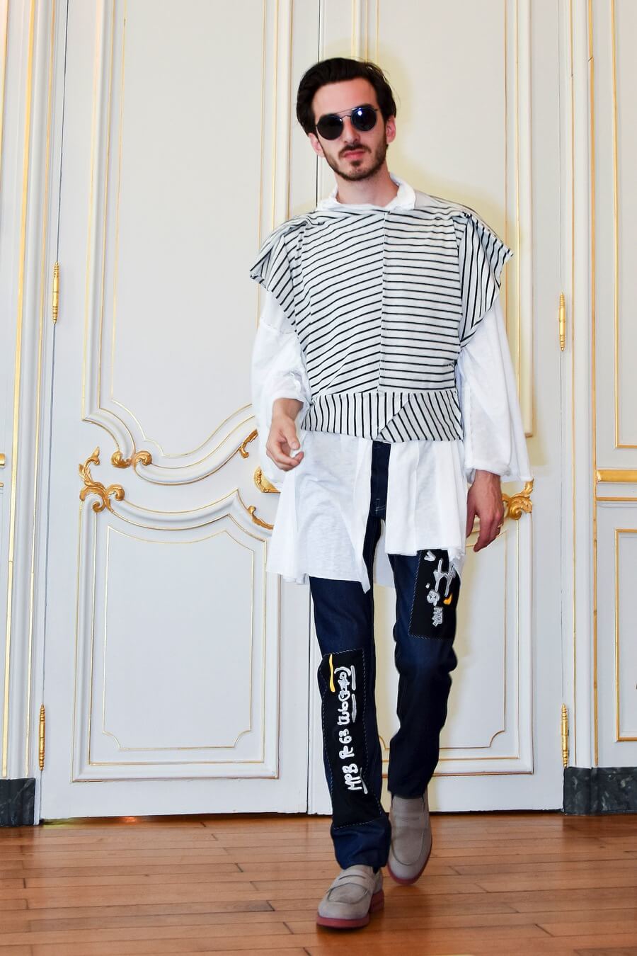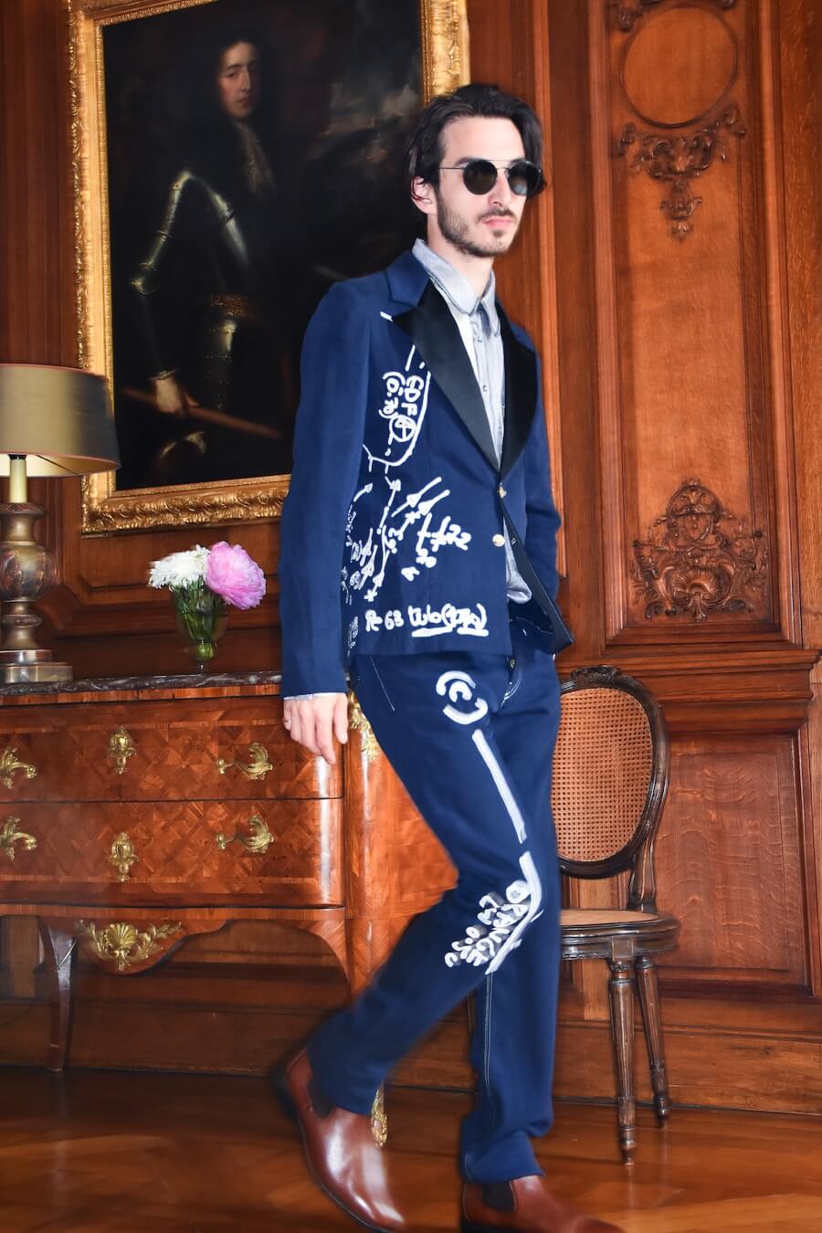 Embroidery is inspired by the graphic lettering on the streets of Paris and refers to the work of the Romanian French poet and artist Isidore Isou. Seams and hand stitched finishings are made visible and treated as embellishments. Pattern parts are emphasized by a contrasting use of material and prints. Construction processed as decoration.