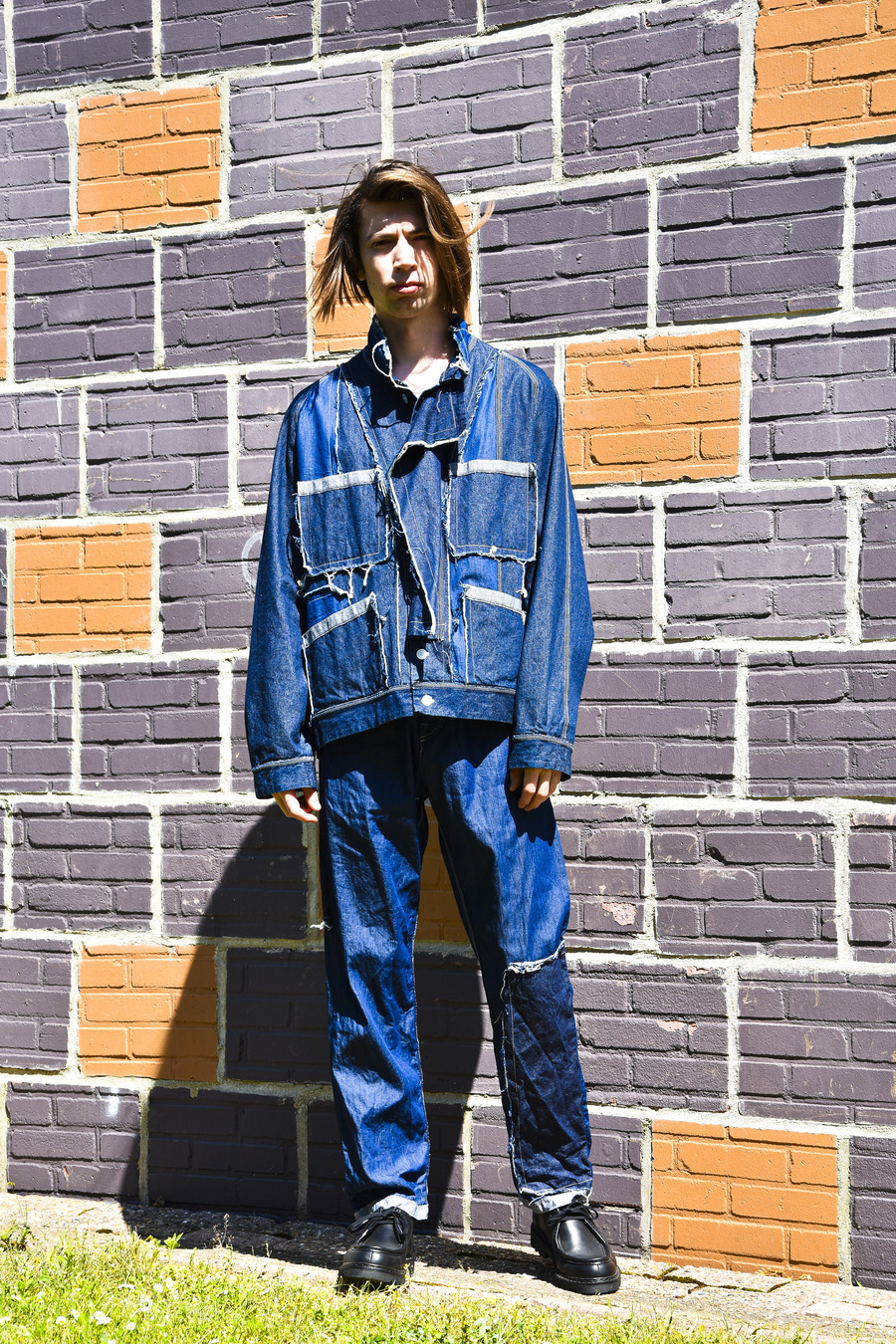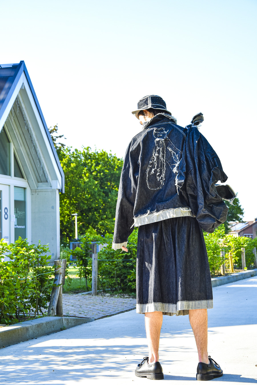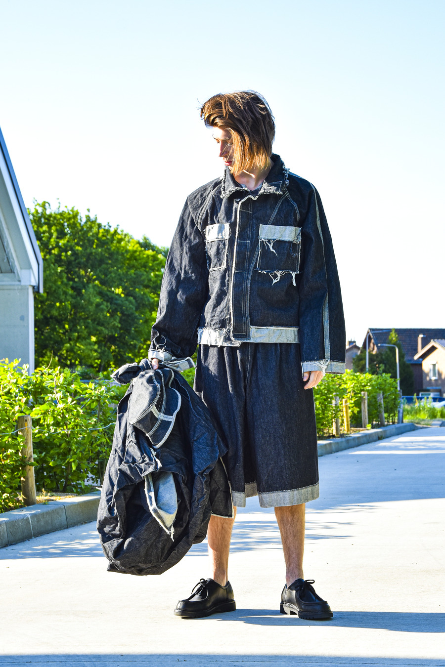 The standout pieces in this collection are the unique Dutch woven denim, crafted from recycled fibres. The brand also presents voluminous overshirts/dresses and oversized skirt-like culottes in both short and long variations, perfectly complemented by the signature boxy workwear jackets and handcrafted ravelled patchwork details.