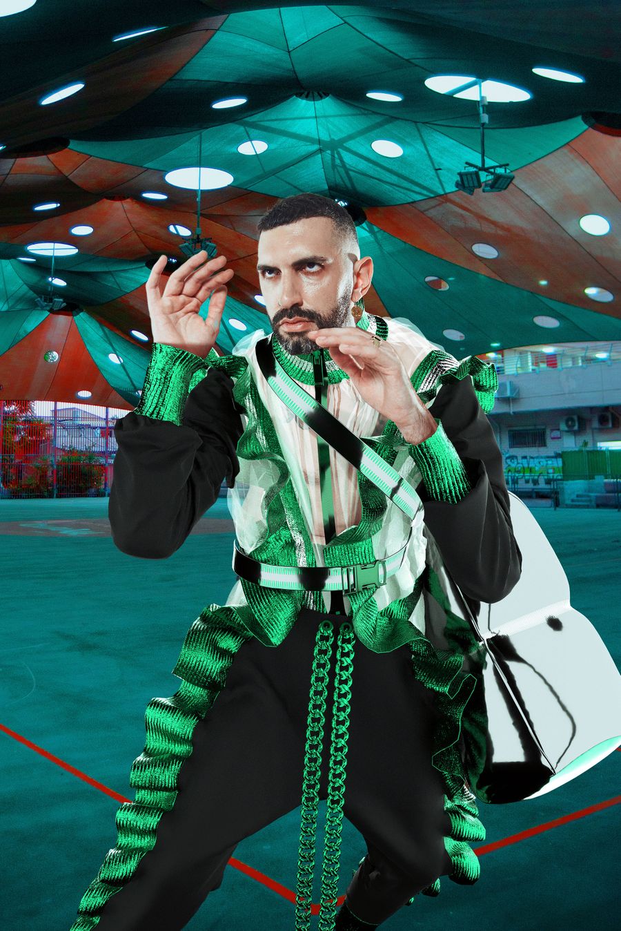 This collection is all about playing a stigmatized game between the white European culture representing the establishment and tradition of the fashion world, and the characters from David’s family, neighborhood and the cultures they bring with them from the empires of the Middle East and North Africa. The goal in this collection is to consciously “Act-Hood” and sanctify mixing and blurring between all of these without regard to the establishment and its traditions.