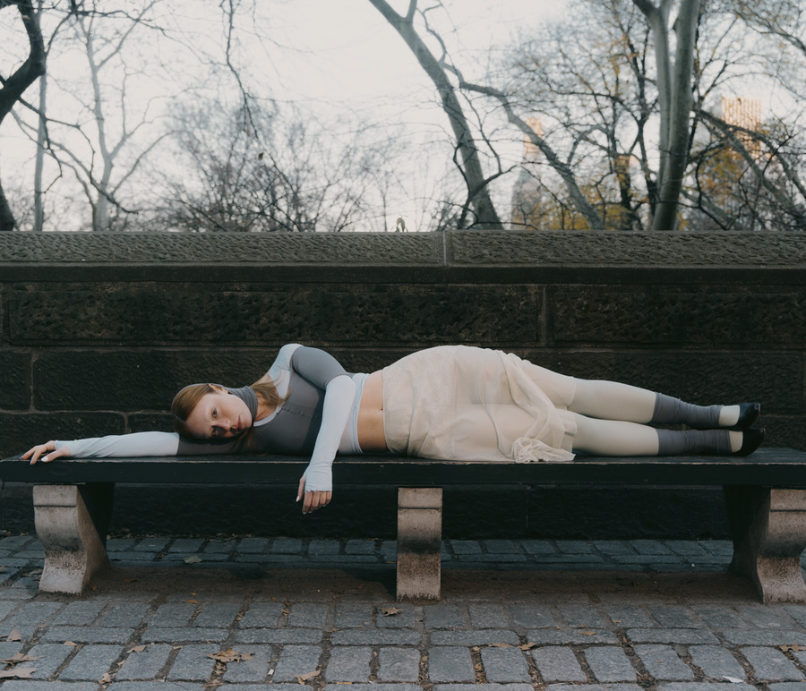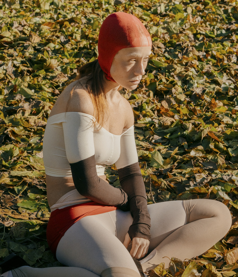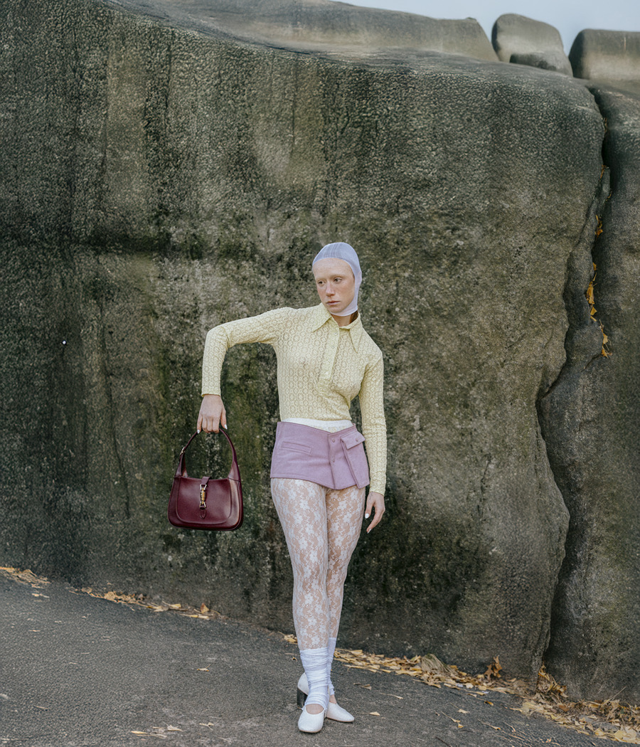 A KALTBLUT exclusive editorial. Photography by Joao Lutz. The model is Mariana Bauer. Styling by Vivien Hackenhaar using Paloma Wool, Gucci, Proenza Schouler, Fendi, Jil Sander, Frankie Shop, Sergio Rossi. This editorial series explores the interplay of layered coloured tights to create unexpected shapes and silhouettes. By cutting, modifying, and combining these pieces, we reimagine how the body can be framed and adorned, challenging traditional notions of fashion. The juxtaposition of bright textiles against an autumnal backdrop amplifies the vivid colour palette, resulting in a dreamlike, avant-garde aesthetic that merges art and style.