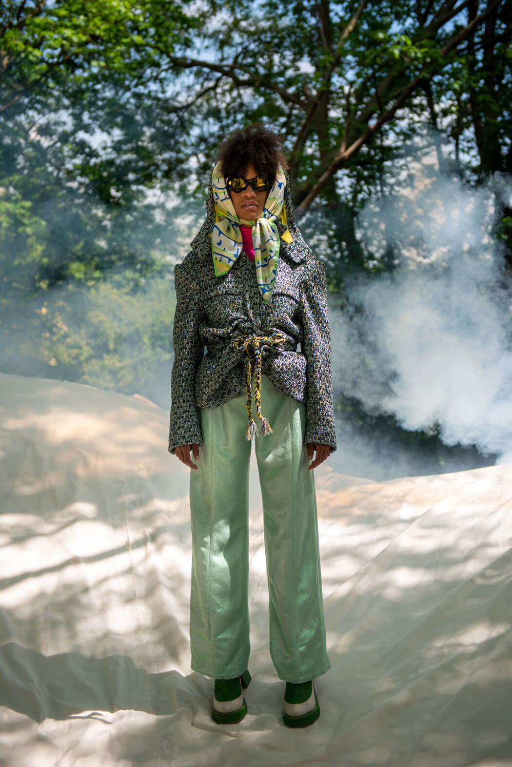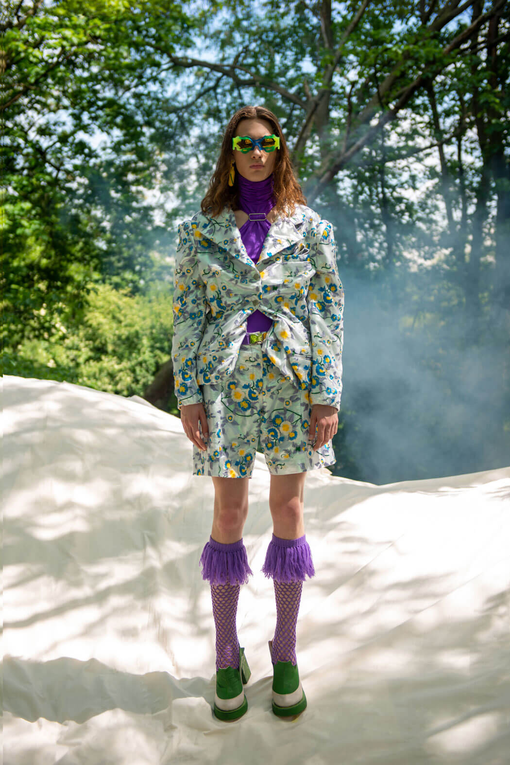 “See you in the fog” is set at a summer night rave in a forest outside of Stockholm. It is referencing the teenage fear of not fitting into an adult world, and their attempts to adapt and finding out who they are. The results are silhouettes that are glamorous and fabulous and celebrating individuality and self-love. It deals with a world of opposing contrasts, where natural rawness meets artificiality, tradition juxtaposes new social norms and trash left at a party contrasts new ways of preserving nature.