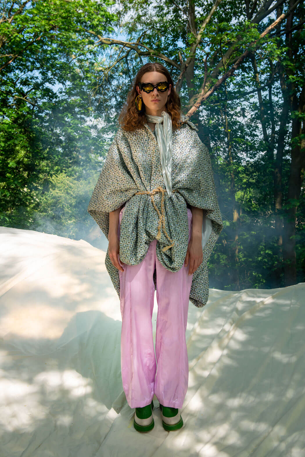 “See you in the fog” is set at a summer night rave in a forest outside of Stockholm. It is referencing the teenage fear of not fitting into an adult world, and their attempts to adapt and finding out who they are. The results are silhouettes that are glamorous and fabulous and celebrating individuality and self-love. It deals with a world of opposing contrasts, where natural rawness meets artificiality, tradition juxtaposes new social norms and trash left at a party contrasts new ways of preserving nature.