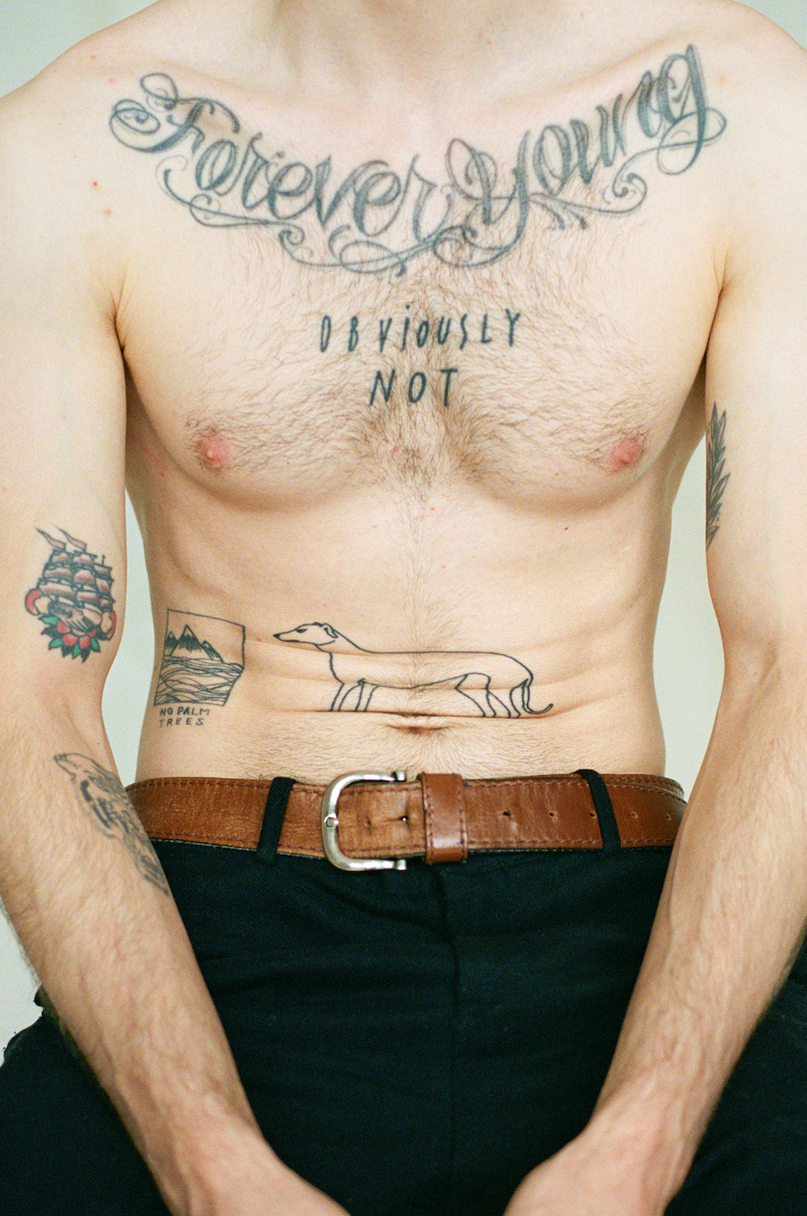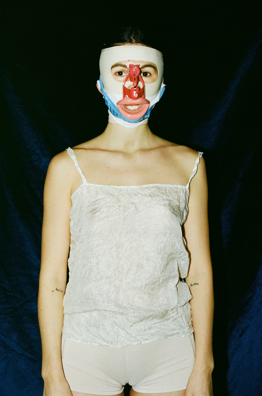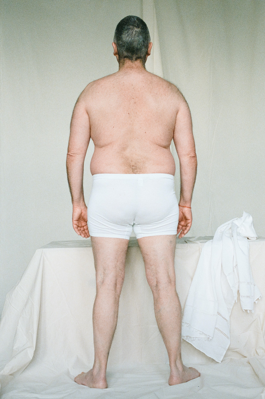 The photographic stagings break a compulsion, born of shame and physical insecurity, in order to loosen the shackles of one’s own ragging.