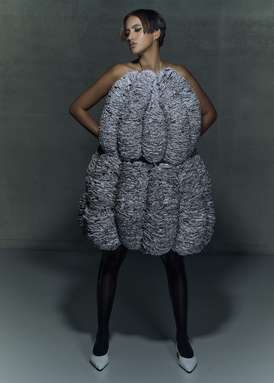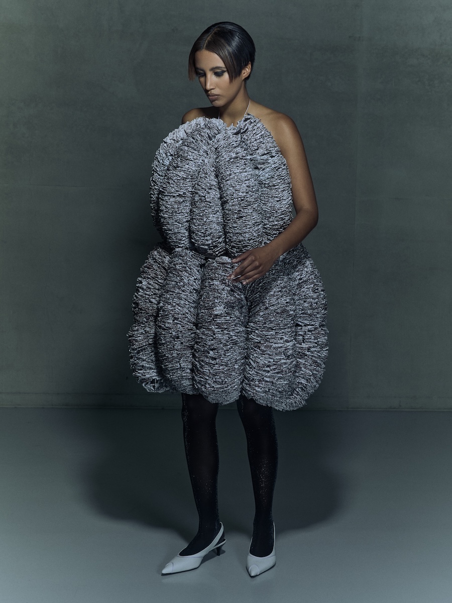The idea for the project grew from a personal observation. At 14, Noam worked a first job at a cash register and was struck by the amount of receipt paper discarded every single day – small slips that no one needed, yet everyone received. Years later, these overlooked objects became the material for a statement piece.