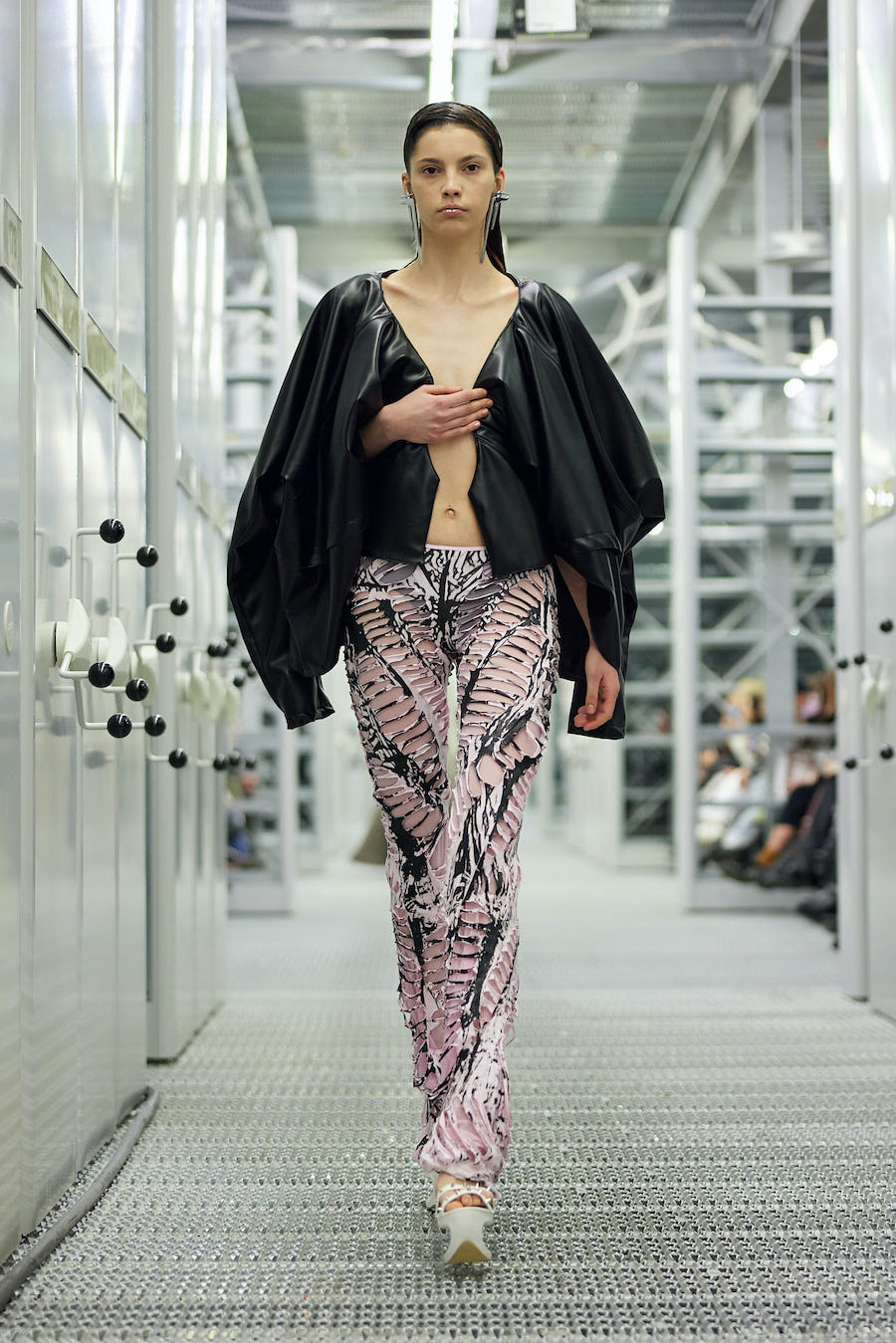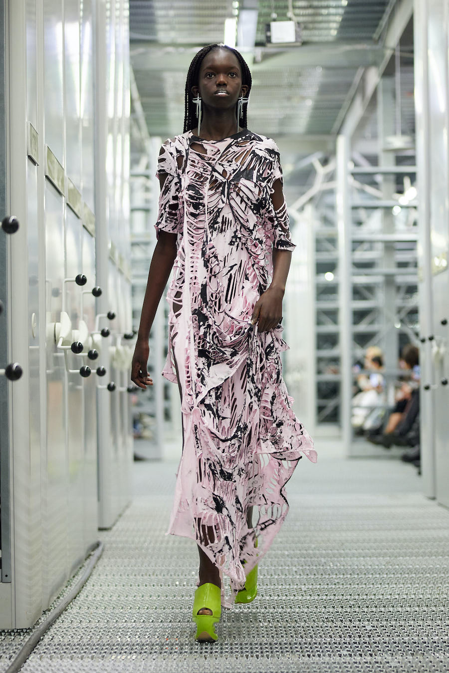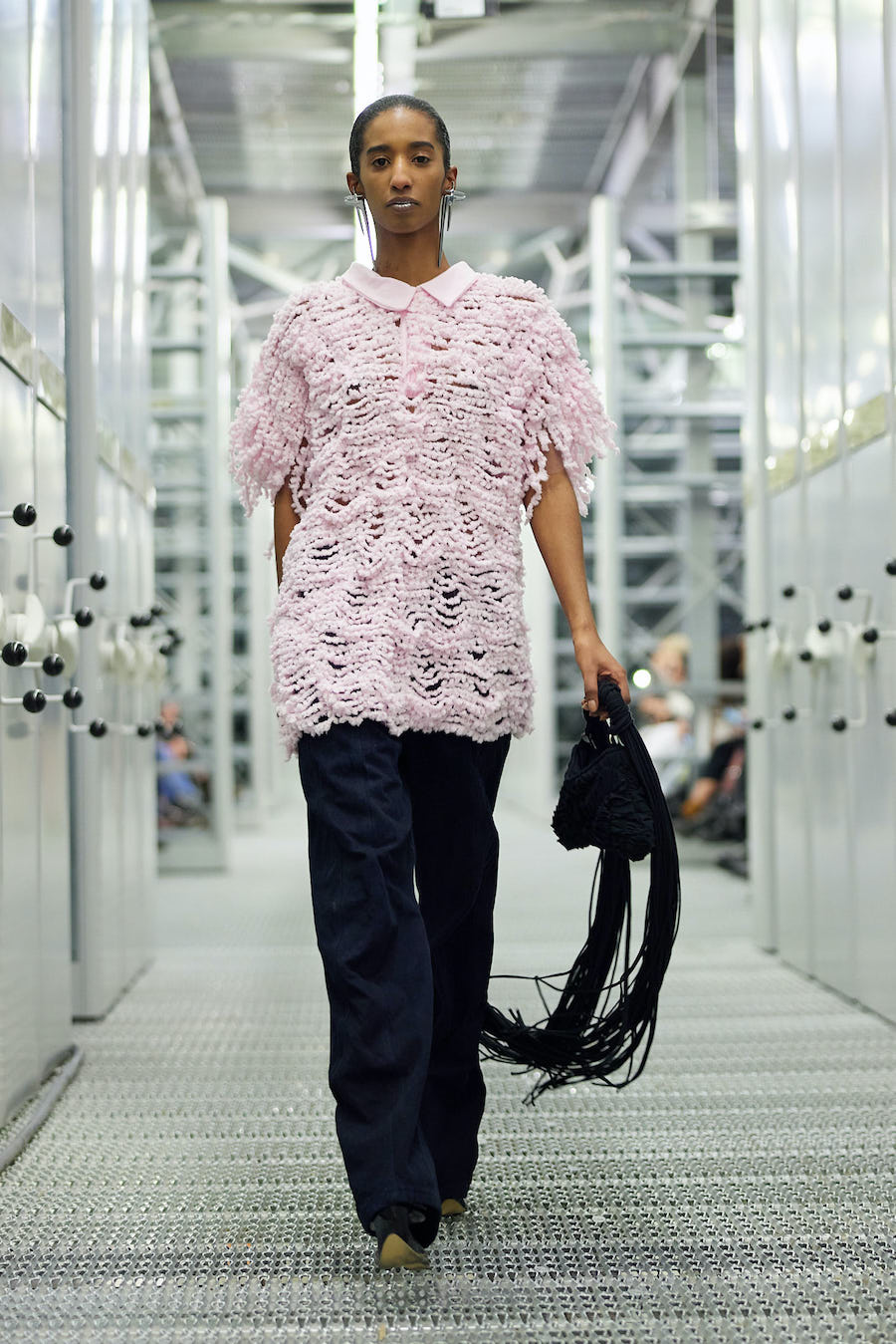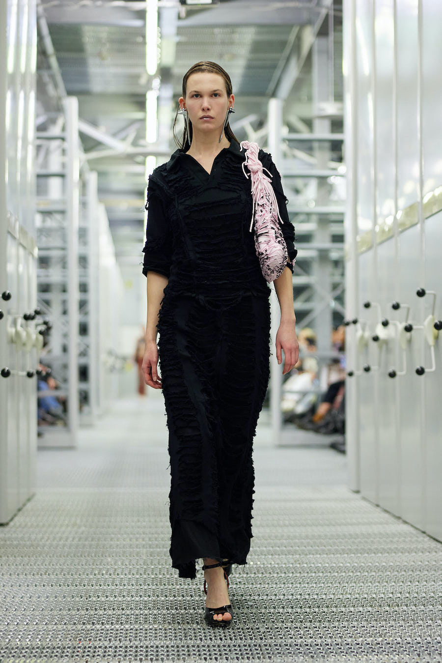 Fascinated by unusual textiles and silhouettes, the designer has always found “beauty in the whimsical and the strange.” This season, she found inspiration in Nordic myths and ancient folktales, which meet hardcore futurism for Fall/Winter 2023. Exploring opposing forces, she explores the dynamics of minimalism and maximalism. She lets deconstructed elements meet bold, unique shapes and harmonizes opposites. Alongside dresses, tops and lots of knits, partly hybrid structures and a range of different textures contrast with smooth silhouettes. In addition, bright colours are combined with austere shawl black.