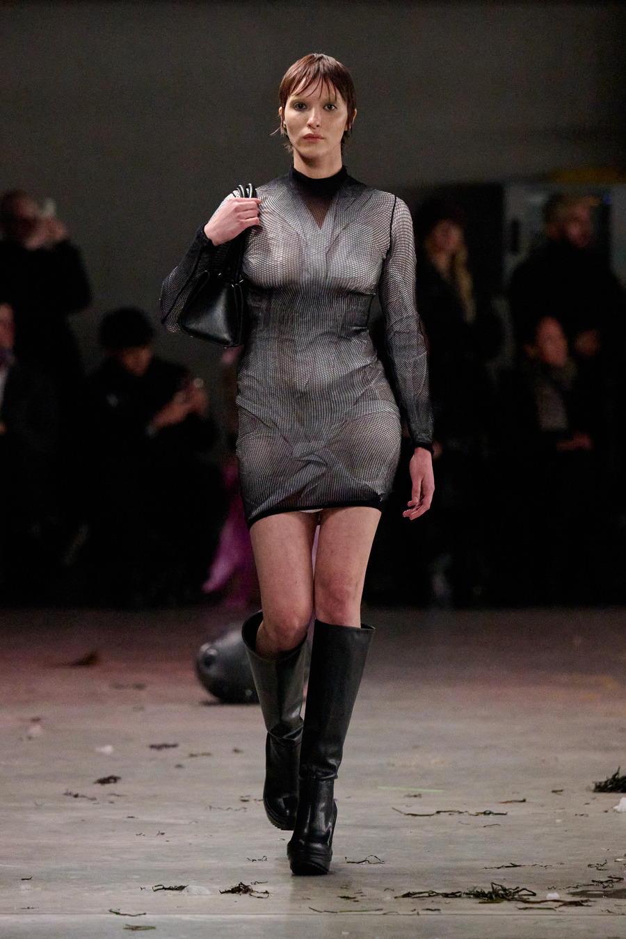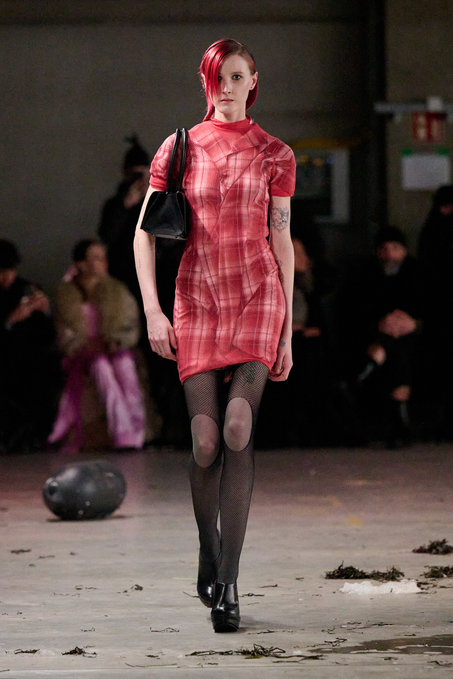 This season’s offerings include structured silhouettes with distinct elements, showcasing rich textures that convey a sense of seduction. The collection incorporates details that blend fantasy with tangible reality, featuring fitted fishnet stockings, modern interpretations of classic workwear, and nods to traditional fisherman’s plaid, along with textured knits and innovative adaptations of jersey garments.