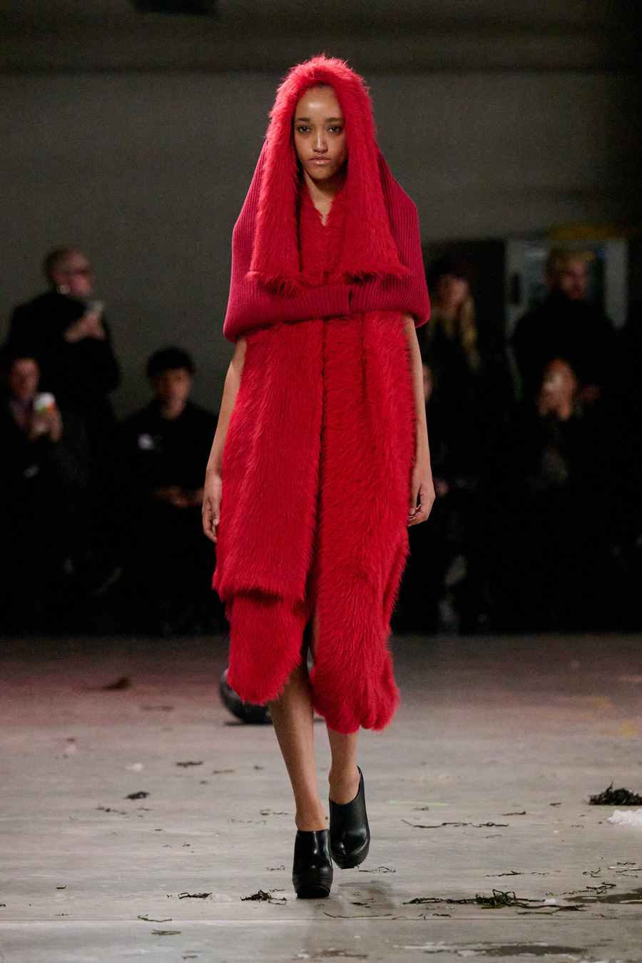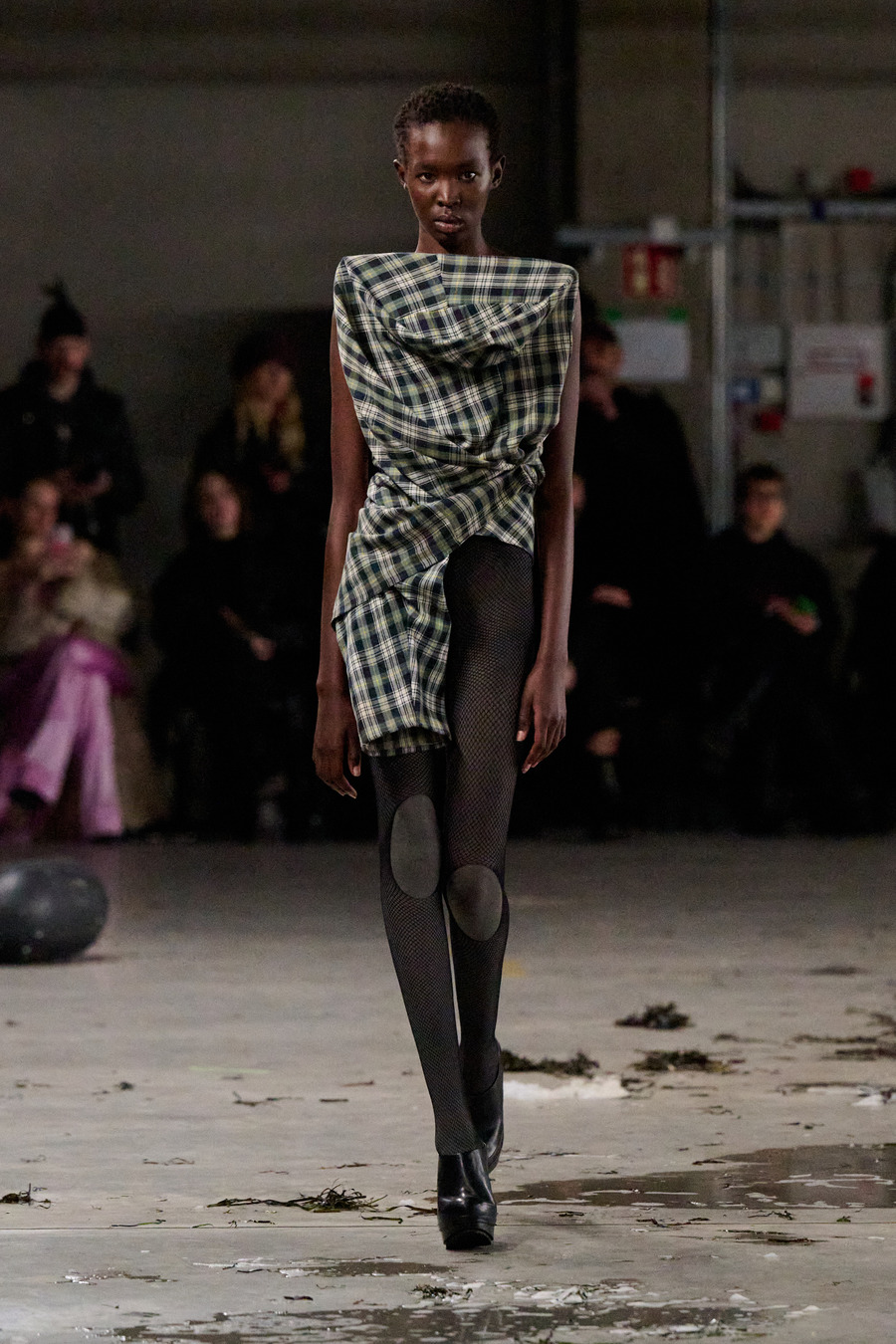 This season’s offerings include structured silhouettes with distinct elements, showcasing rich textures that convey a sense of seduction. The collection incorporates details that blend fantasy with tangible reality, featuring fitted fishnet stockings, modern interpretations of classic workwear, and nods to traditional fisherman’s plaid, along with textured knits and innovative adaptations of jersey garments.