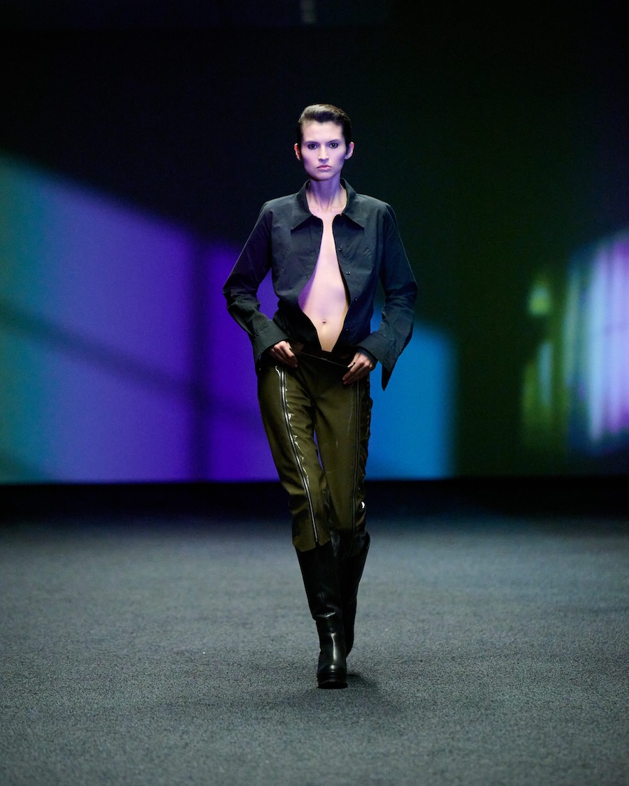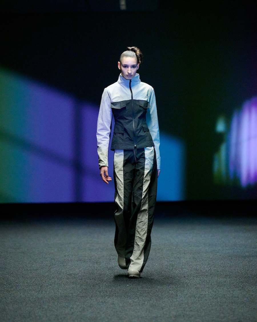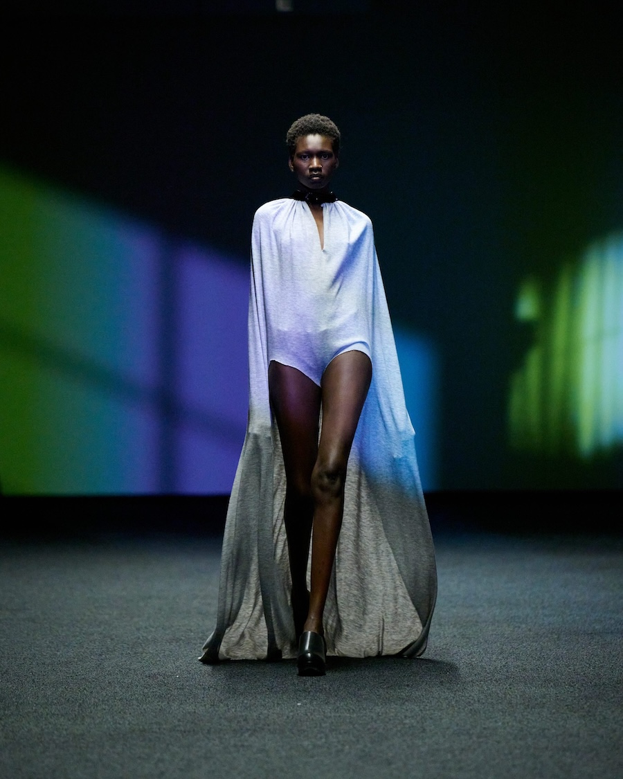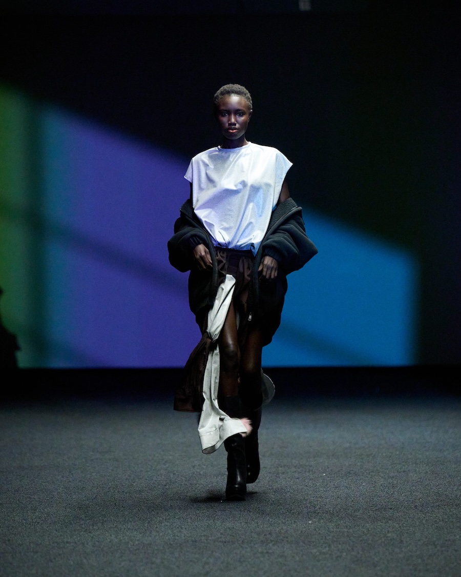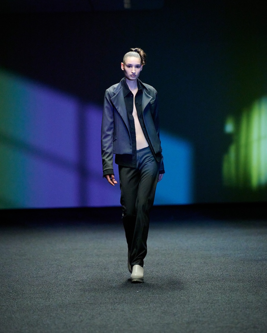 The materials and construction reflect this evolution. Layering is a central theme, offering garments that both conceal and reveal, designed to adapt to the body’s movements. Workwear influences are reinterpreted through sculptural tailoring alongside fluid jersey, mesh, and textured surfaces. The colour palette is industrial at its core, accented by highlights of shine and contrasting elements.