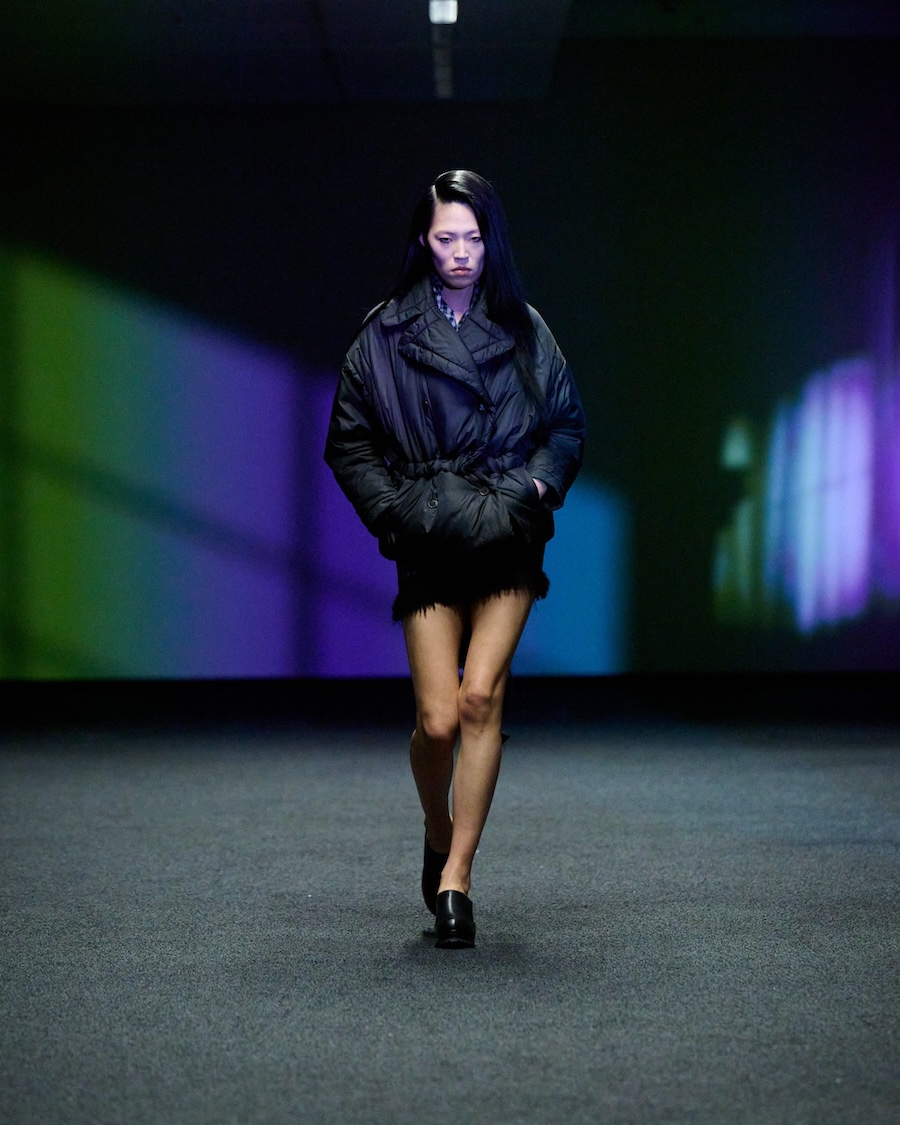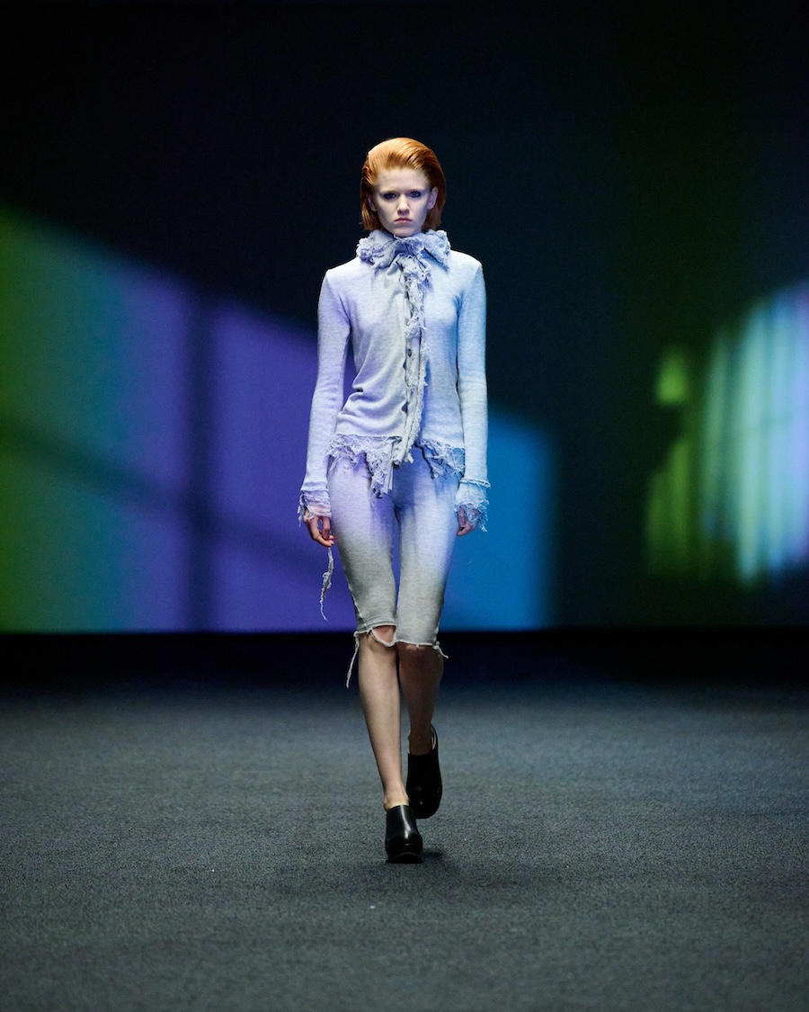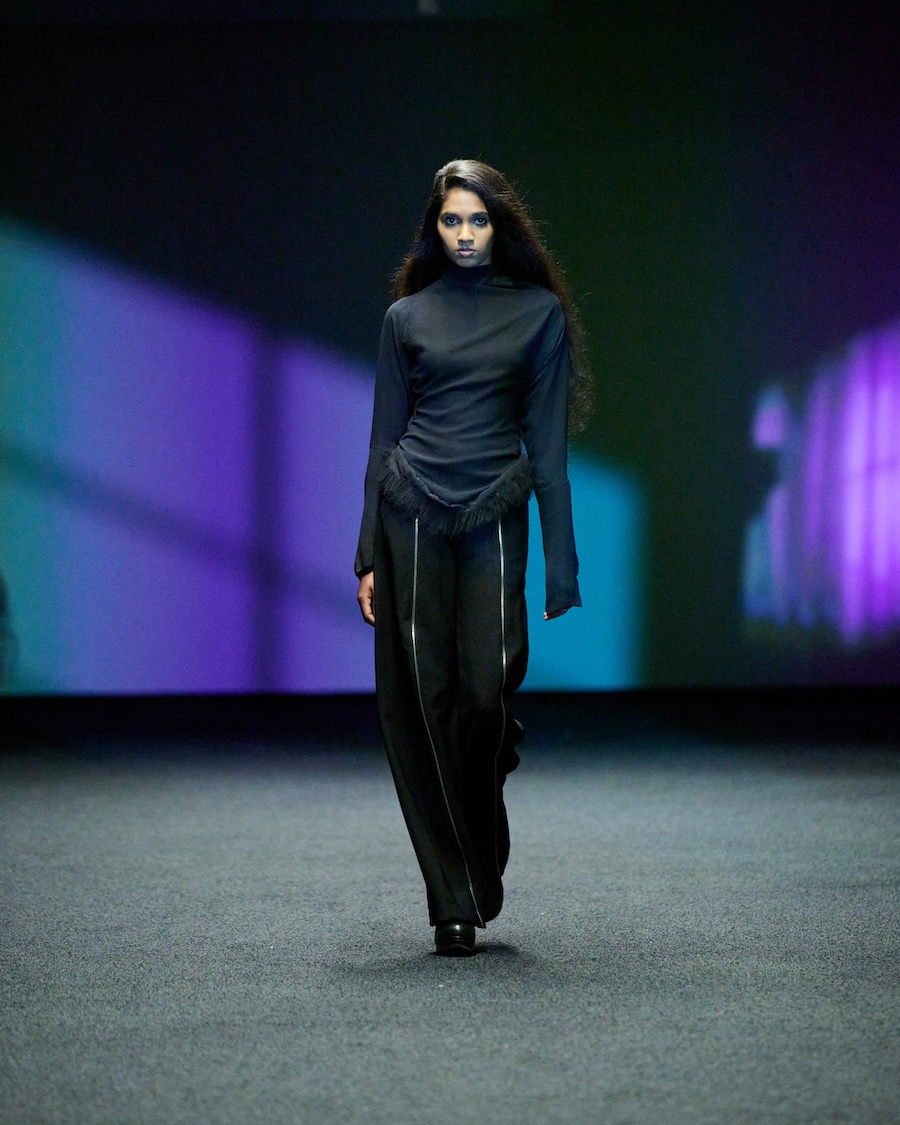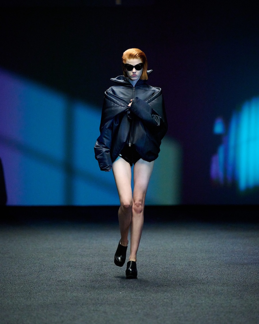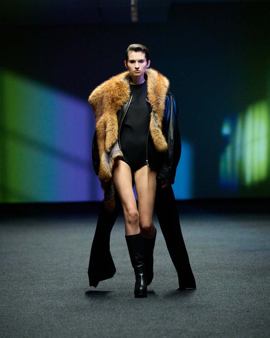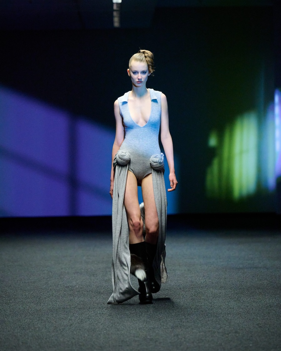 The materials and construction reflect this evolution. Layering is a central theme, offering garments that both conceal and reveal, designed to adapt to the body’s movements. Workwear influences are reinterpreted through sculptural tailoring alongside fluid jersey, mesh, and textured surfaces. The colour palette is industrial at its core, accented by highlights of shine and contrasting elements.