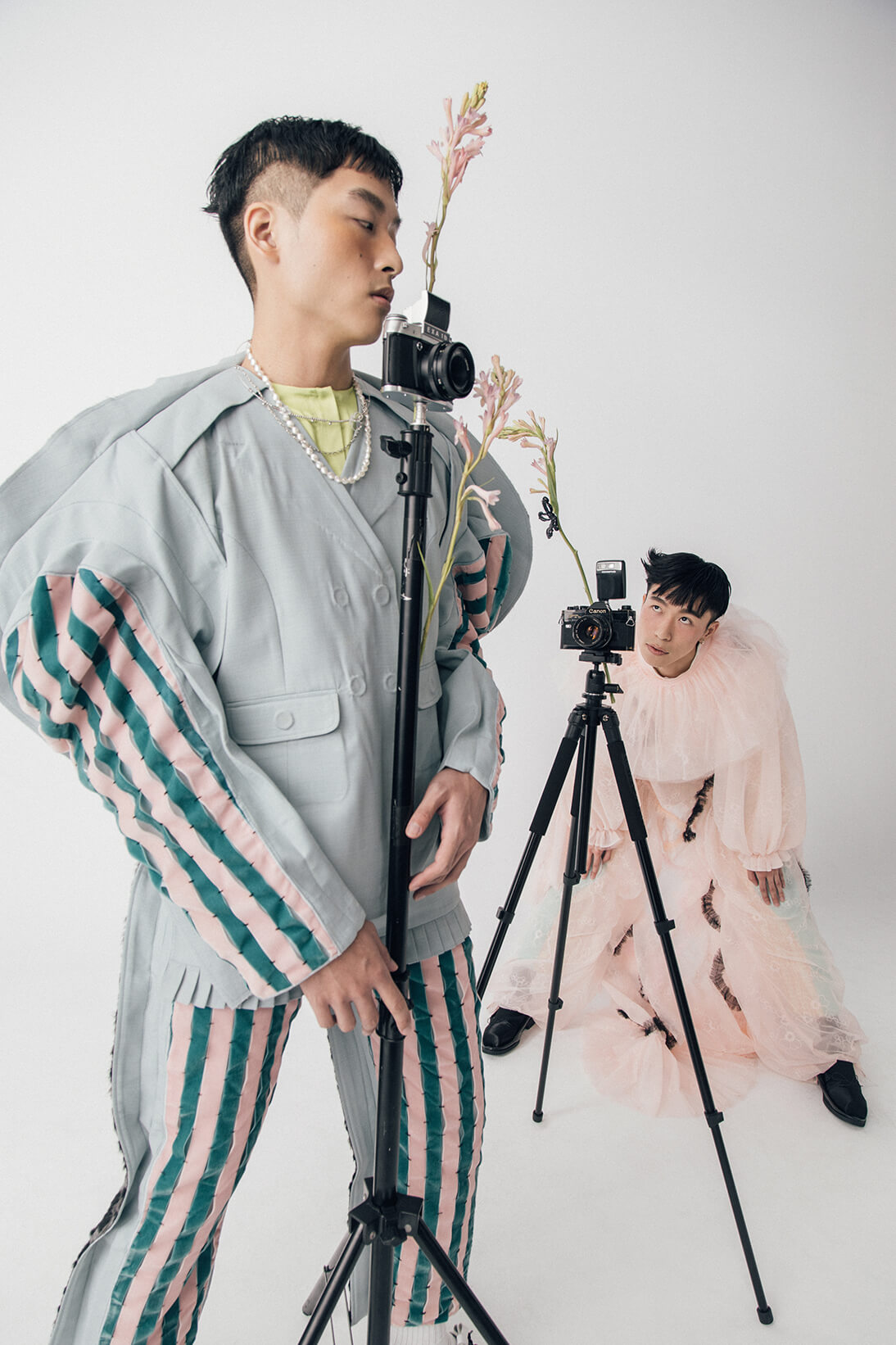 All the clothes are worn in this series “Side by Side” are made by Ching Lin. This collection of clothing is to combines both the essence of masculine and feminine together and shows that through the fashion details that there are no gender preferences. We are side by side as one.