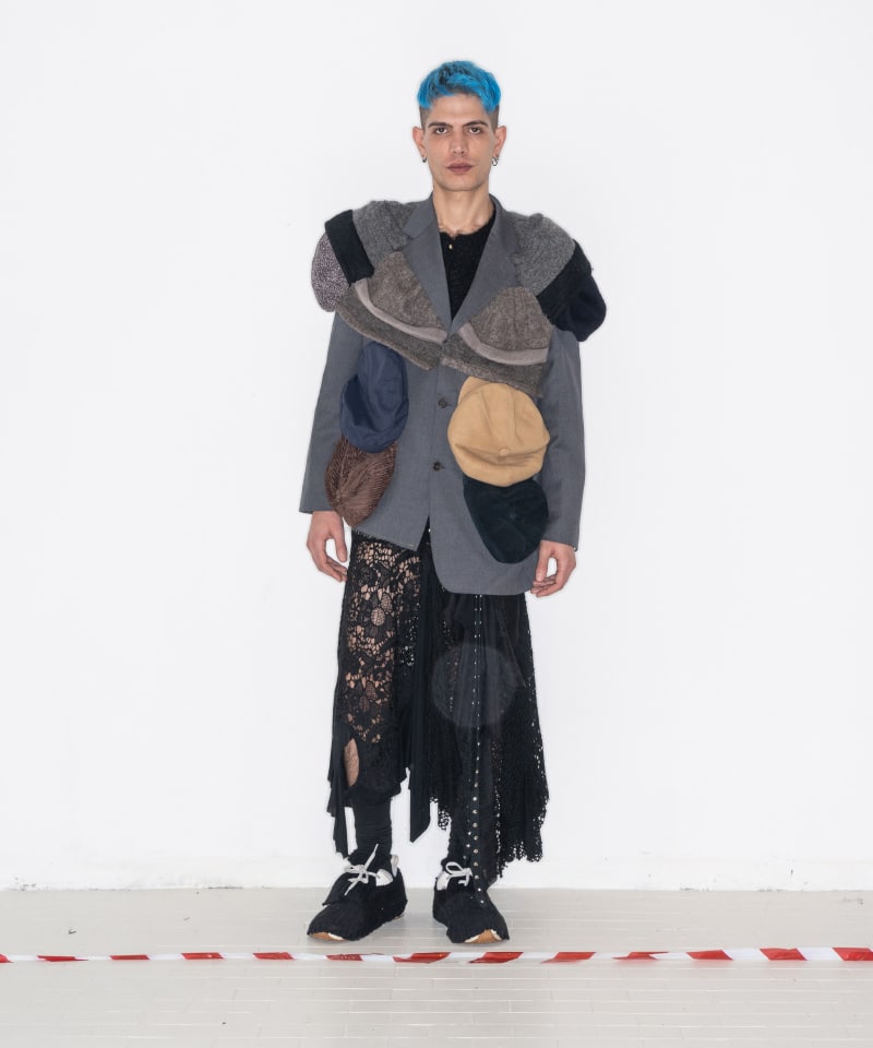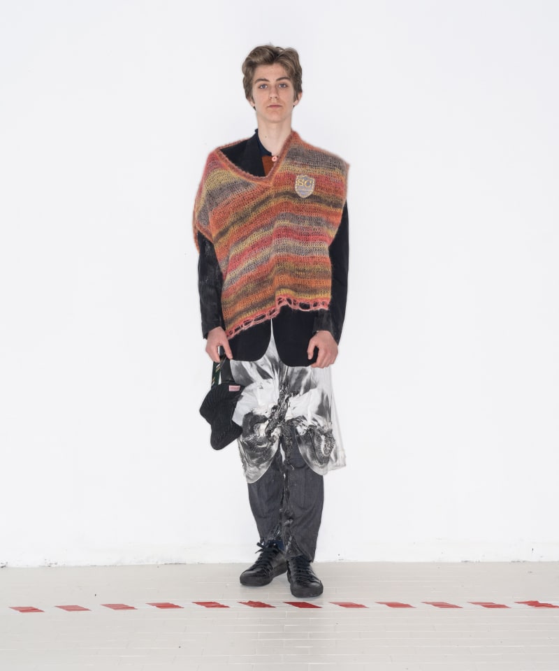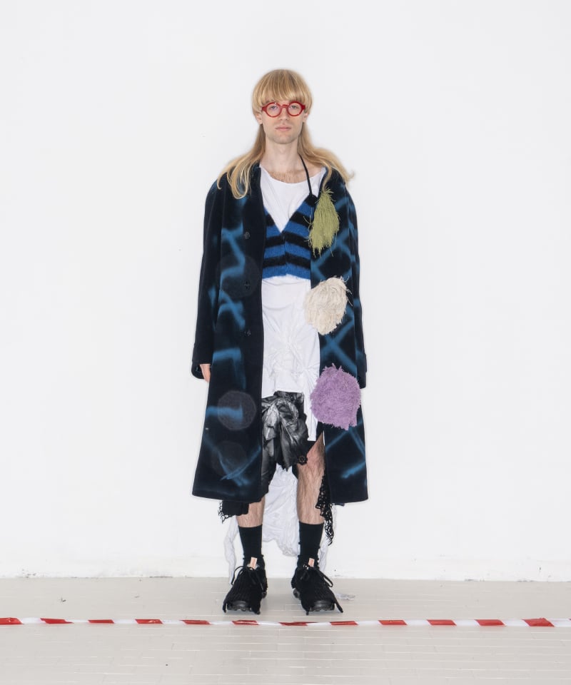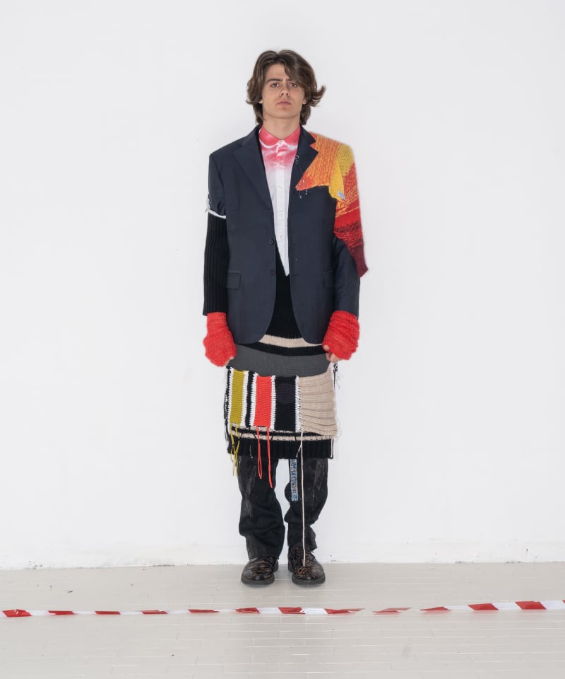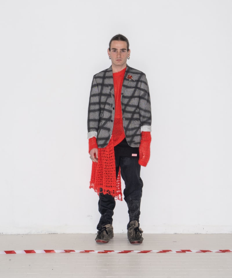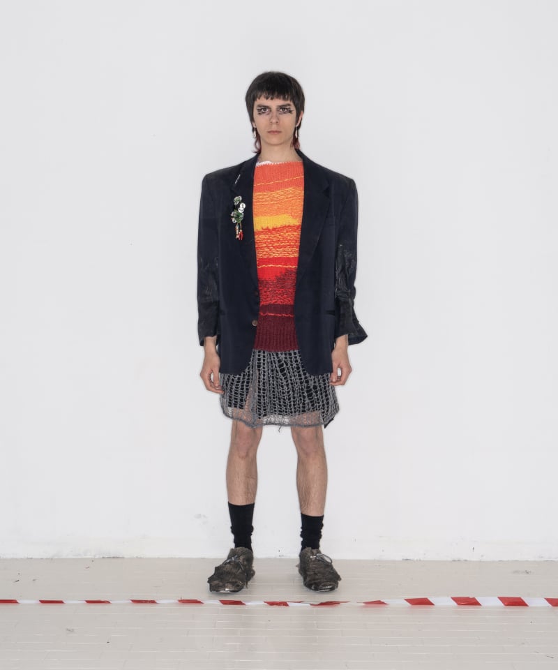 All of this is reflected on tailored clothes encrusted with silicone that cracks if it’s worn, coats made from handmade blankets, knitwear that comes from leftover yarn swatches, white shirts with spray-painted Peter Pan’s collars, chandelier fragments that become blood drops.