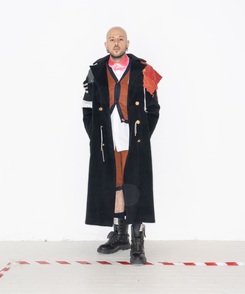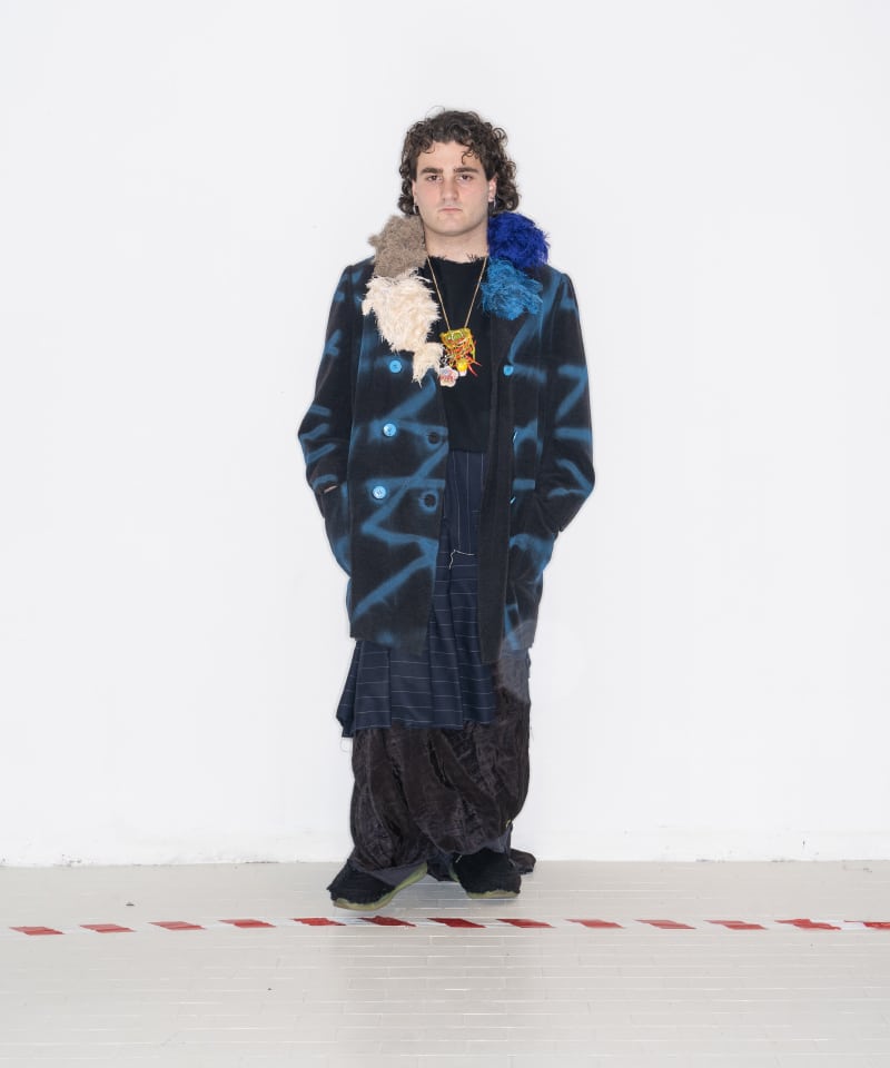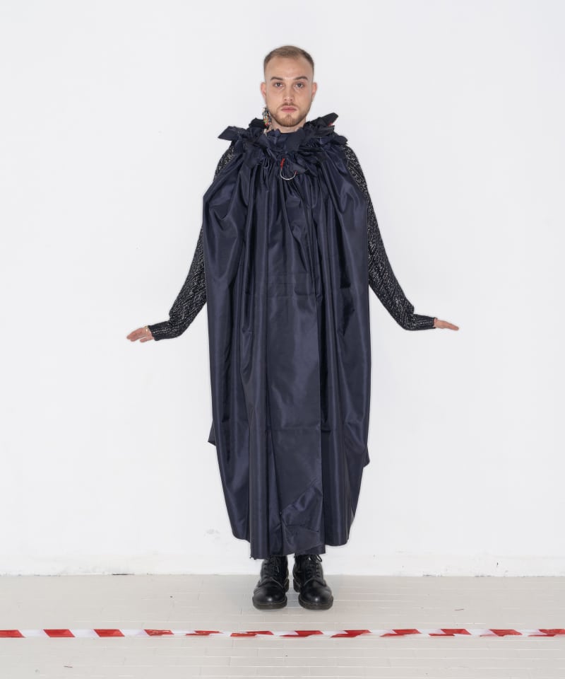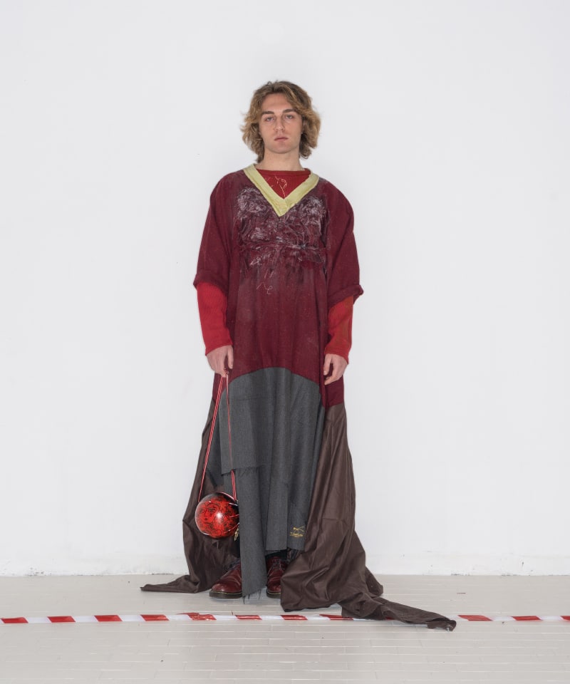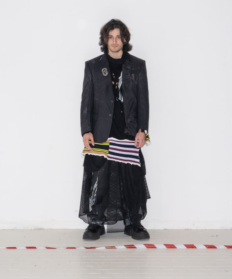 All of this is reflected on tailored clothes encrusted with silicone that cracks if it’s worn, coats made from handmade blankets, knitwear that comes from leftover yarn swatches, white shirts with spray-painted Peter Pan’s collars, chandelier fragments that become blood drops.