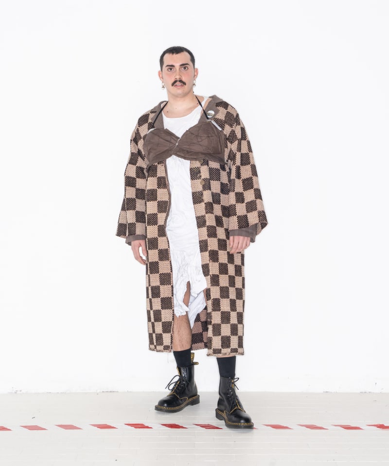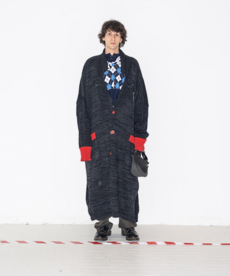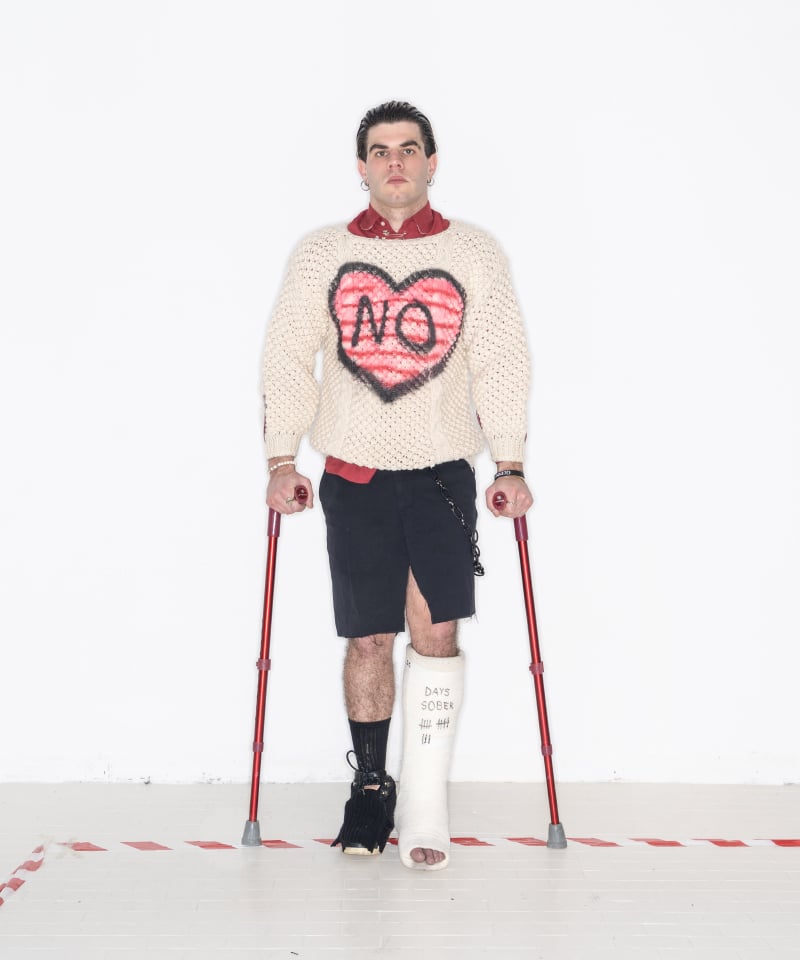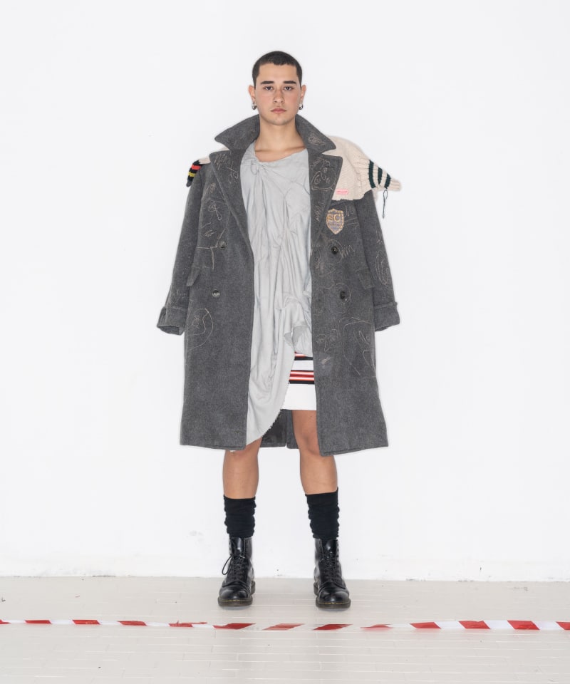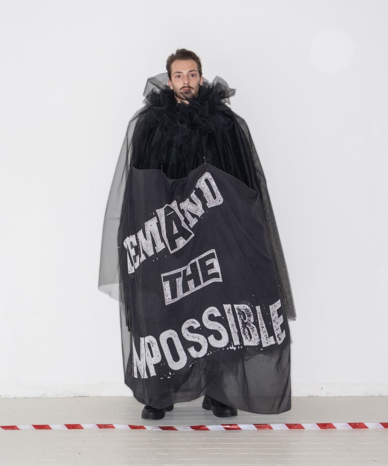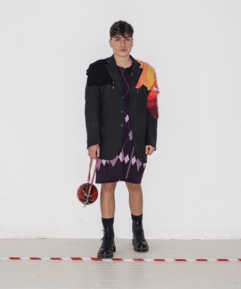 All of this is reflected on tailored clothes encrusted with silicone that cracks if it’s worn, coats made from handmade blankets, knitwear that comes from leftover yarn swatches, white shirts with spray-painted Peter Pan’s collars, chandelier fragments that become blood drops.