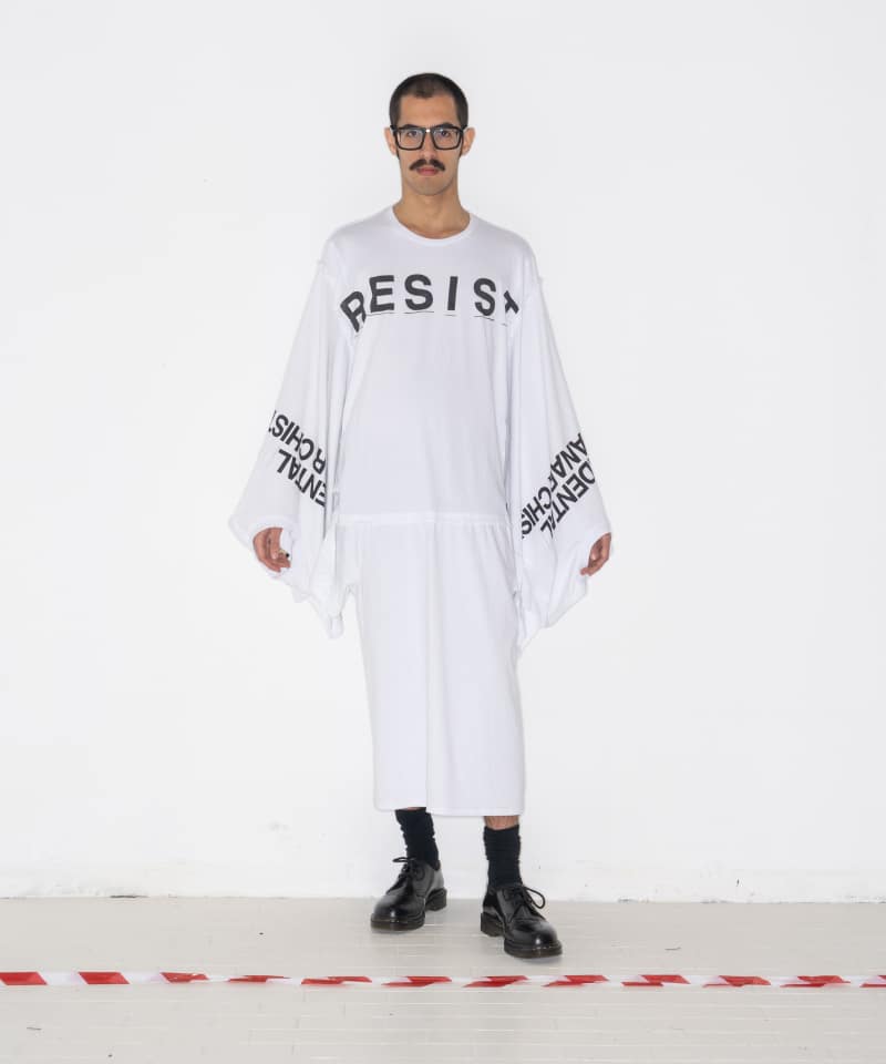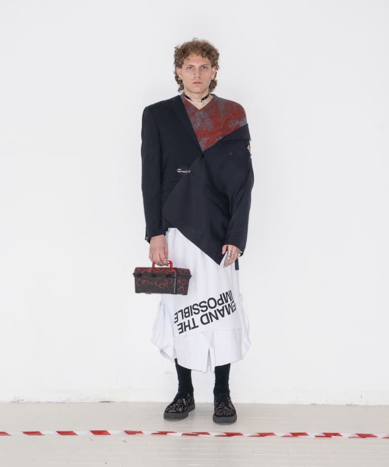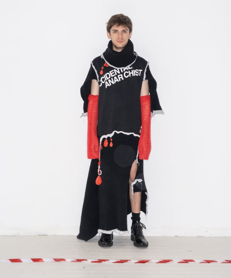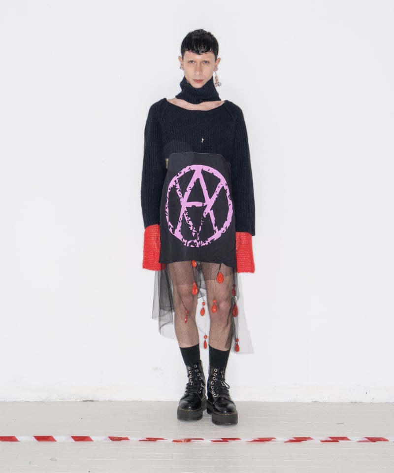 SIMON CRACKER Fall/Winter 2023 collection is based on a strong punk ideology, in its original sense: nonconformism, the definition of one’s not aligned and unique identity, the distance from common places and escape from orthodoxy, provocation, and system’s mockery.