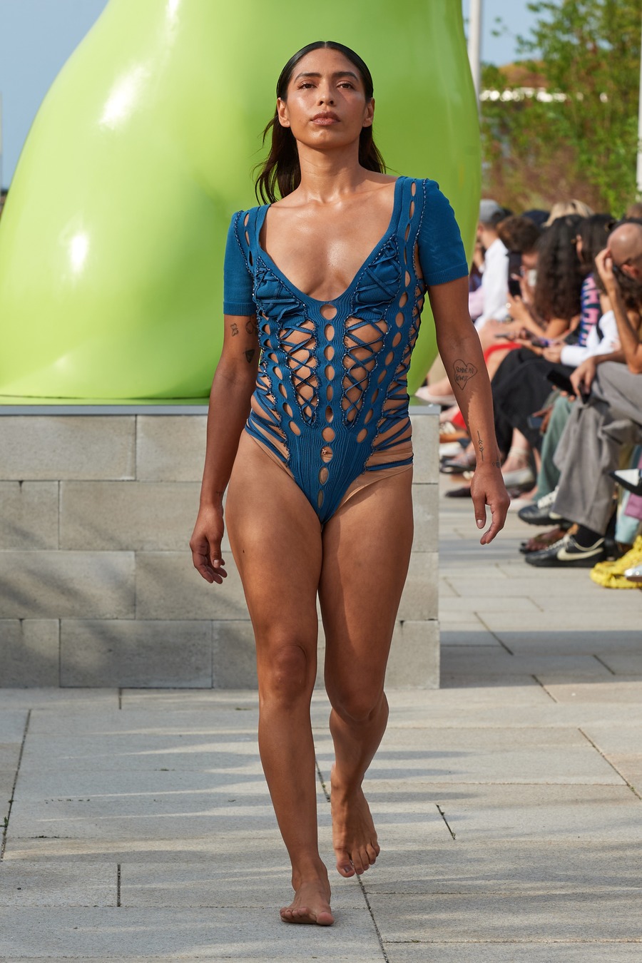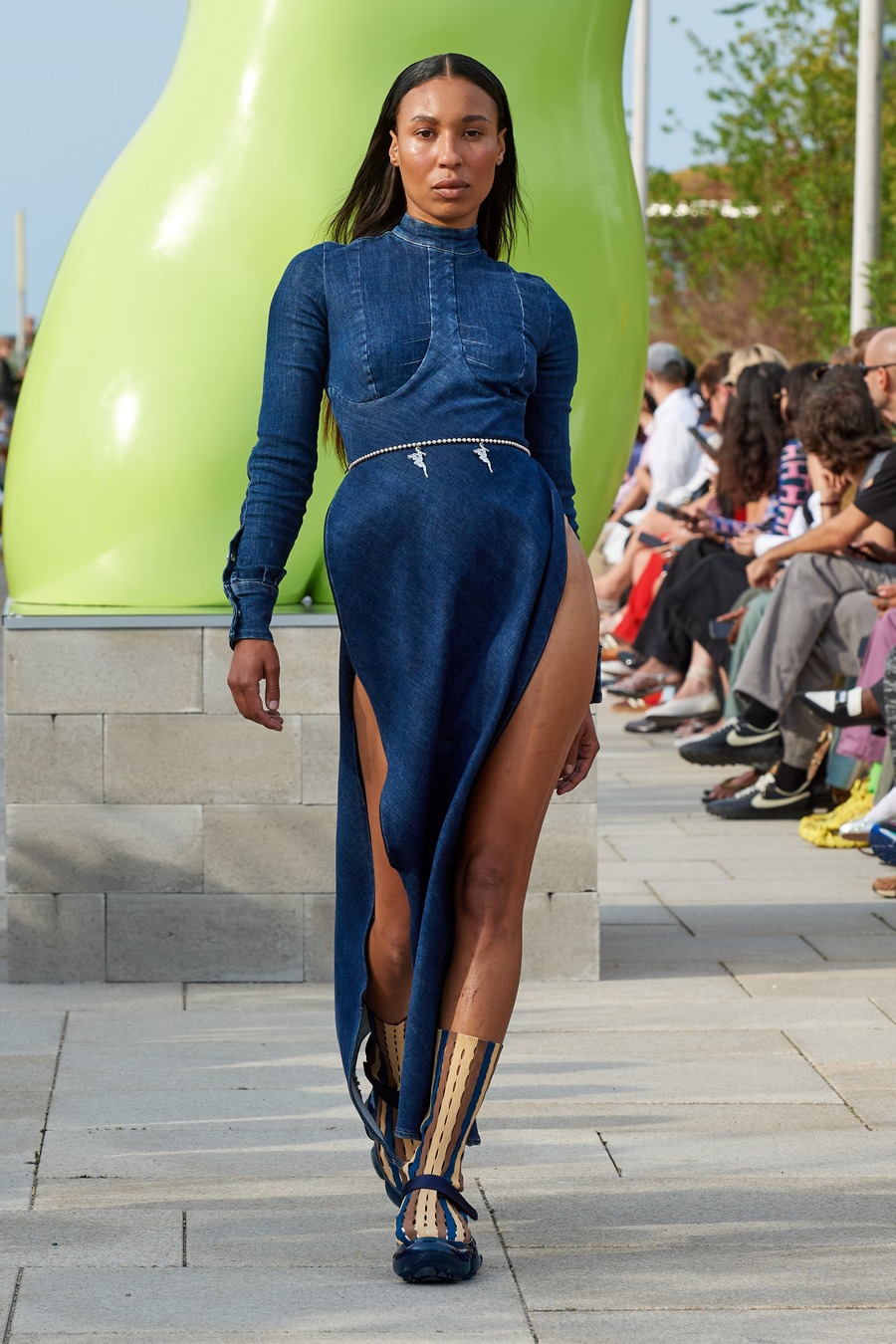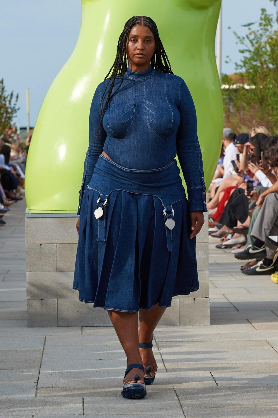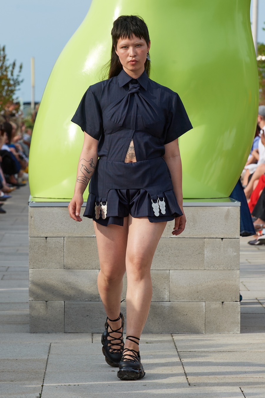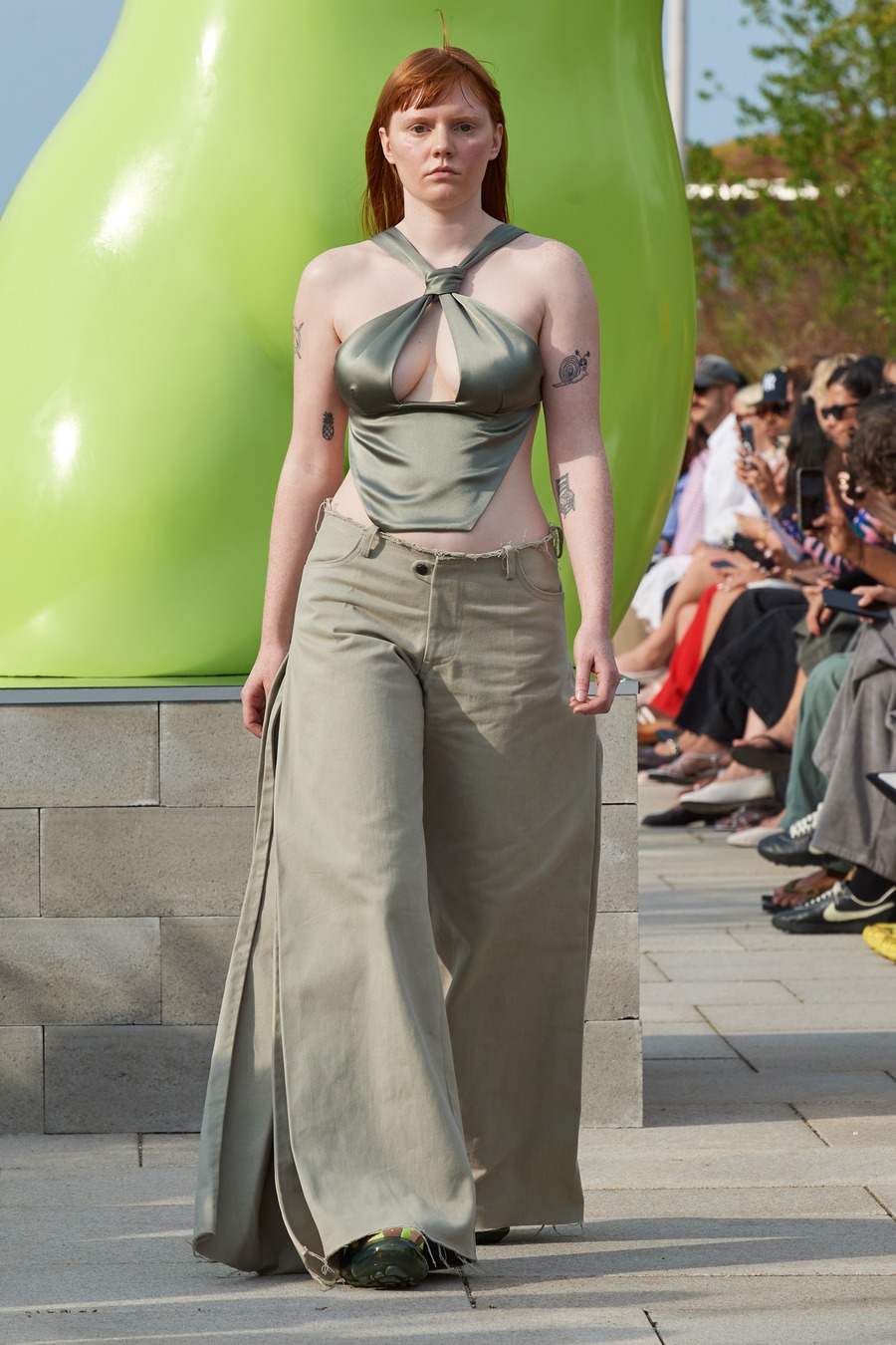 Forever reimagining her signature aesthetics, Sinéad thrills us with her fresh interpretations of shibari-inspired harnesses, newly introduced short sleeves, micro-culottes adorned with slanted rara ruffles, and exquisitely tailored shirts crafted in sumptuous new materials. Particularly mesmerizing is the deep blue denim, exuding an air of sophistication and freedom that embodies endless summer days and luminous nights. Collaborations this season reach dazzling heights with Grounds Footwear, presenting bubble-soled shoes with laced-up uppers reminiscent of traditional Irish Dancing footwear alongside raunchy naked thong sandals. The beguiling layers of lace from Savage X Fenty’s iconic underwear lend an undercurrent of sensuality beneath denim and wool, while Ecco’s distinctive bags, customized by O’Dwyer in her signature ‘Squiggle’ stretch nylon, steal the show.
