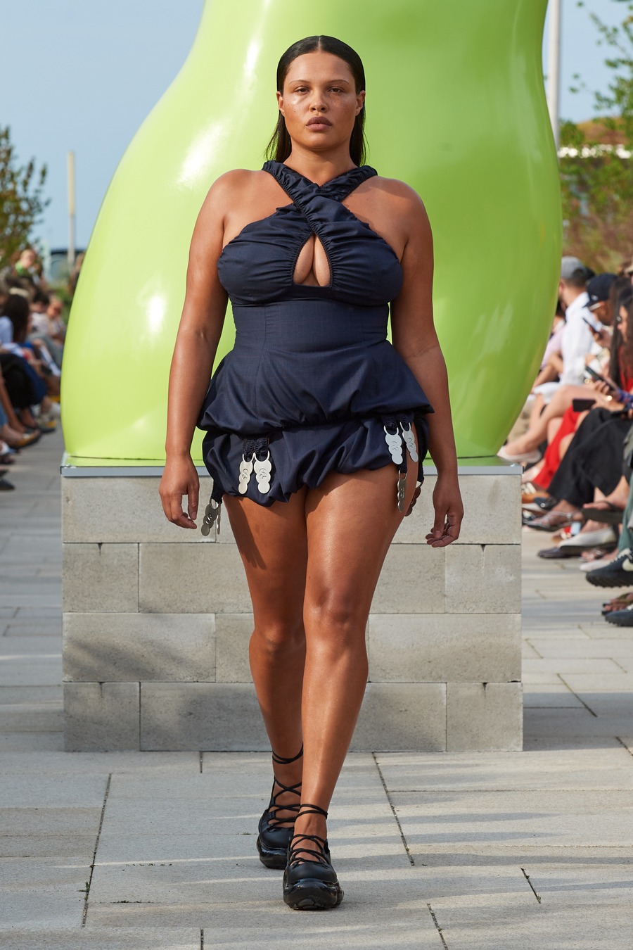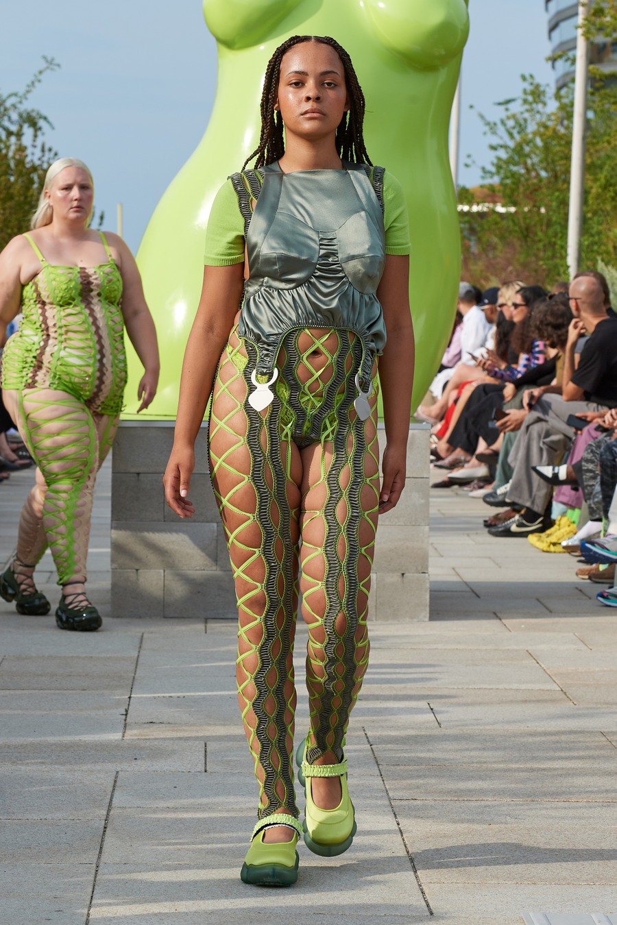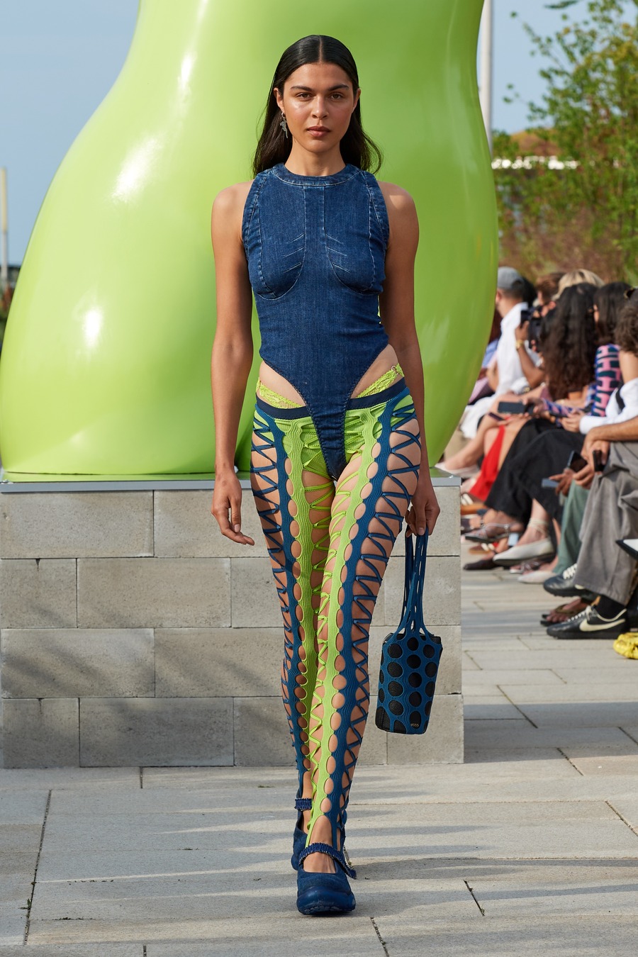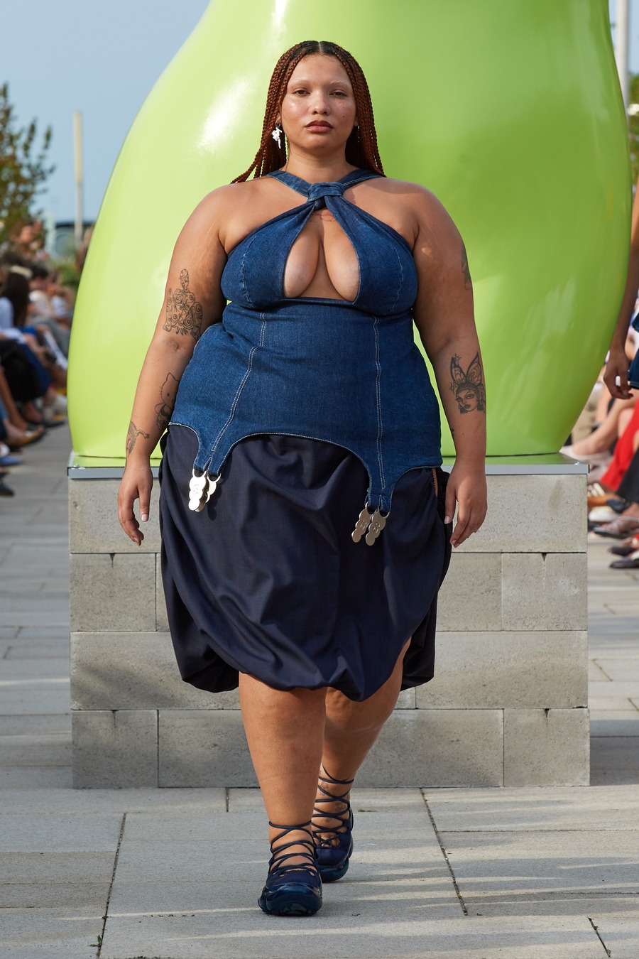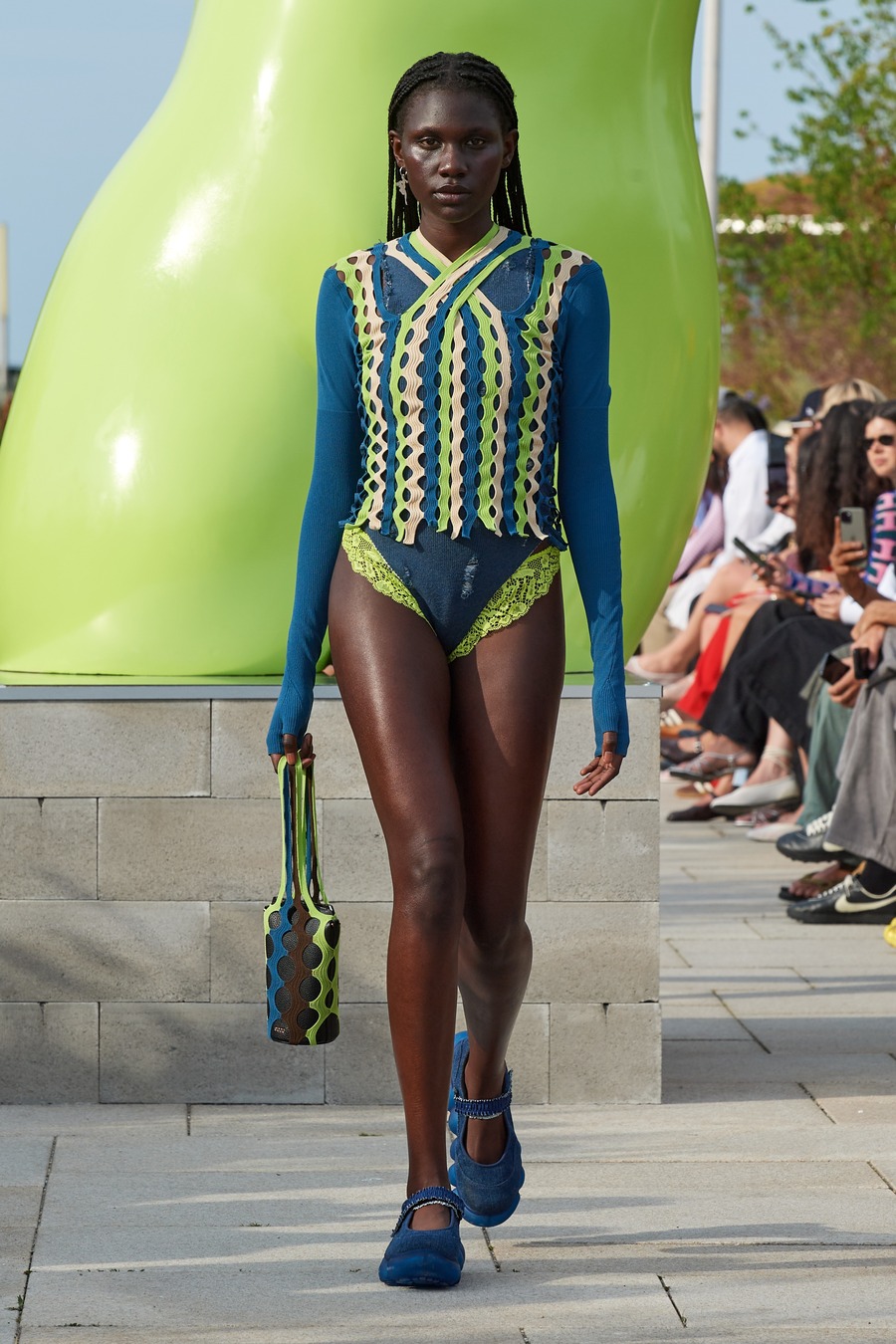 Forever reimagining her signature aesthetics, Sinéad thrills us with her fresh interpretations of shibari-inspired harnesses, newly introduced short sleeves, micro-culottes adorned with slanted rara ruffles, and exquisitely tailored shirts crafted in sumptuous new materials. Particularly mesmerizing is the deep blue denim, exuding an air of sophistication and freedom that embodies endless summer days and luminous nights. Collaborations this season reach dazzling heights with Grounds Footwear, presenting bubble-soled shoes with laced-up uppers reminiscent of traditional Irish Dancing footwear alongside raunchy naked thong sandals. The beguiling layers of lace from Savage X Fenty’s iconic underwear lend an undercurrent of sensuality beneath denim and wool, while Ecco’s distinctive bags, customized by O’Dwyer in her signature ‘Squiggle’ stretch nylon, steal the show.