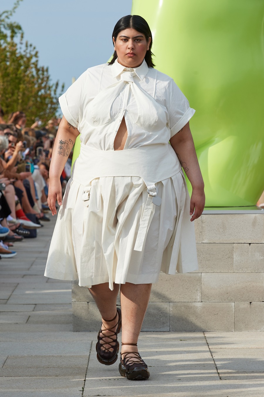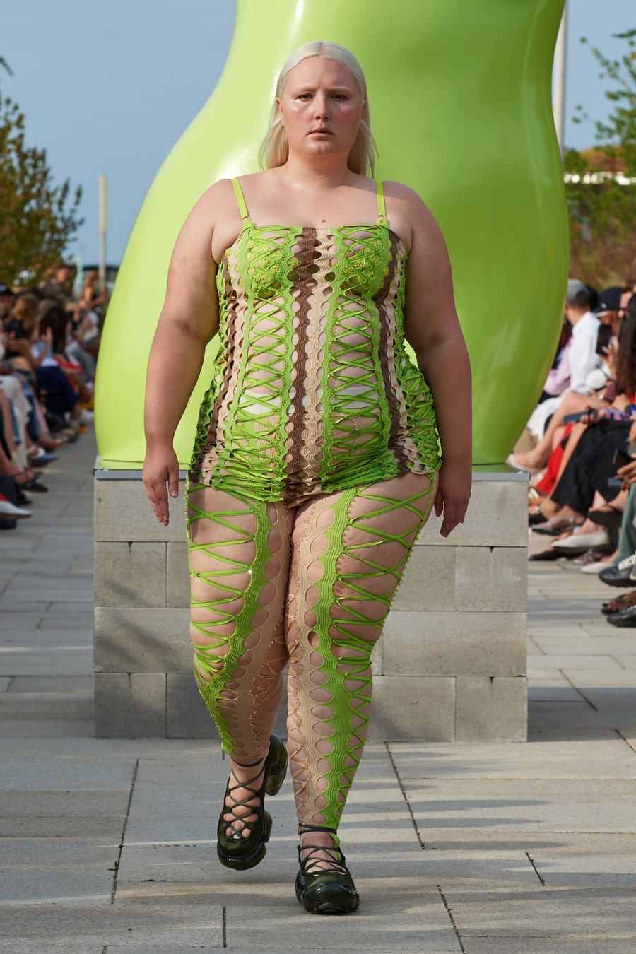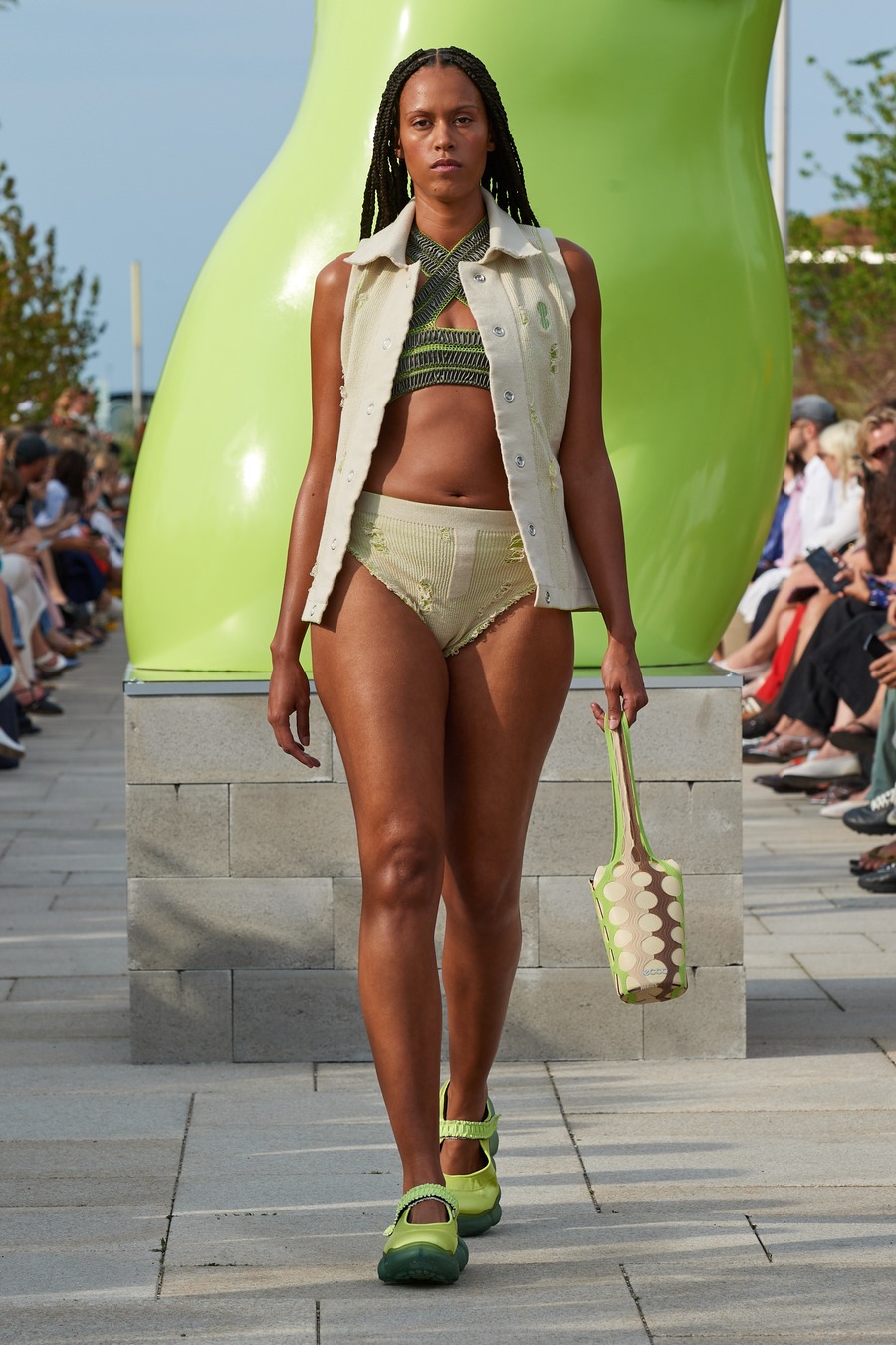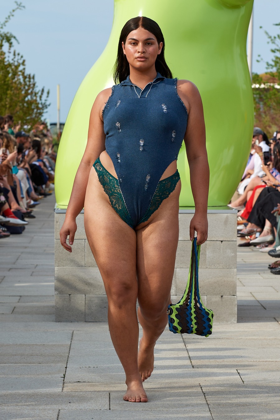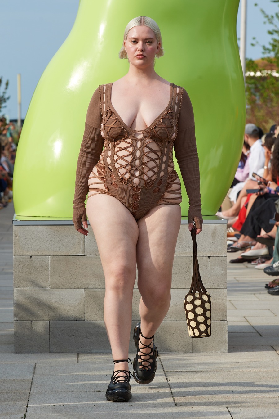 Forever reimagining her signature aesthetics, Sinéad thrills us with her fresh interpretations of shibari-inspired harnesses, newly introduced short sleeves, micro-culottes adorned with slanted rara ruffles, and exquisitely tailored shirts crafted in sumptuous new materials. Particularly mesmerizing is the deep blue denim, exuding an air of sophistication and freedom that embodies endless summer days and luminous nights. Collaborations this season reach dazzling heights with Grounds Footwear, presenting bubble-soled shoes with laced-up uppers reminiscent of traditional Irish Dancing footwear alongside raunchy naked thong sandals. The beguiling layers of lace from Savage X Fenty’s iconic underwear lend an undercurrent of sensuality beneath denim and wool, while Ecco’s distinctive bags, customized by O’Dwyer in her signature ‘Squiggle’ stretch nylon, steal the show.