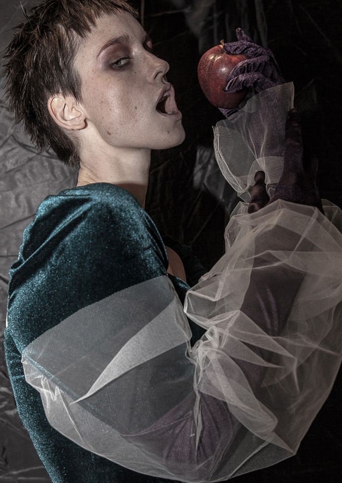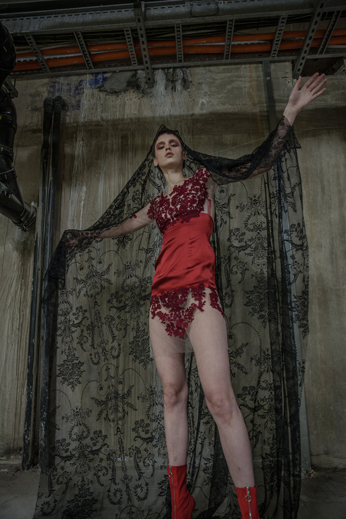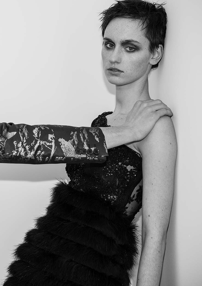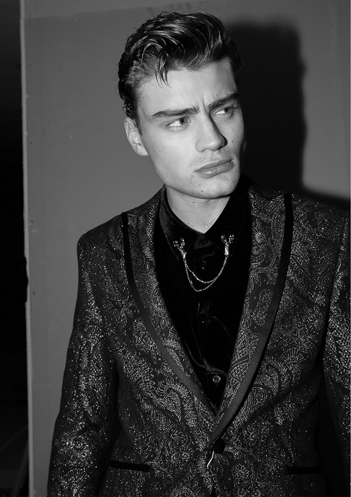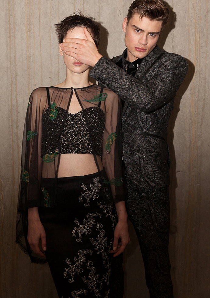 Red satin embellished dress: Michaela Frankova, Dark green velvet dress with puff sleeve: Topshop, Purple gloves with mesh: Jayne Pierson Black suit with blue floral pattern and blue pinstripes: Malan Breton, Black velvet shoes: Zara Black top with jewel embellishments, Black sheer cape: Lace & Beads, Black skirt with silver embellishments: Michaela Frankova One shoulder black dress with feathered skirt: Michaela Frankova, Suit with gold fish jacquard: Asos Silver embellished black Suit: Zara, Black velvet shirt: Burton, Antler collar chain: Noose & Monkey Red satin embellished dress: Michaela Frankova, Red ankle boots: Public Desire
