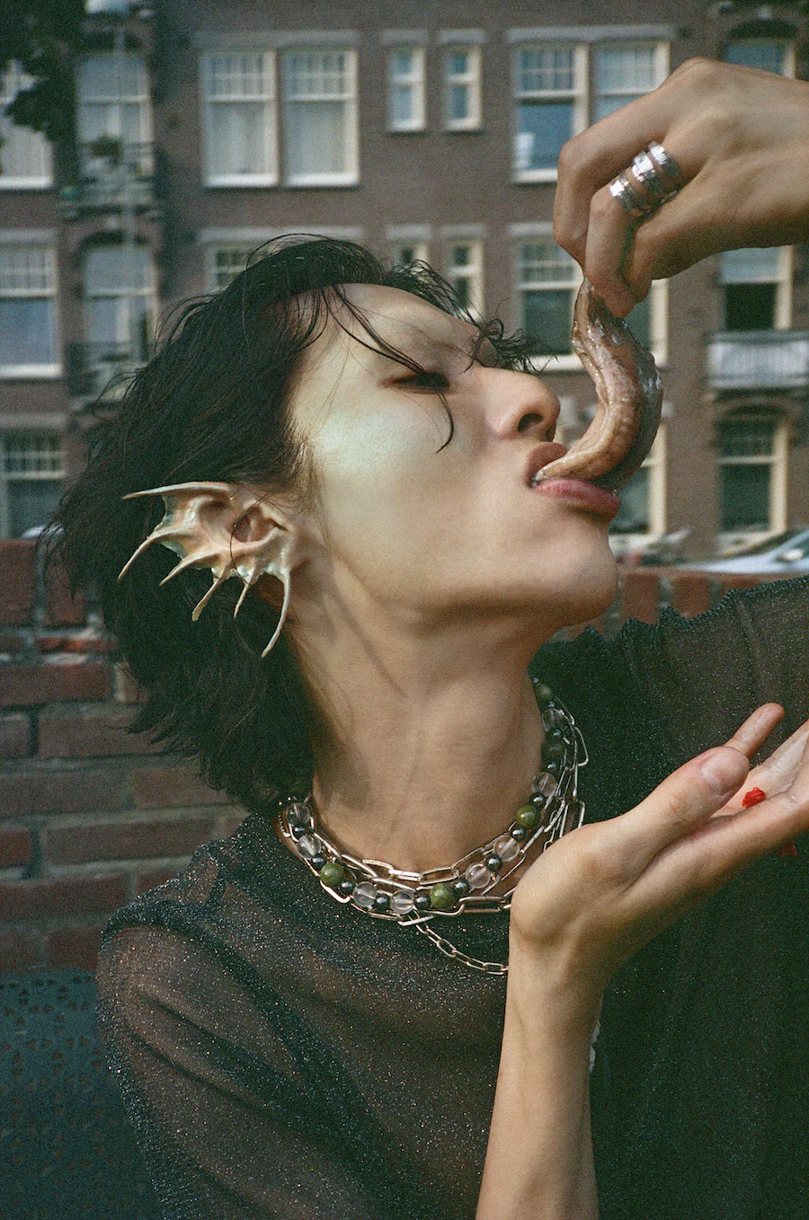 A dangerously beautiful siren, wandering the streets of Amsterdam. A KALTBLUT exclusive by Elysa Kleinprintz & Naomi Philips. The model is Hoyin. Humanlike sea creatures, immortal sirens spend many centuries discovering the depth of the ocean, never growing bored of its beauty and its diversity.