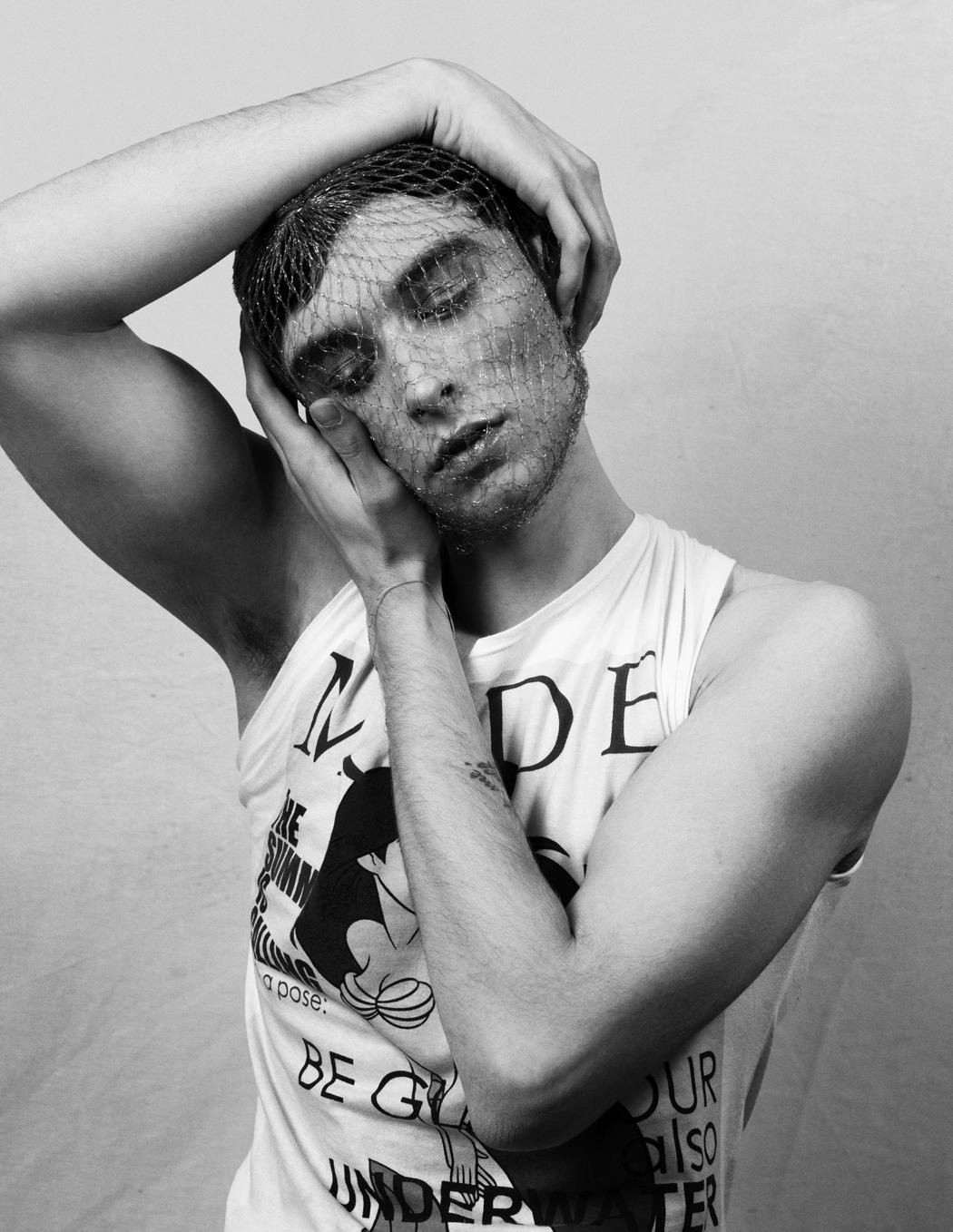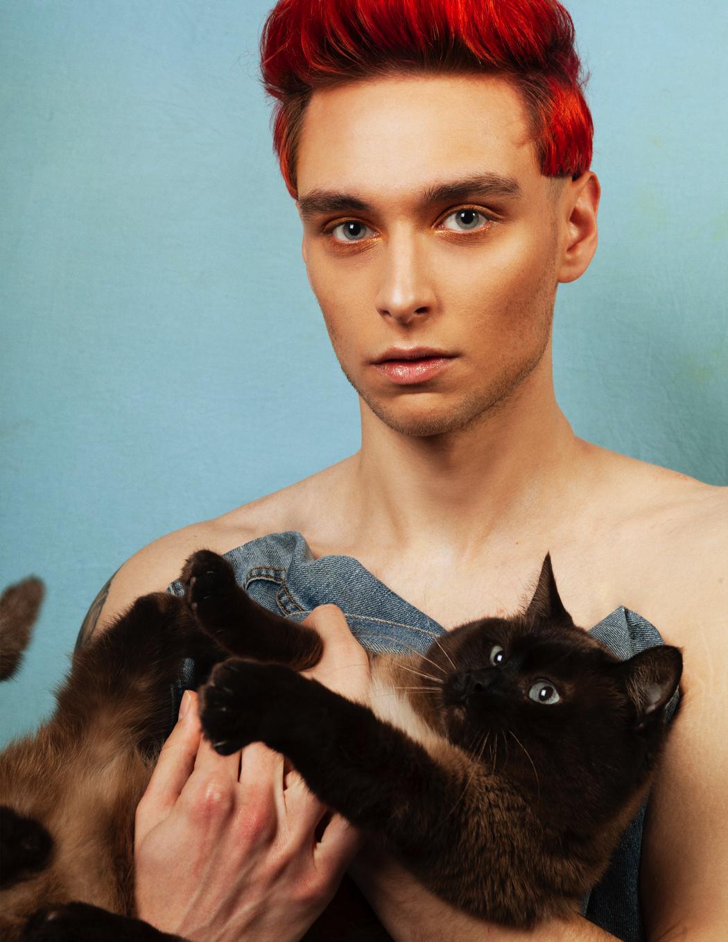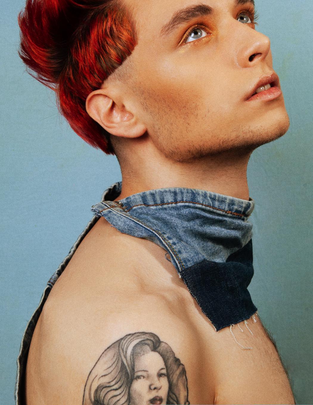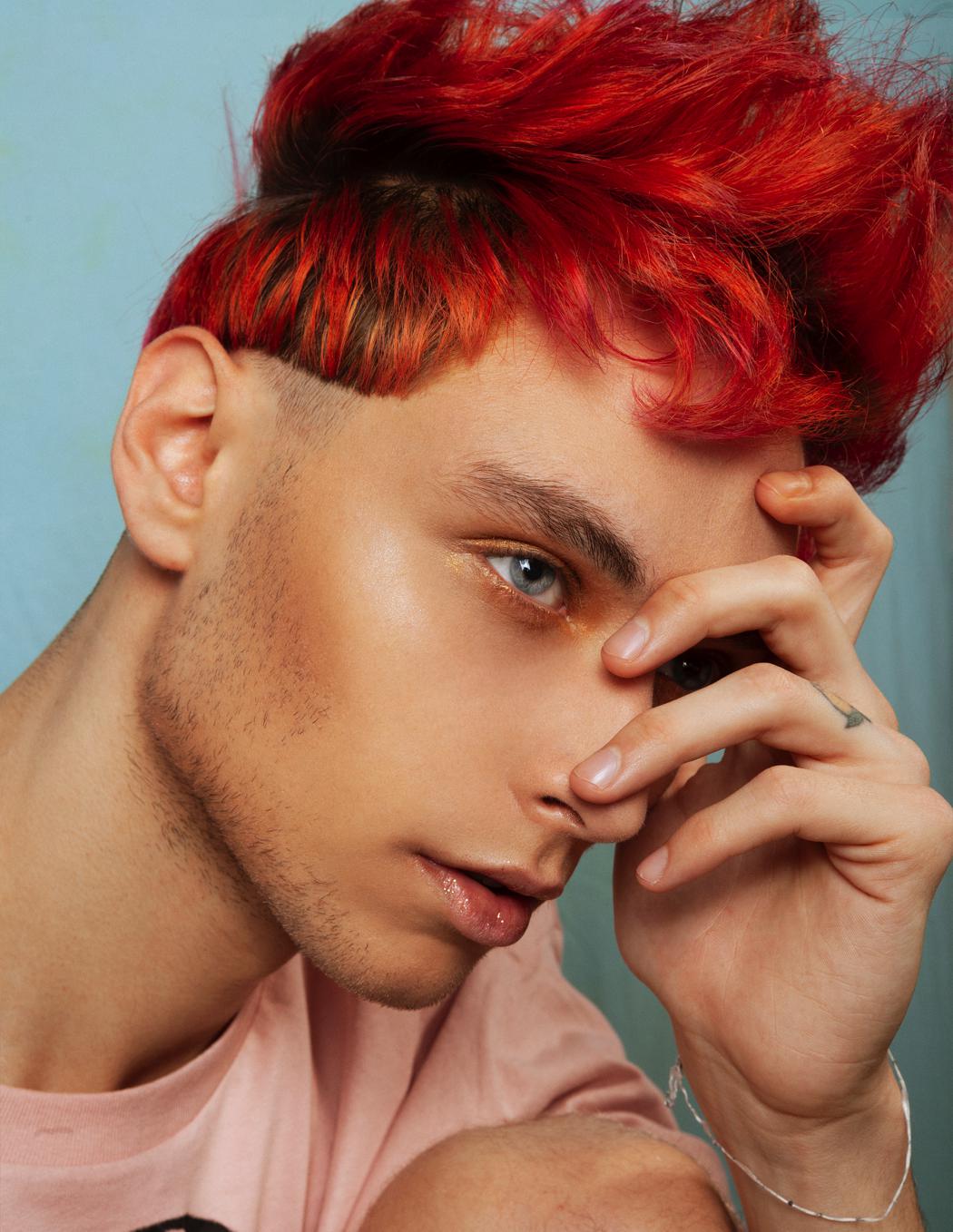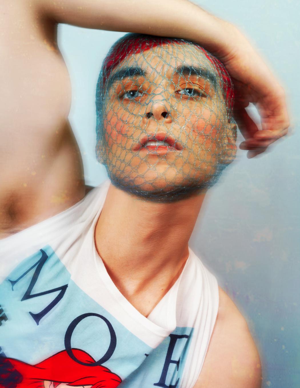 A KALTBLUT exclusive. Mak-up and Model Luca Pieretti. Francesco Greco is back with a new editorial he made during the Lockdown. “Sirene” is a series that I took with Luca in march, just one day before the total lockdown in Italy. We were working on a shooting that unfortunately would have been skipped, so that day I had cut and dyed his hair, because of the closed hairdressers. Then I found an old Disney t-shirt in my wardrobe and we started shooting. I play with the red hair colour and the blue then I mixed everything creating an Ariel Ciccone Warhol.”