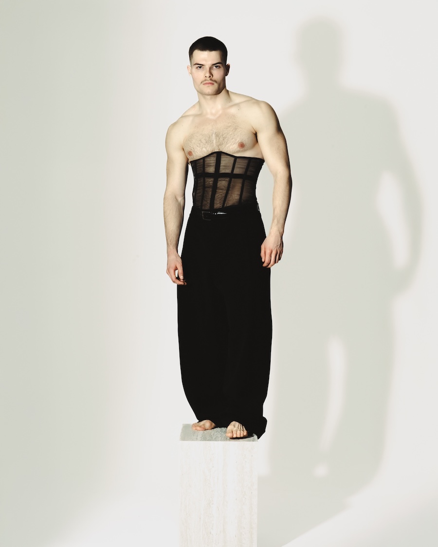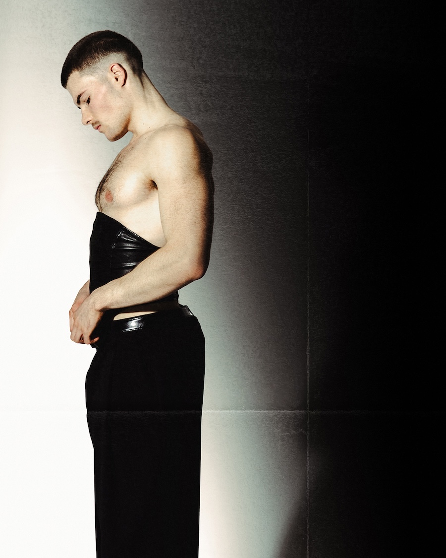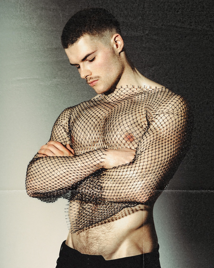 A KALTBLUT exclusive. Photographed and Styled by Grzegorz Serczyk. The model is Kacper. “SKINFRAME” plays on the tension between exposure and construction, using mesh, corsetry, and light as structural elements that redefine the male silhouette. It’s an editorial where fashion sculpts the body — and the body becomes the purest form of style.