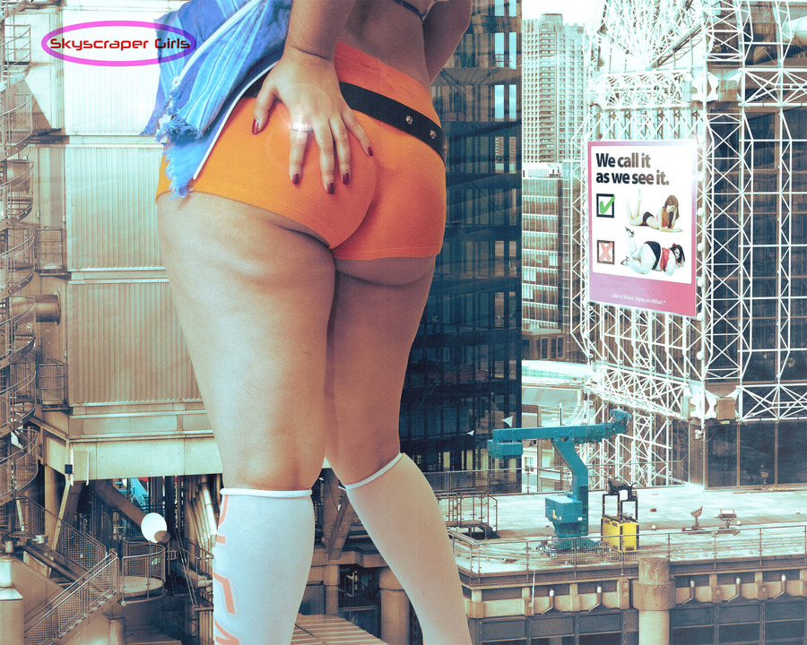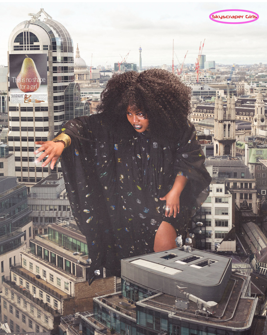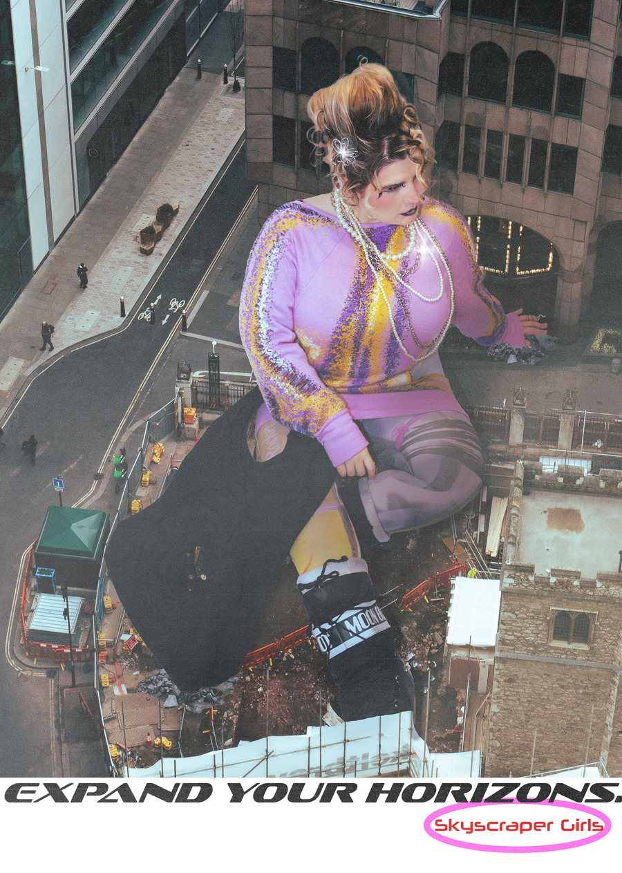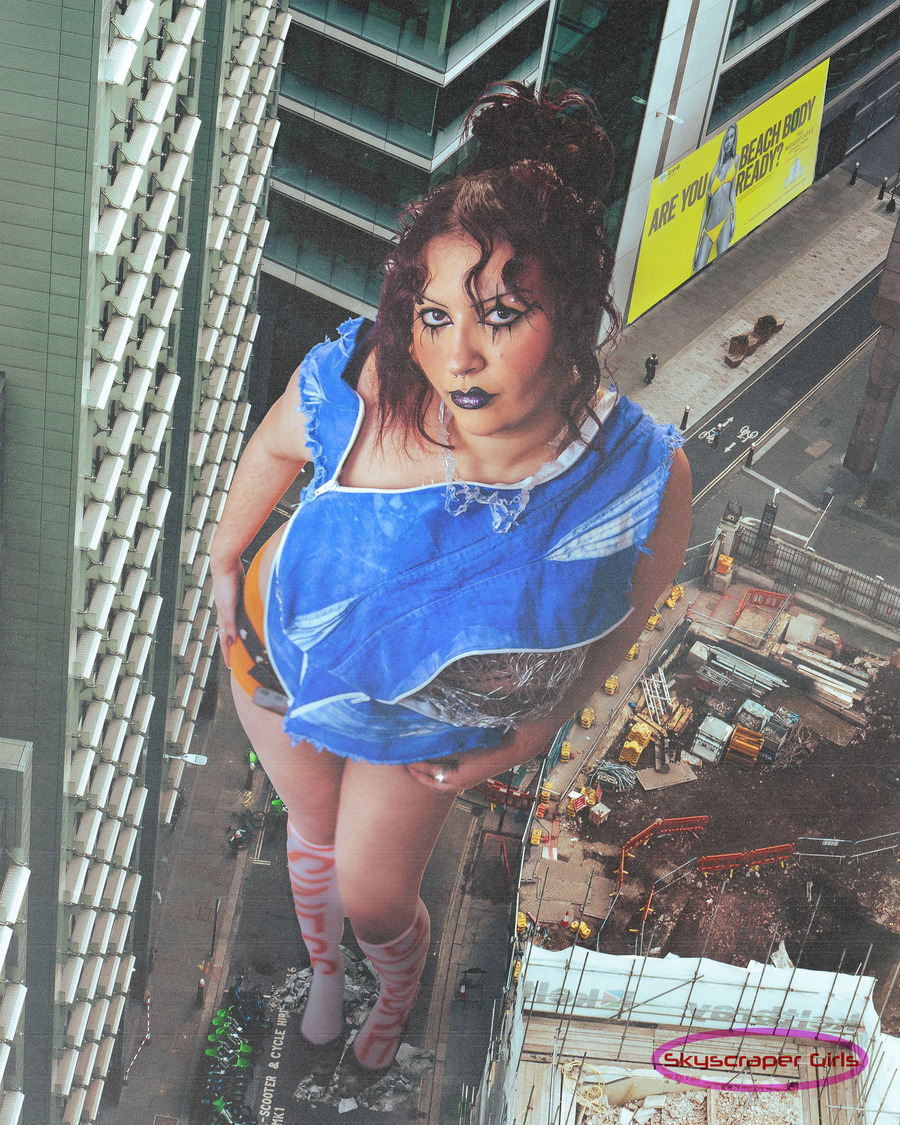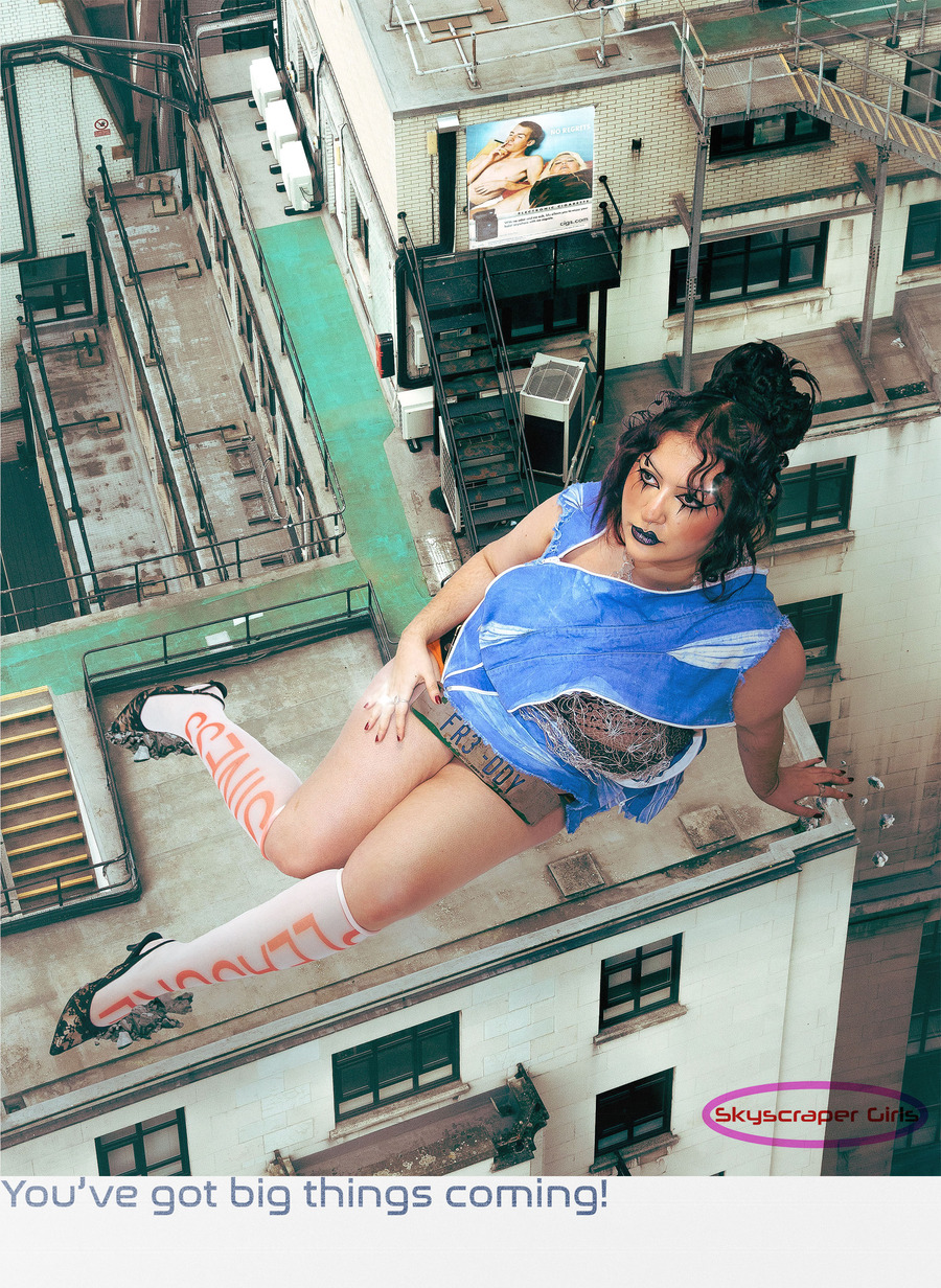 “My work aims to bridge the gap between social commentary, the fashion industry and photographic art. My most recent project is no exception. This series is titled ‘Skyscraper Girls’ and is a representation of my experience as a curve model in the fashion industry. It expresses the heart-sinking feeling of being forced into too-tight clothes, of ripping seams, popping buttons and breaking zippers… of feeling like the largest thing a company can think of, of being tokenised and seen as lesser. I believe that often the inclusion of plus size and curve models is celebrated so greatly, with no thought on how badly those models may have been treated behind the scenes. There is a long way to go to ensure equal treatment in this industry, and campaigns like the recent Emily Ratajkwoski disaster were the final push for me to express my disdain for fashion fatphobia.”