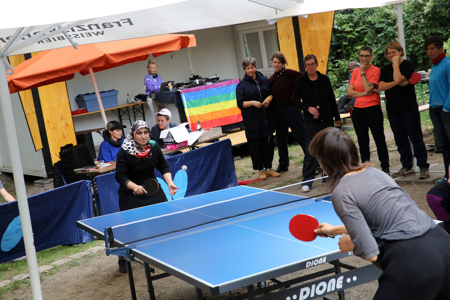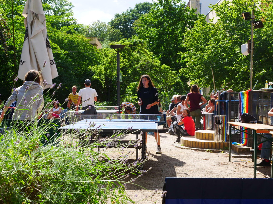 Queer Ping Pong adapts to its environment, blending movement, music, and post-migrant discourses. The normative setting of club culture is reimagined: the events occur during the day and are free of charge. It’s all about relaxed vibes, focusing solely on the joy of the game and the community—from early afternoon until sunset—including the obligatory round-robin on the ping-pong table.