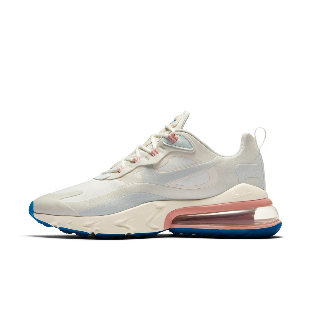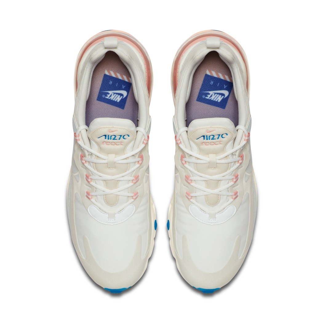 “Instead of no-sew or stitched on panels, the Air Max 270 React is built with a bar tack technique inspired by the Element React 87,” explains Dylan Raasch, Nike Senior Sportswear Design Director. “This creates the floating eye stay aesthetic.”