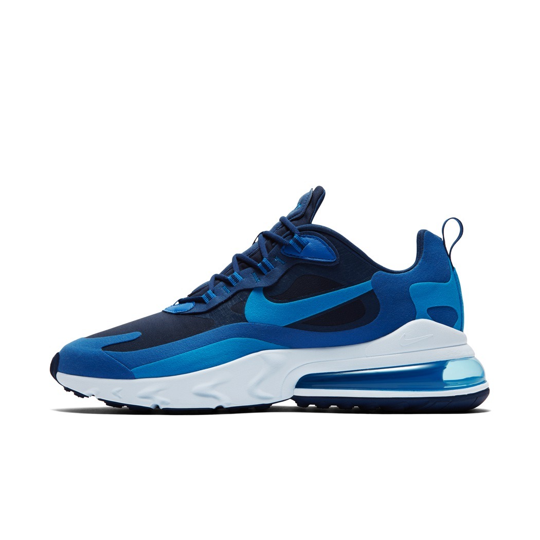 The Nike Air Max 270 React continues a drive for iterative progress in the Air Max lineage. The introduction of Nike React technology results in a smooth transition from heel to forefoot (the offset is also reduced from its predecessor) and energetic sculpting. The shoes upper follows the radiating design language of the tooling by layering no-sew materials to mirror a traditional cut-and-sew aesthetic through a new construction methodology.
