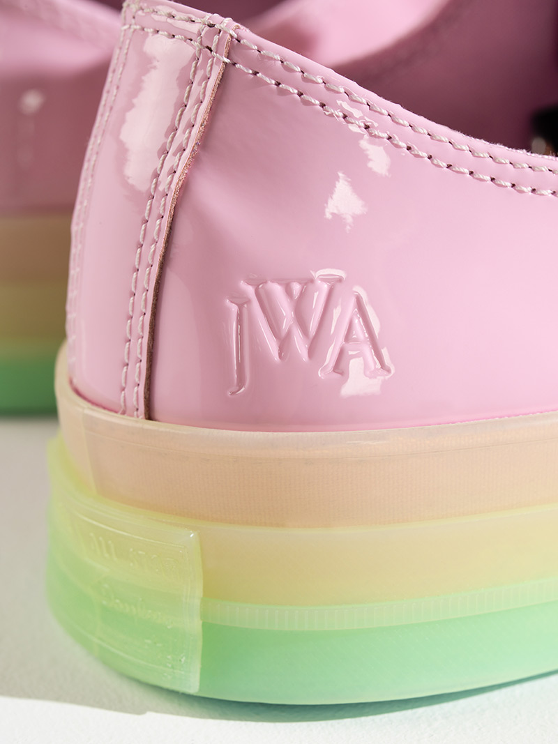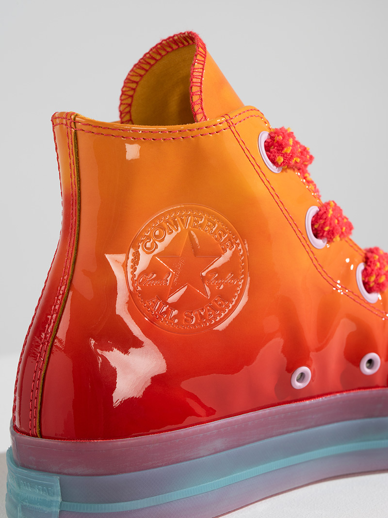 As Anderson continues his collaboration with Converse, he applies his passion for art and craft to the iconic Chuck. A brilliant combination of textures inform the design of his latest Chuck 70. “Gloss” in the form of patent leather, an exuberant application of color, and laces that mimic the stucco of San Francisco.