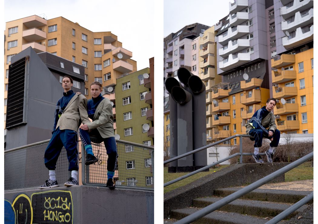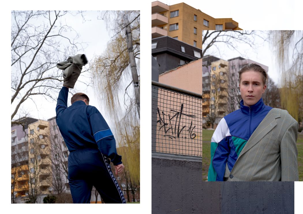 A KALTBLUT exclusive menswear editorial. Photography by Daniel Peace. Models are Marco Hunger & Robin Solf. Styled by Todd Hodson. “The shoot was based on old school sport fashion that you would usually see the young generation wearing. Tracksuits, trainers and designer socks. Now with all fashion trends returning you can see how they still are popular and can also look as cool as they did back in the day. Based on 2 brothers from a council estate showing us how they wear it now, during a day with Hunger and Solf they show us the brotherhood relationship between themselves while kicking back in Berlin. The looks were mixed with old fashion and current making it blend in with todays young culture. Mixing the looks up with over the shoulder blazers showing that they are more than just boys from the estate. The style fits in with everyday life in Berlin as fashion within the younger generation is changing daily. With the look I wanted to to show that there was 2 different styles in the look from the top half it could be shown as a more professional look with the blazer added in, then the bottom half not forgetting where you’ve come from.”