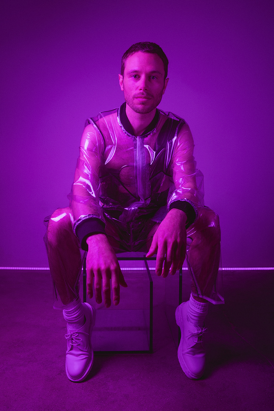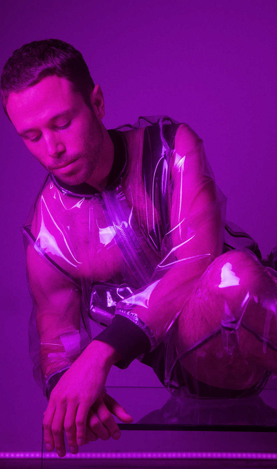 South London singer-producer and all-around creative visionary Semi Precious (real name Guy Baron) unveils ‘Other Life’ – synth-drenched art pop single released on the Squareglass imprint, that offers an immersive and emotional ride between the bounds of hedonism, melancholia and fleeting euphoria. As a frequent collaborator of fashion designers and visual artists, Semi Precious teamed up with Berlin-come-London designer Dhenze (David Henze), whose work explores notions of digital media, queerness and the blurring boundaries between the private and the public gaze. In this special, joint production, Semi Precious is captured by portrait photographer Barbora Mrazkova wearing Dhenze’s all-PVC, concept piece – a visual interpretation of the tension between hedonism and fragility, as realised in the newly-released track ‘Other Life’.
