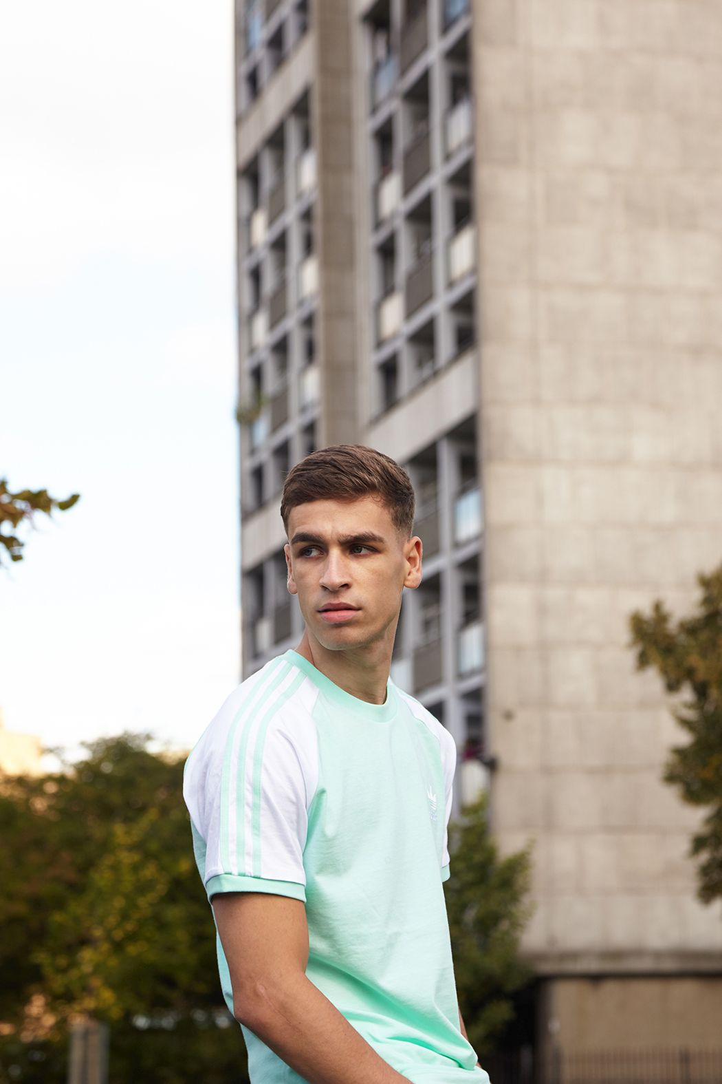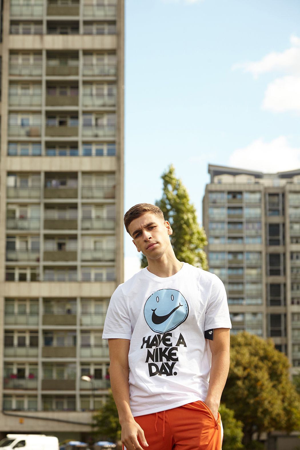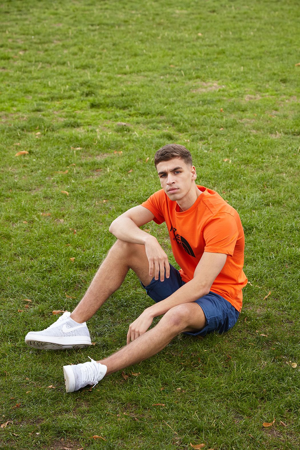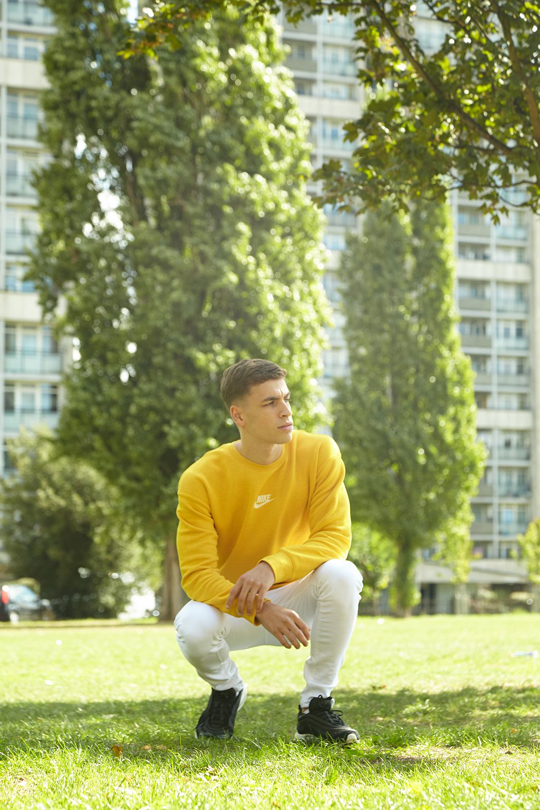 Sam wears Nike Heritage Sweatshirt, ASOS DESIGN Trousers, Trainers Models Own.