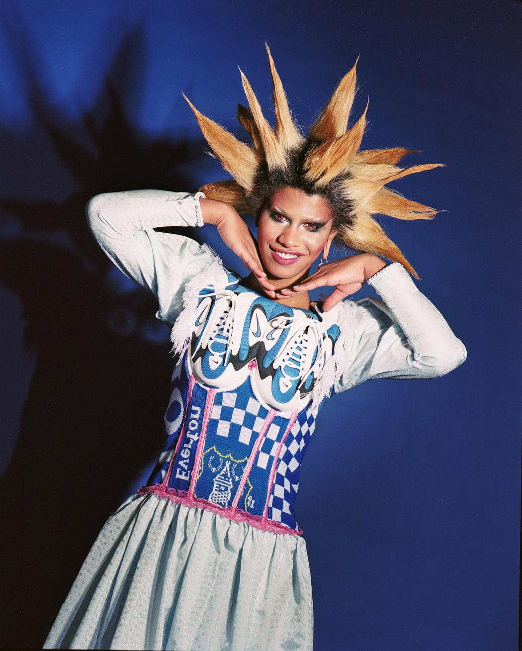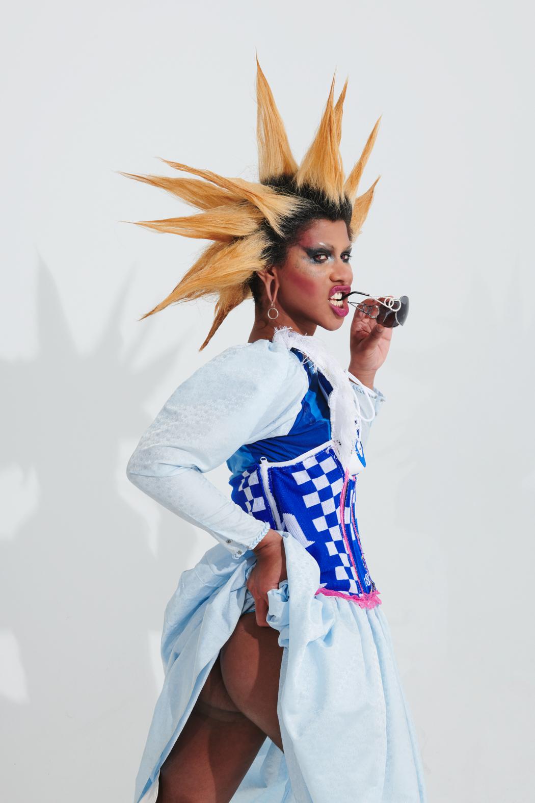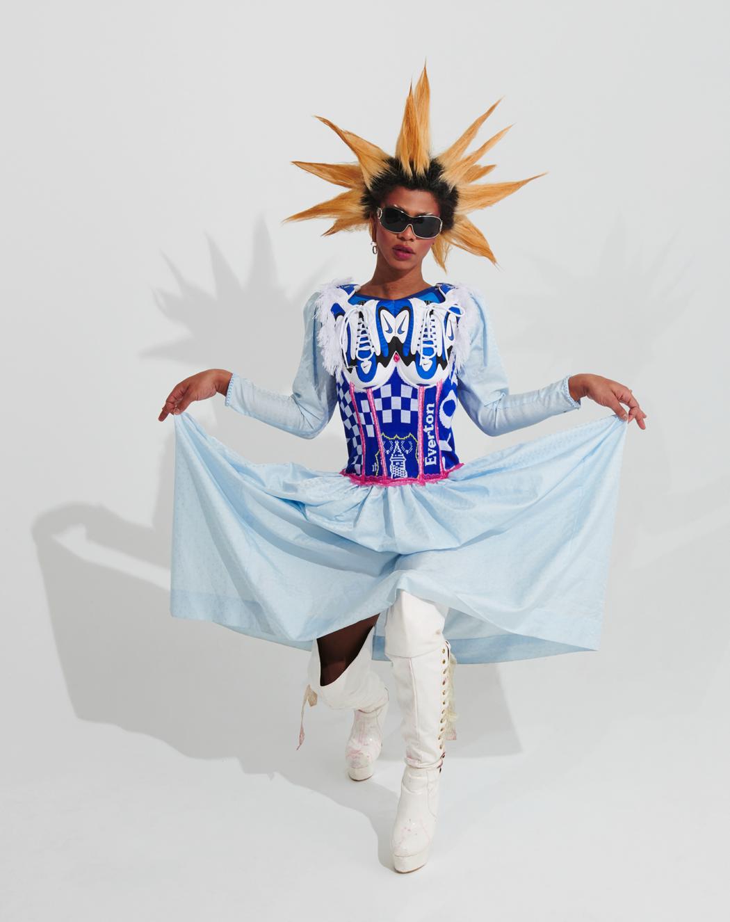 Upcycled designer pieces (all corsets, blue race dress, cowboy jumpsuit) by All Amin