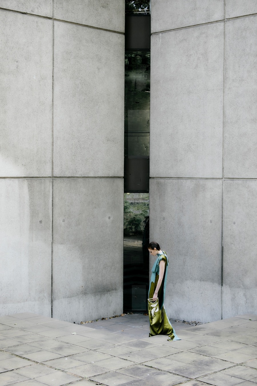 Cold, metallic hues reflect a realm of inner fortitude—an armour against vulnerability, a sanctuary of stillness. The series weaves the stark textures of London’s brutalist architecture with muted aquatic tones of the designs -of greys, blues, and greens, accented by tulip motifs and prints-. Feminine silhouettes stand boldly against masculine backdrops, encapsulating the delicate balance between fragility and power. Each piece whispers quiet defiance, a solitary stance against chaos, evoking an unapologetic presence. In this void, we find clarity. In solitude, we discover independent, powerful, feminine artistic souls.
