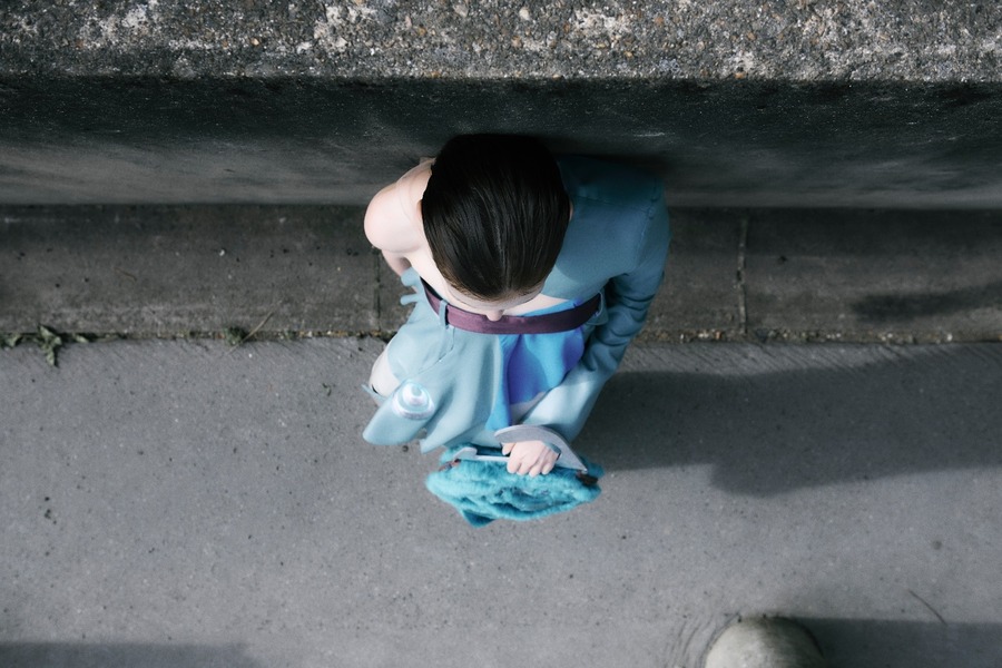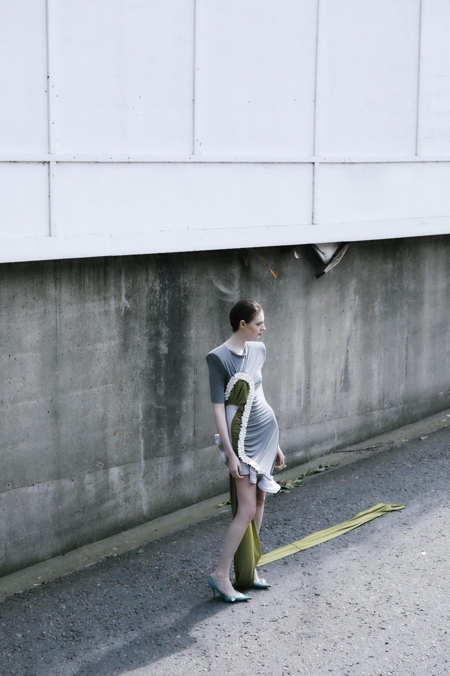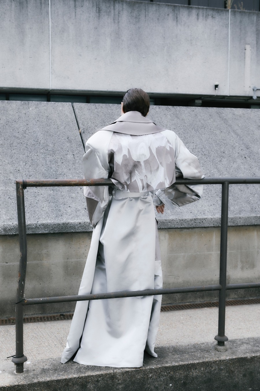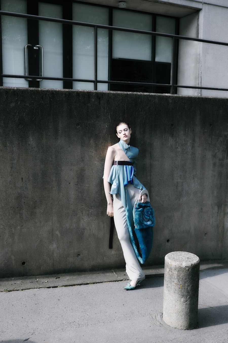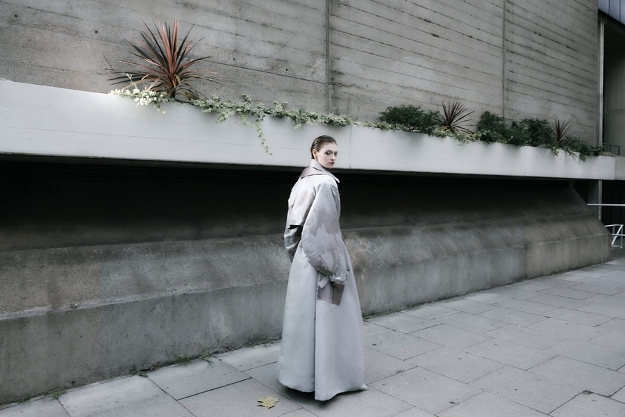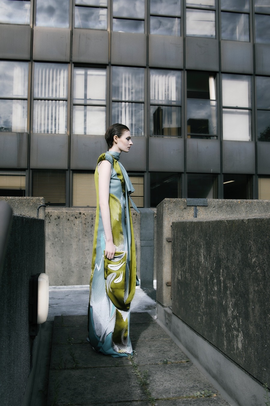 Cold, metallic hues reflect a realm of inner fortitude—an armour against vulnerability, a sanctuary of stillness. The series weaves the stark textures of London’s brutalist architecture with muted aquatic tones of the designs -of greys, blues, and greens, accented by tulip motifs and prints-. Feminine silhouettes stand boldly against masculine backdrops, encapsulating the delicate balance between fragility and power. Each piece whispers quiet defiance, a solitary stance against chaos, evoking an unapologetic presence. In this void, we find clarity. In solitude, we discover independent, powerful, feminine artistic souls.