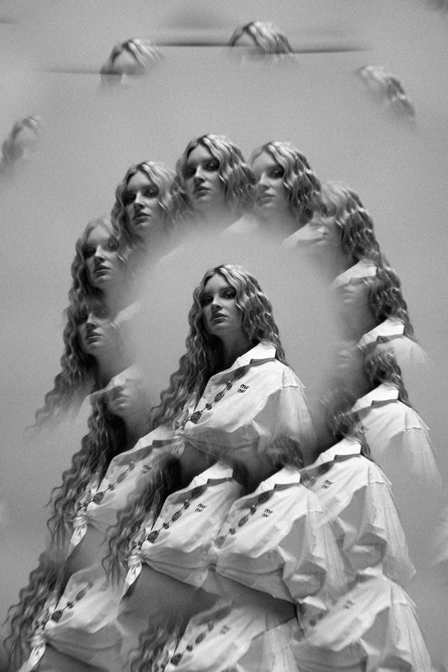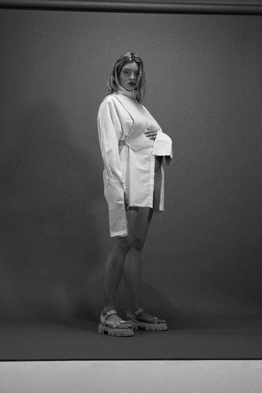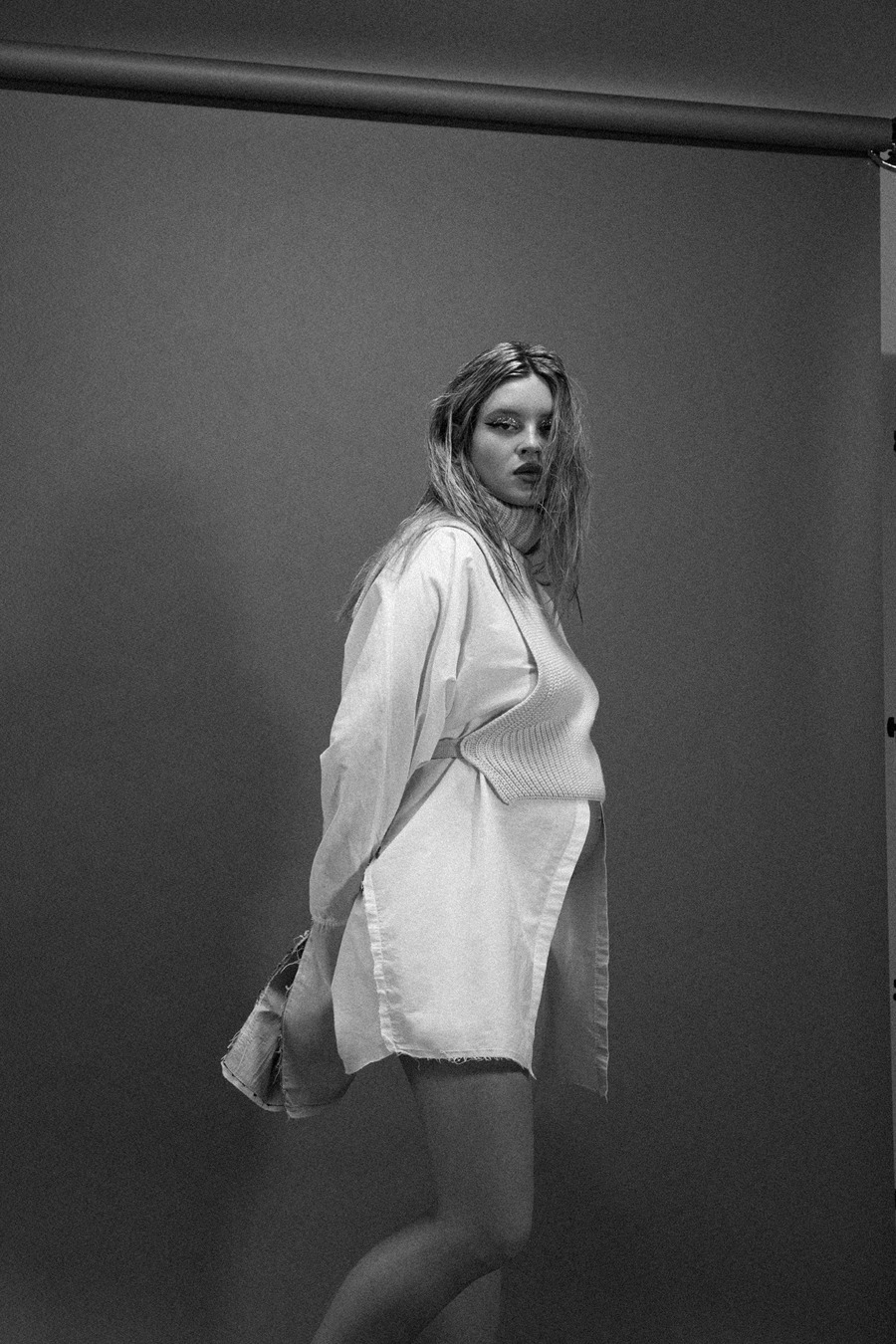A KALTBLUT exclusive. Photography by Bona Parisius. The model is Inga Reska signed by Louisa Models. Hair & Make Up by Fine Lilkendey. Styling by Nawid Qureischi using Miu Miu, G-Star Raw, Bottega Veneta, Jean Paul Gaultier, Marie Louwes, Vetements, Maison Margiela, Steve Madden, Baum und Pferdgarten, Guovarde, Buffalo, Marvin Thäte, and Studio NoID.
