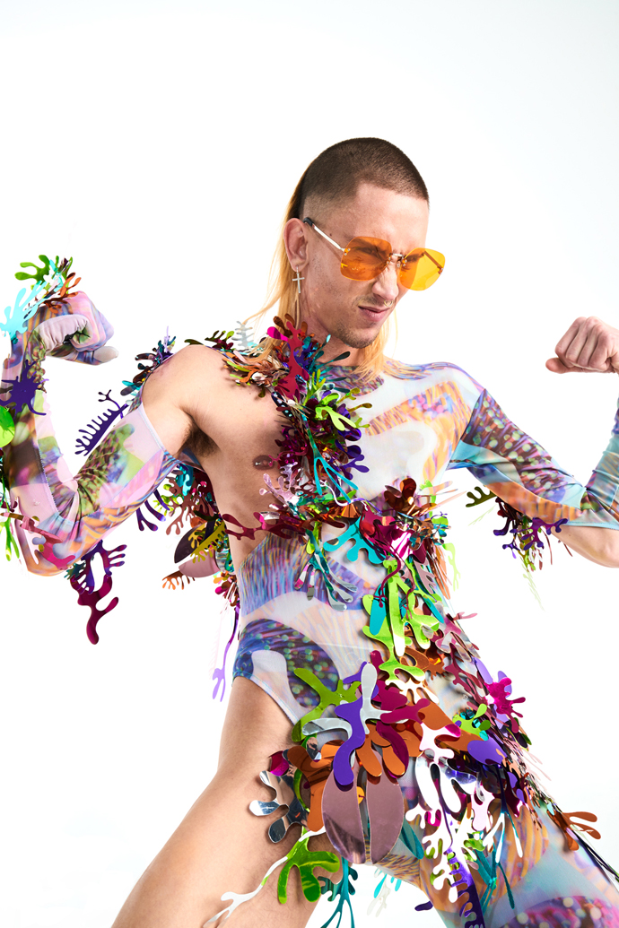 EWOL bodysuit with foil applique. Models own sunglasses and earring.