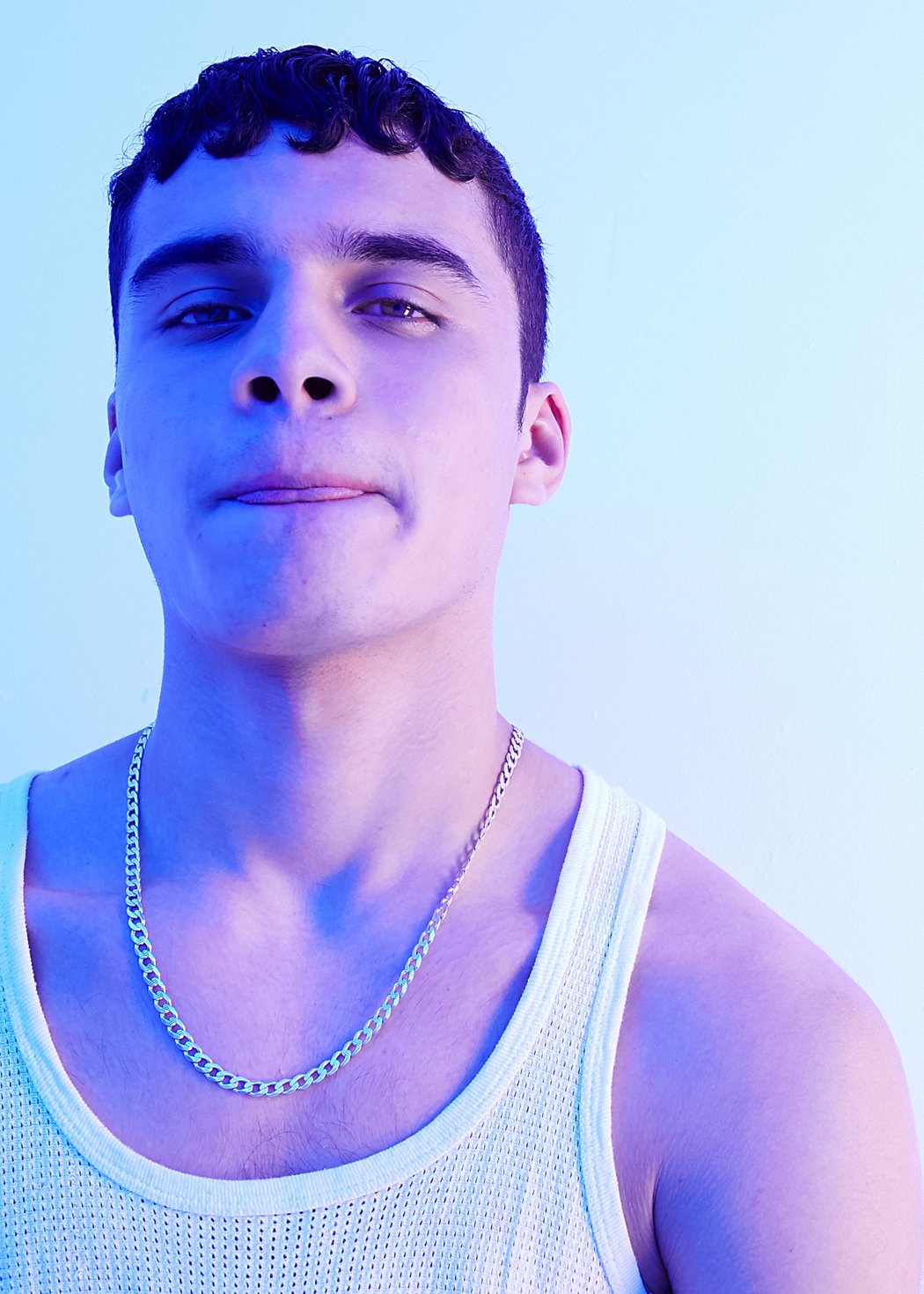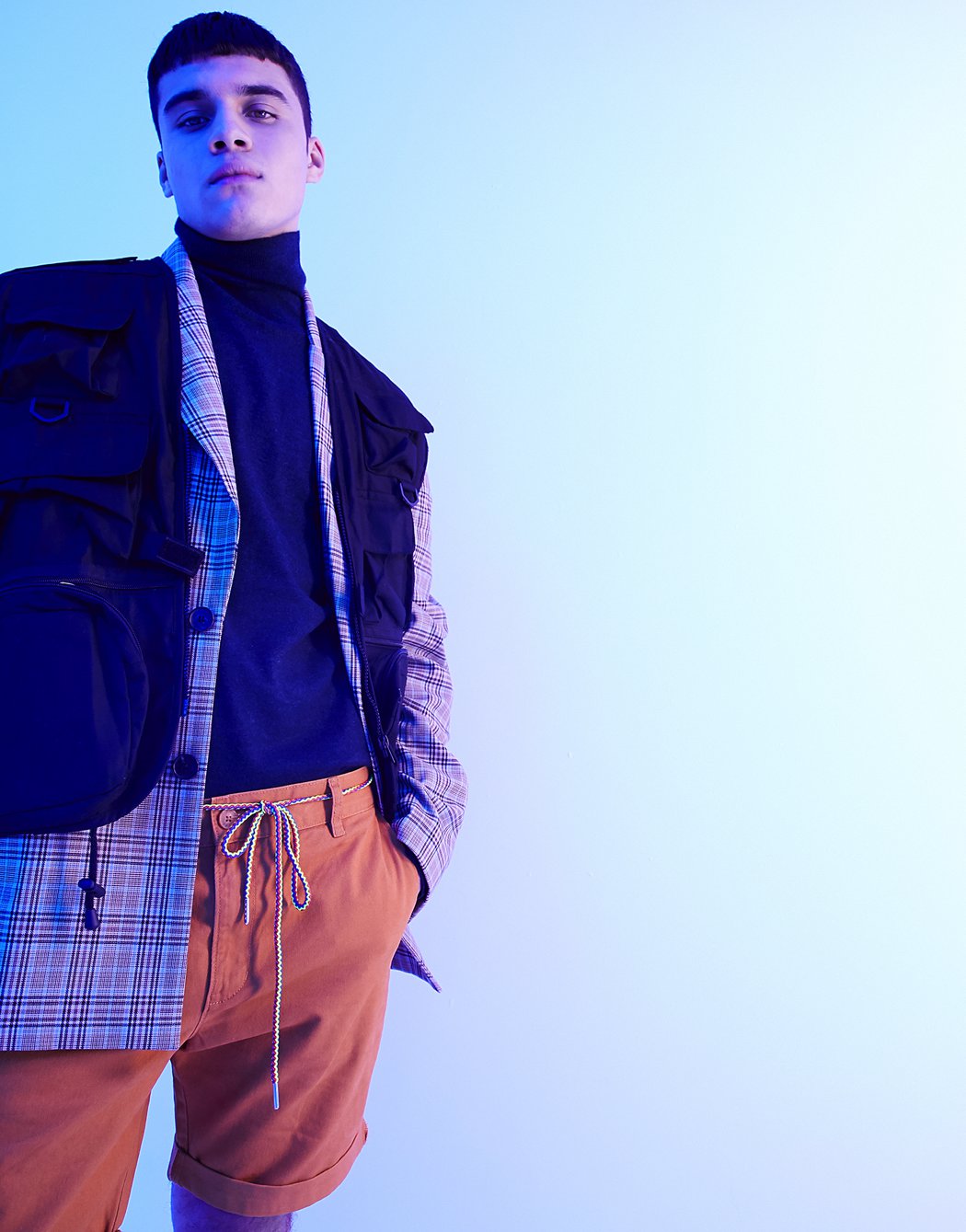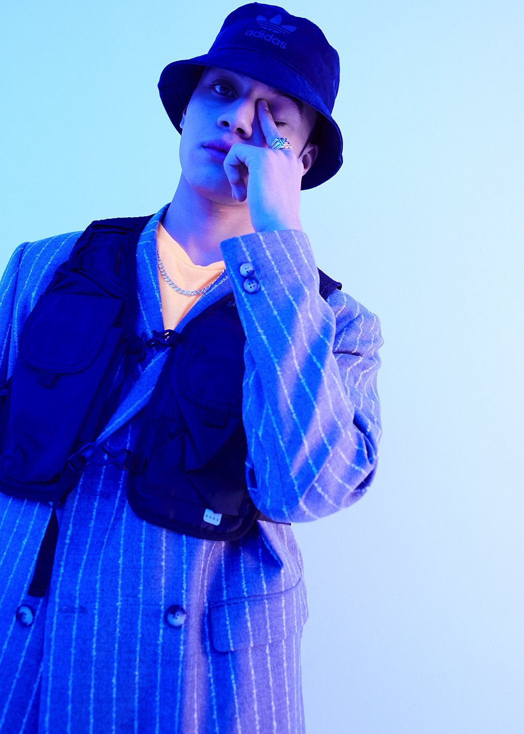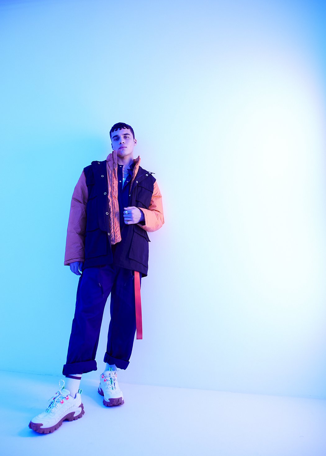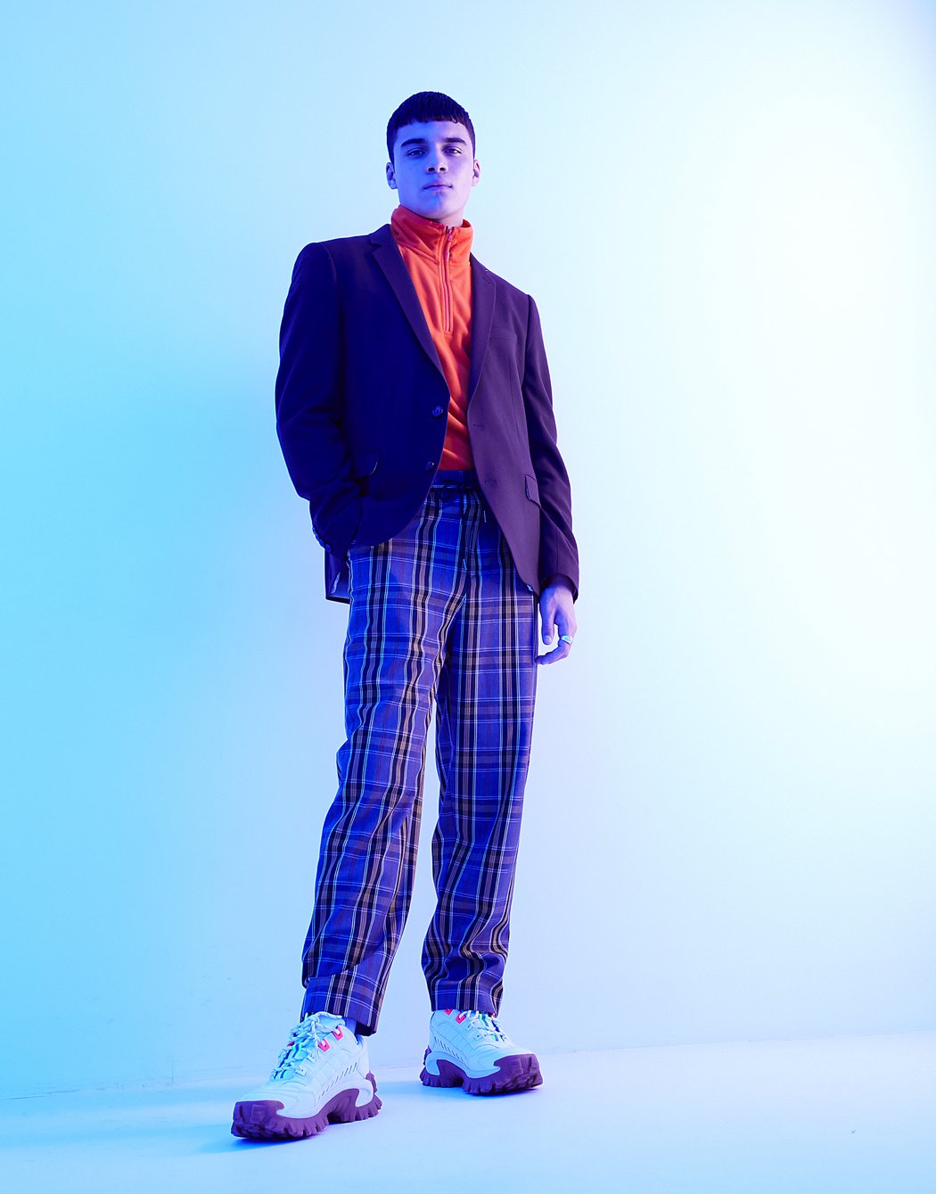 “We tried to create the feeling of a sunrise in this story. Watching the sun come up can make you feel very grounded and connected to the earth. The blue lights were brought in to compliment the flecks of orange running through the styling and to emulate the colours of a sunrise. This sunrise is the kind that seeps through the crack of the curtains at a house party or the one that happens after the rave, on the walk home. Juan was street casted and doesn’t have an agency yet.”